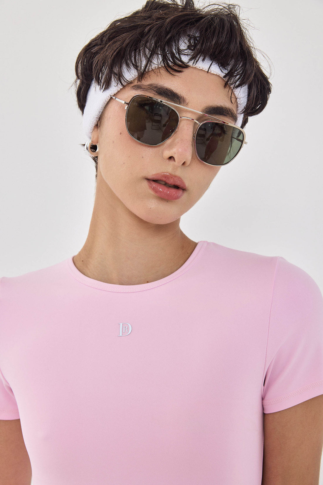 Introducing the newest addition to our best-selling active collection. Baby Tee. Short sleeves. Slightly cropped silhouette. Second skin-fit and feel made from a stretchy fabric that lifts and sculpts your body. Flat lock stitches. Sweat absorbent fabric. Reflector logo on the front. Complete the set with your favorite matching color active bottom, our headband, aviator sunnies and the must have canvas carry all.