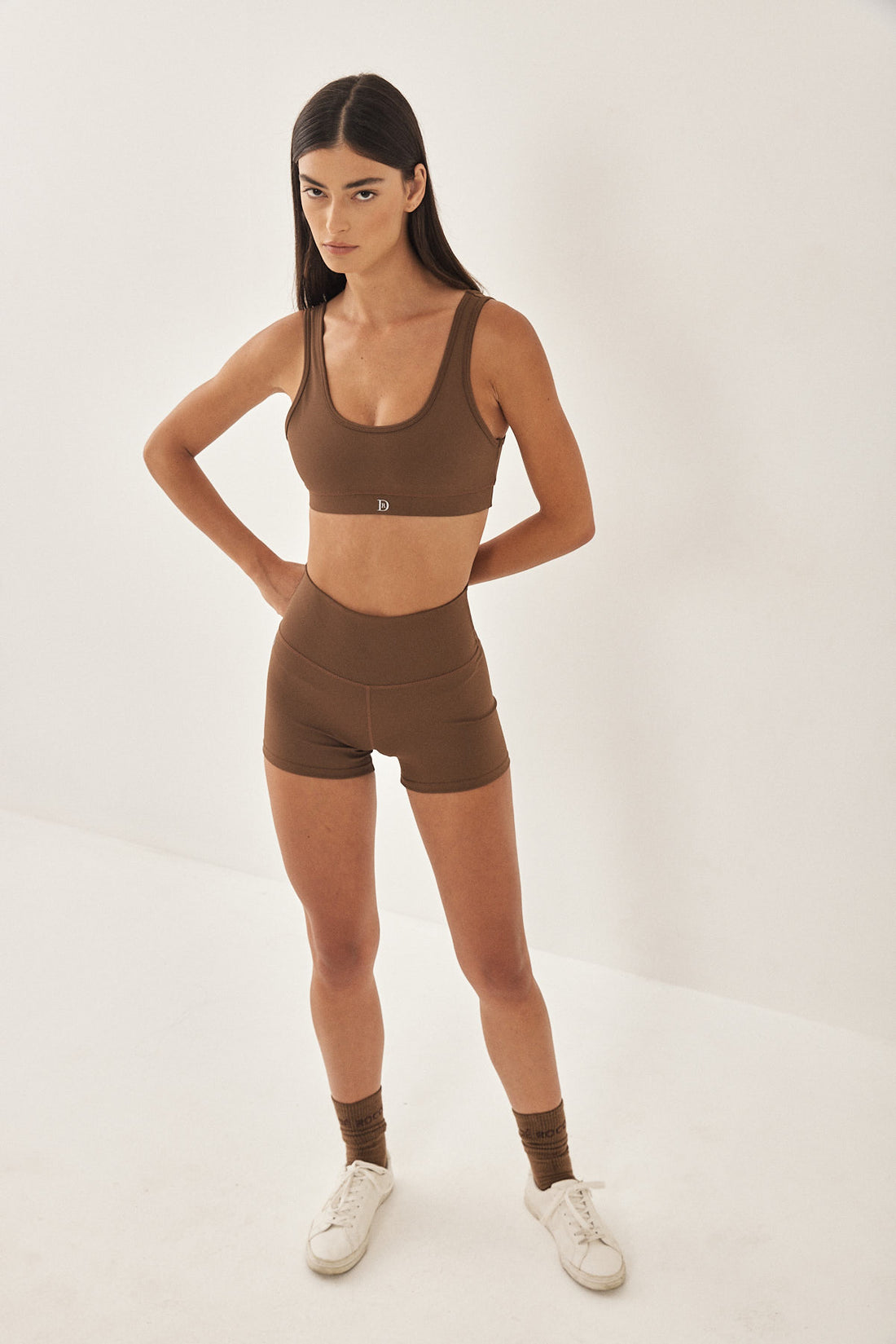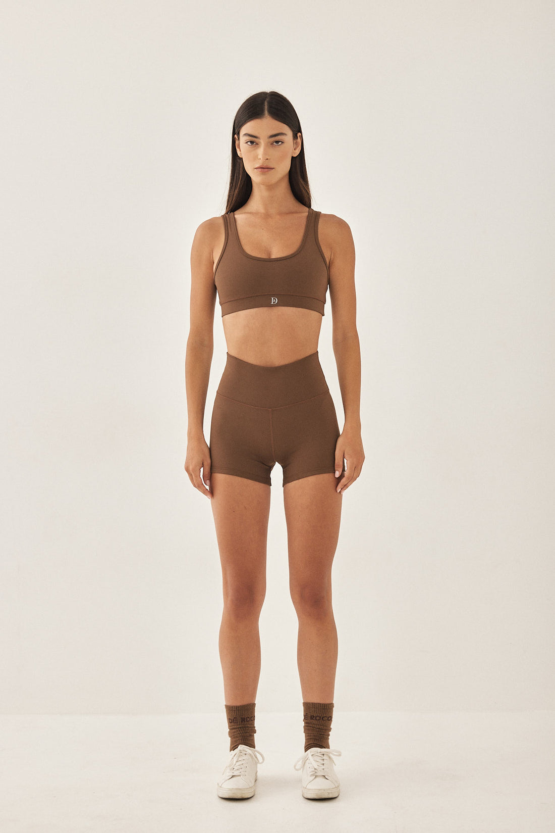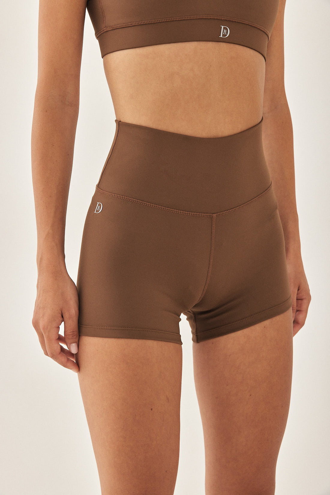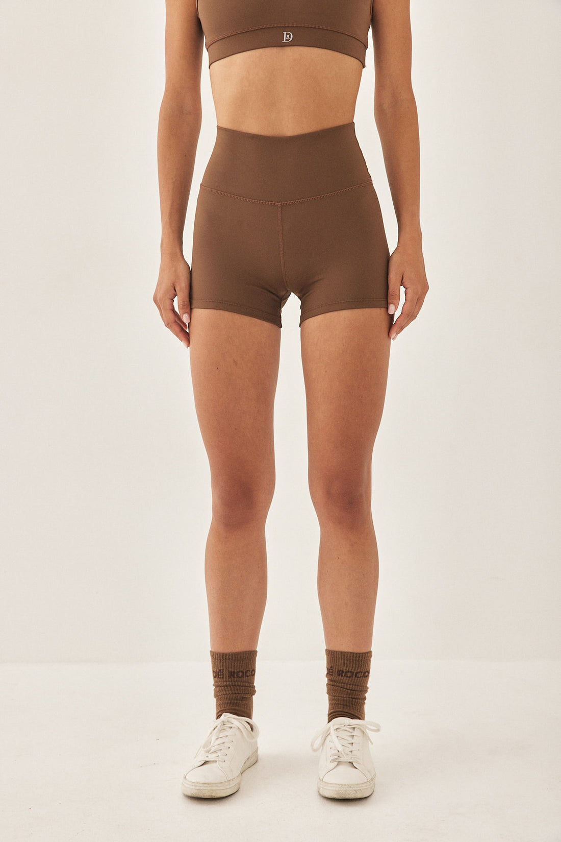 Dé shorts have a second-skin fit and feel. Made from a stretchy and smooth fabric that lifts and sculpts your body in the most flattering way. High waisted. Our shortest length active bottom. Features flat lock stitches and a sweat absorbent lining at the crotch area. Reflector logo on the side and a fitness club signature logo at the back. Style it with a matching color top and the classic chino cap for the most perfect sporty look.