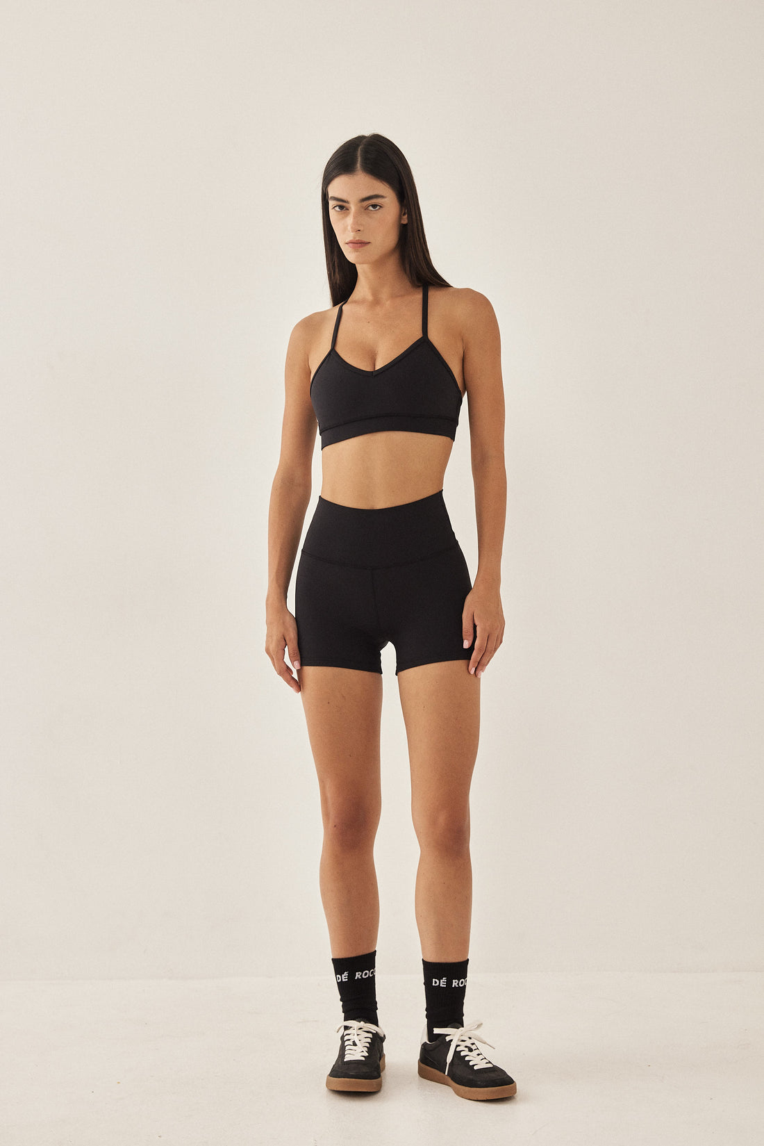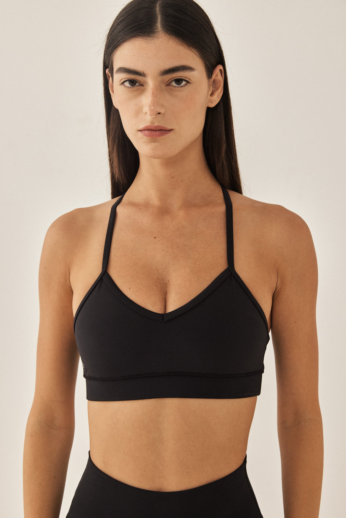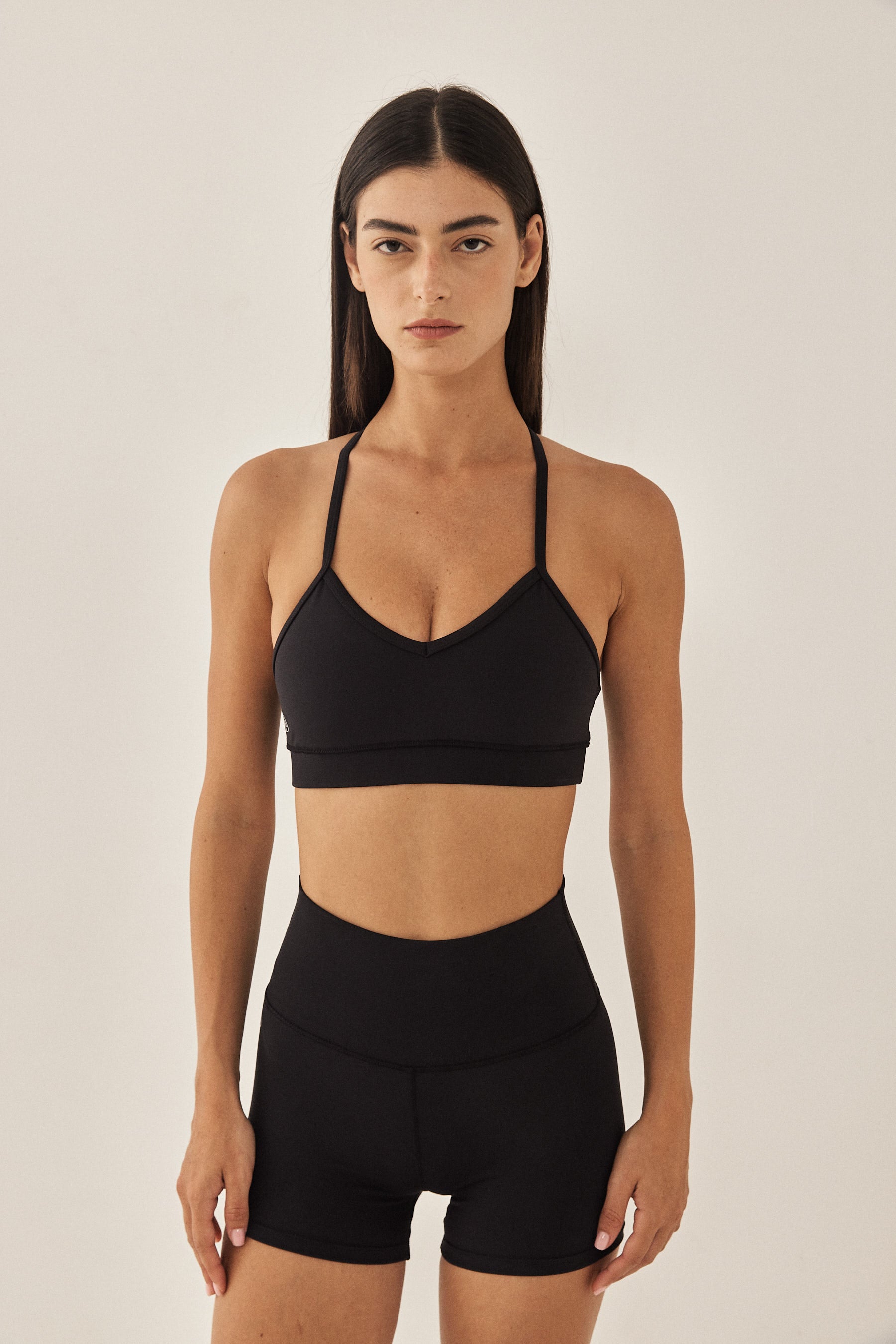 Dé strapped back bra has a second-skin fit and feel, made from a stretchy supportive fabric. Features a V neckline with thin straps at the front and one at the back.Flat lock stitches and an under bust waistband for support. Reflector logo on the side front and a fitnéss club signature at the back. Complete the set with one of our matching color fitnéss club bottom.