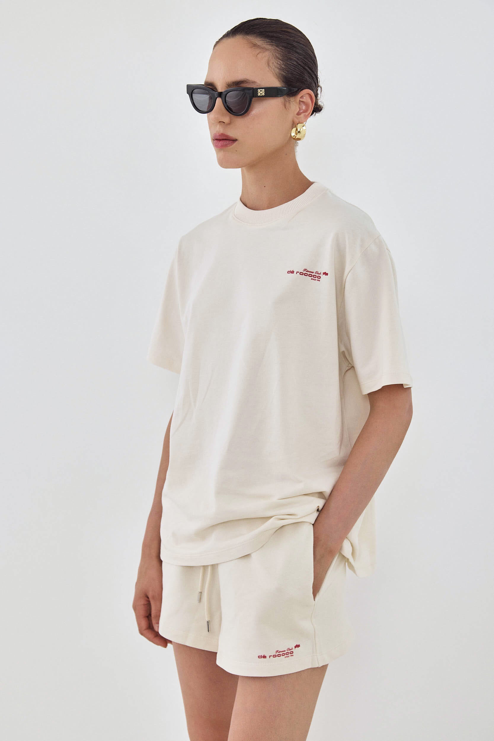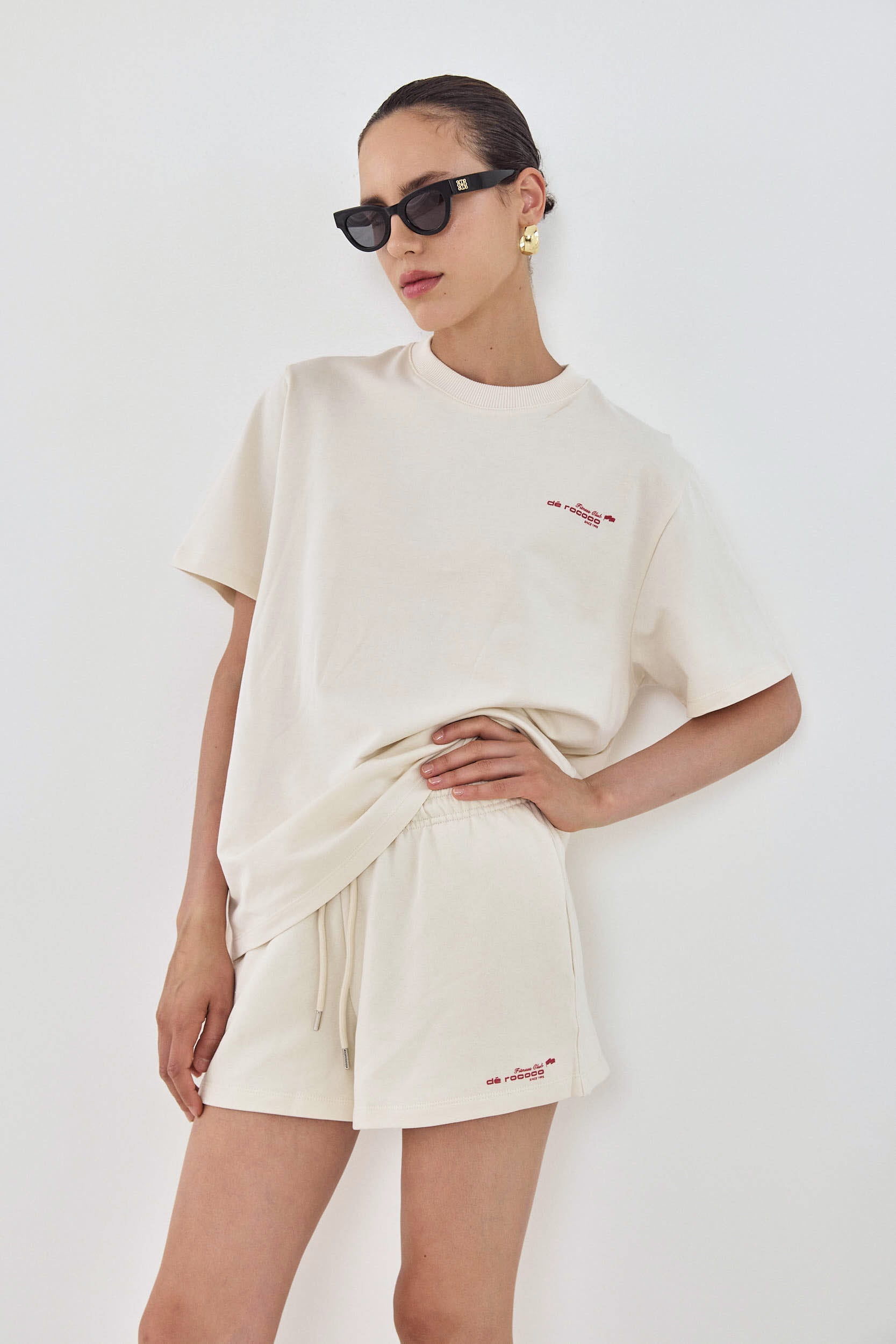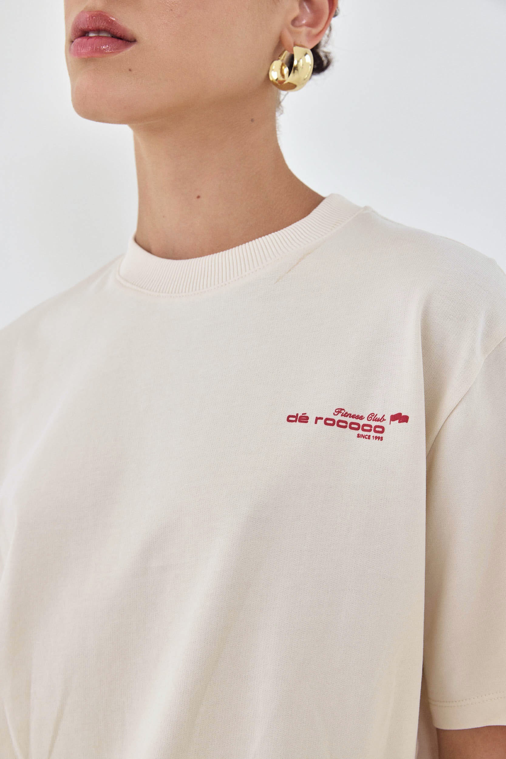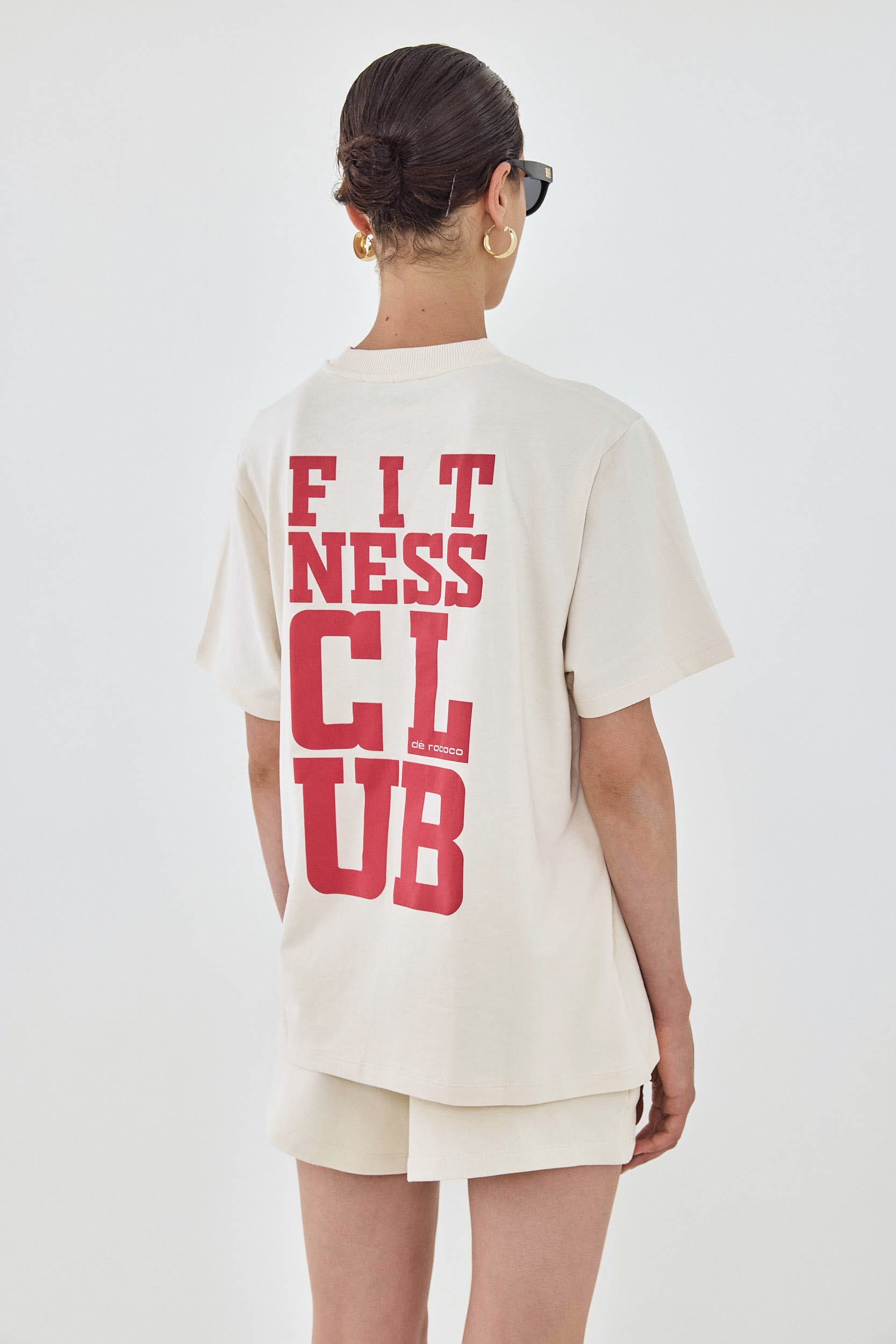 The perfect addition to your active wardrobe. T shirts in matching colors to the active sets, perfect for layering. Ribbed crew neckline. French terry. Contrasting rubber print with fitness club logo detailing on the front. Rubber print logo on the entire back. Oversized fit, sits loosely on the body. Style it with the matching active shorts to complete the set.