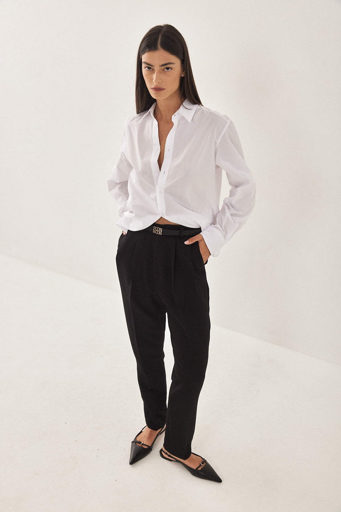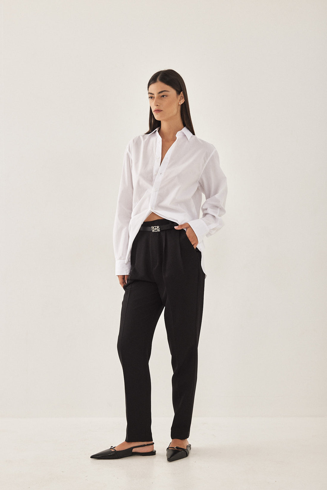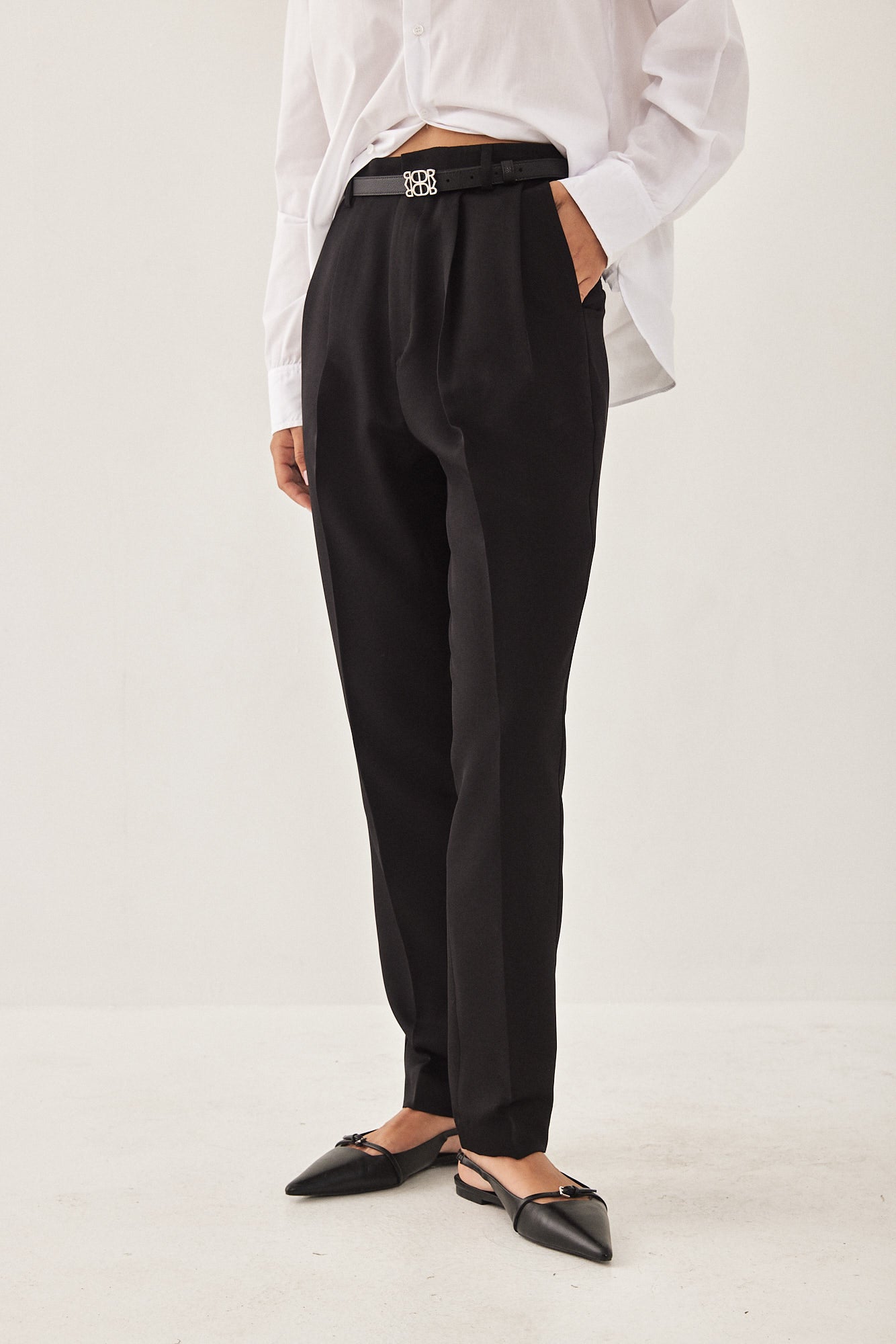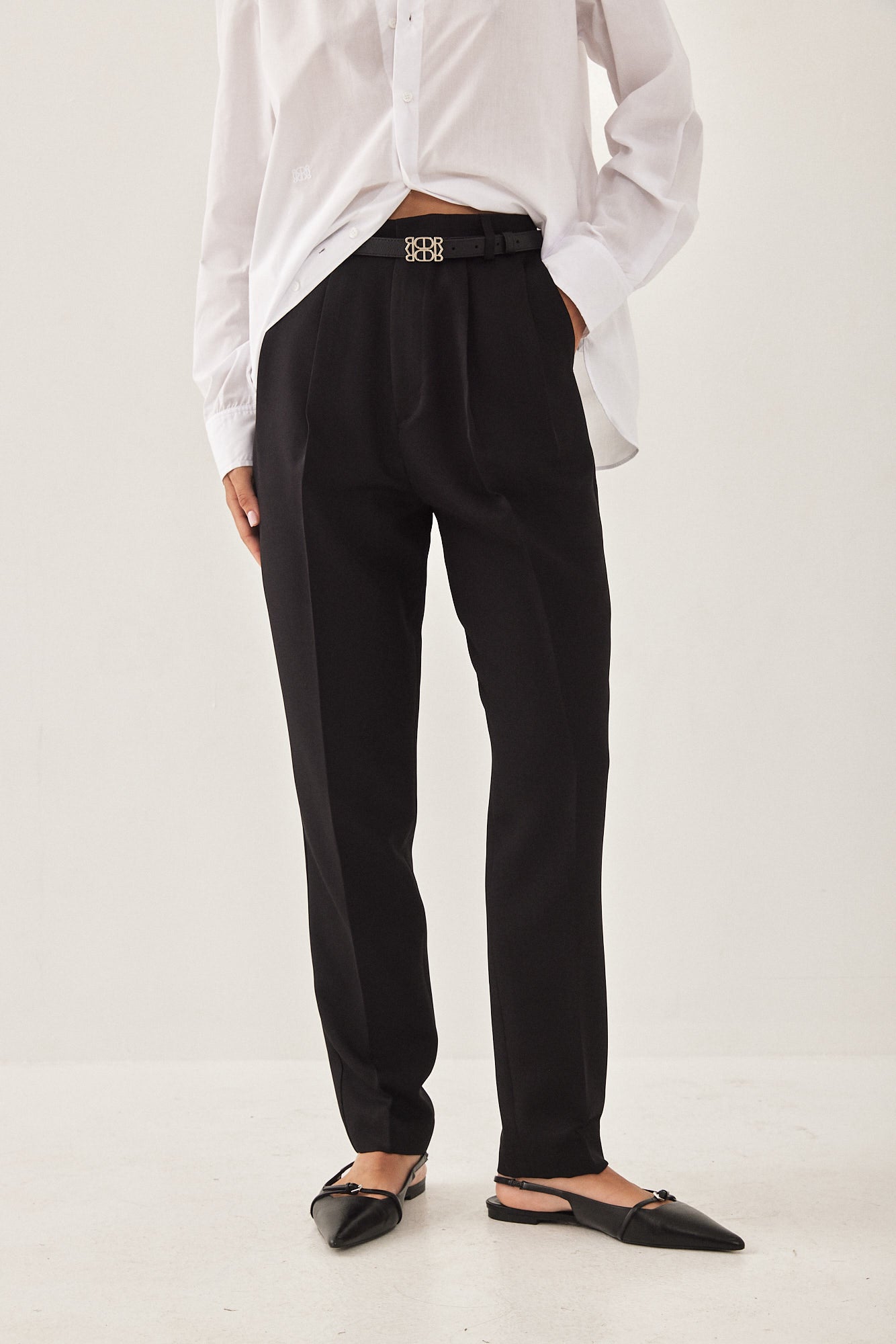 High waisted tailored pants with a delicate balloon shape that tapers slightly at the ankle. Non-stretch lightweight woven fabric. Featuring belt loops, side pockets. Full length. Front zipper closure. Embroidered logo at the back. Complete the look with a basic tank top and the matching daddy blazer.