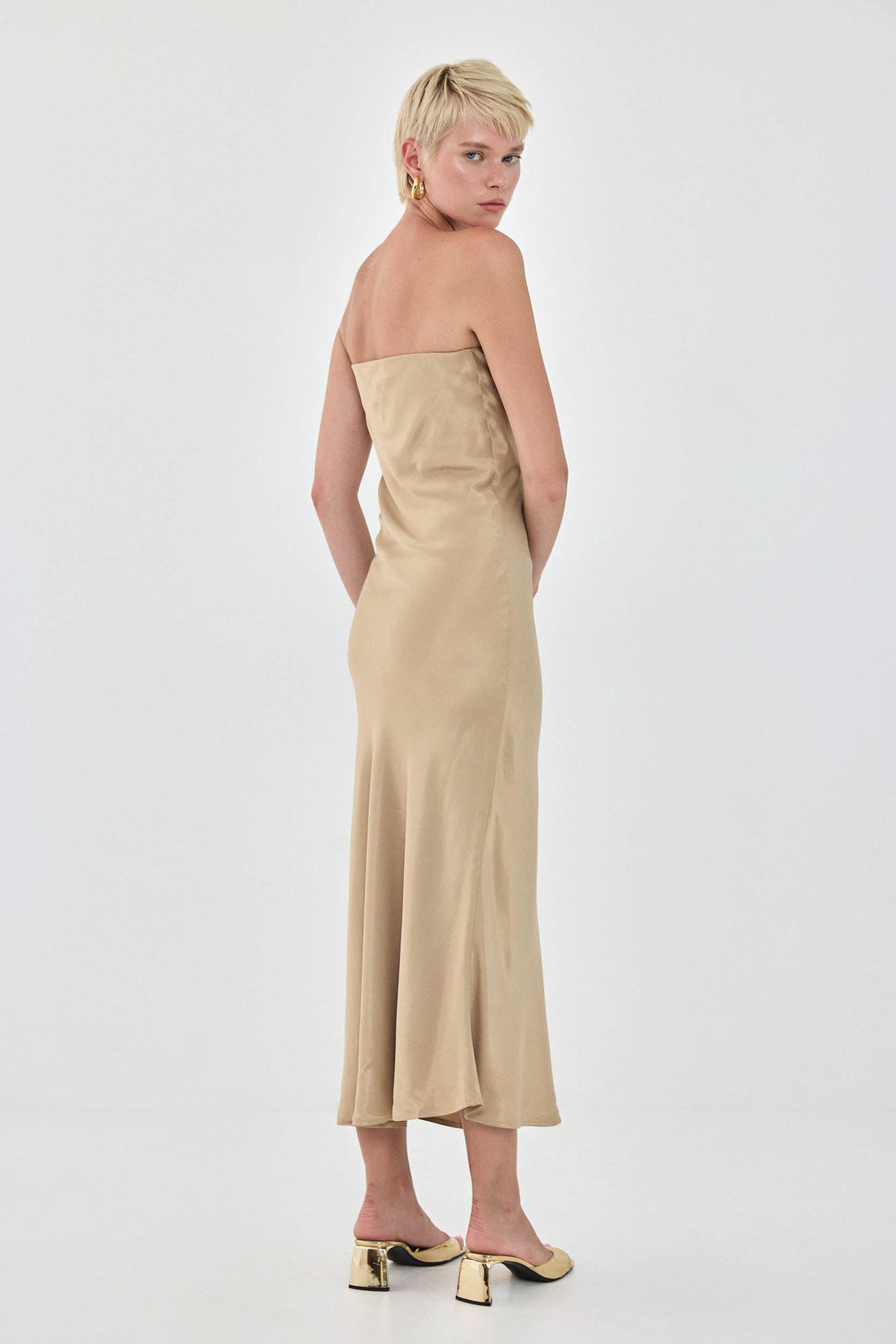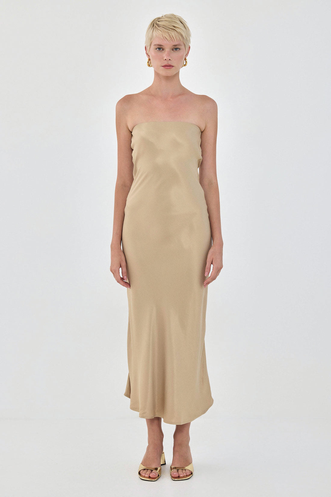 The dress of your dreams - this is the ultimate strapless summer dress. Features a relaxed body hugging fit. Cut in a special bias cut technique so that the materials falls smoothly and moves with your body. Style it with a pair of kitten heels and a shoulder bag for the perfect going out look.