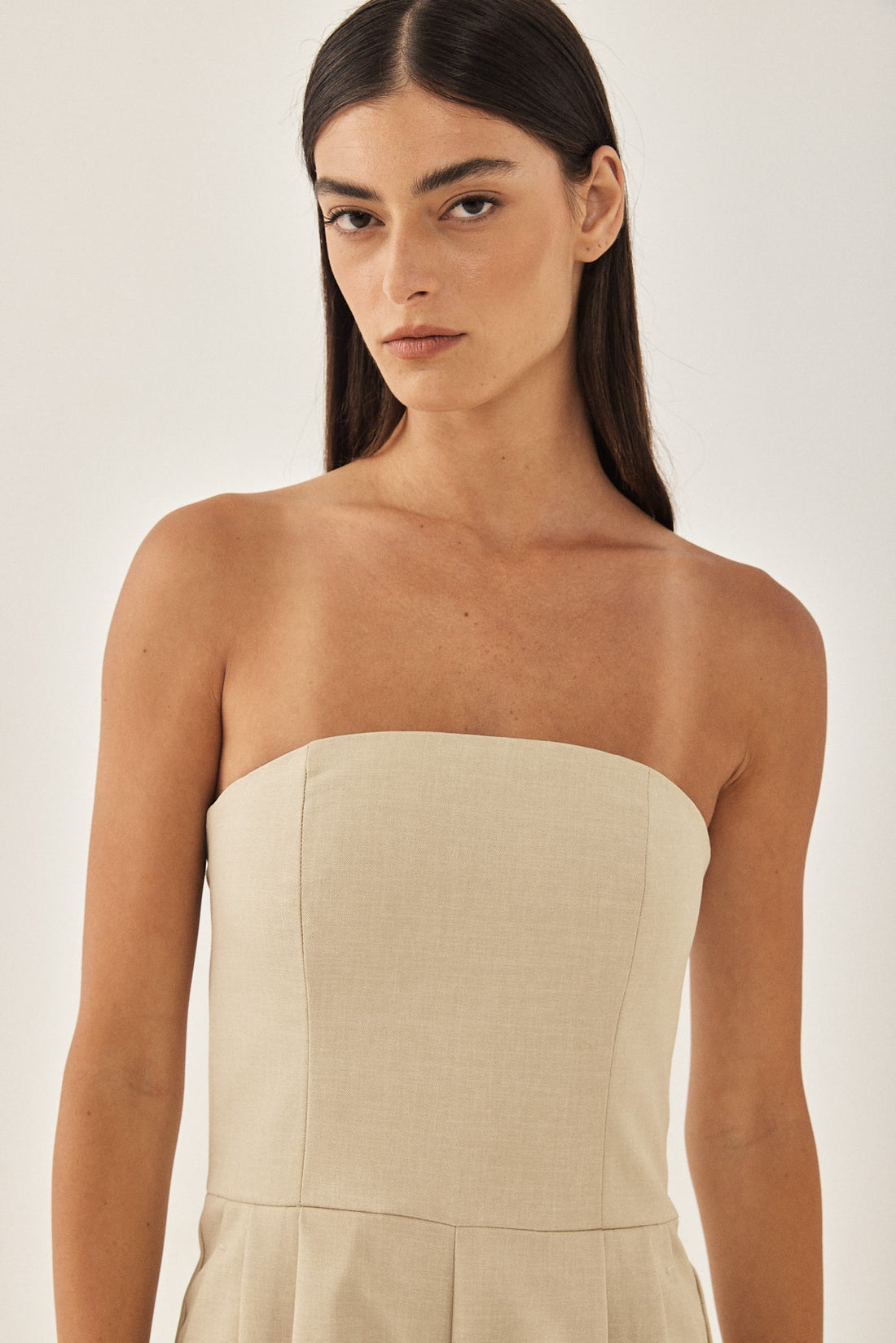 The ultimate strapless tailored jumpsuit. Featuring a straight neckline with a silicone strap for a better grip. Hidden zip closure. Embroidered logo at the back. The most flattering silhouette, simply slip it on and you are ready to go. Style it with delicate slides and some accessories for a perfect day to night look.