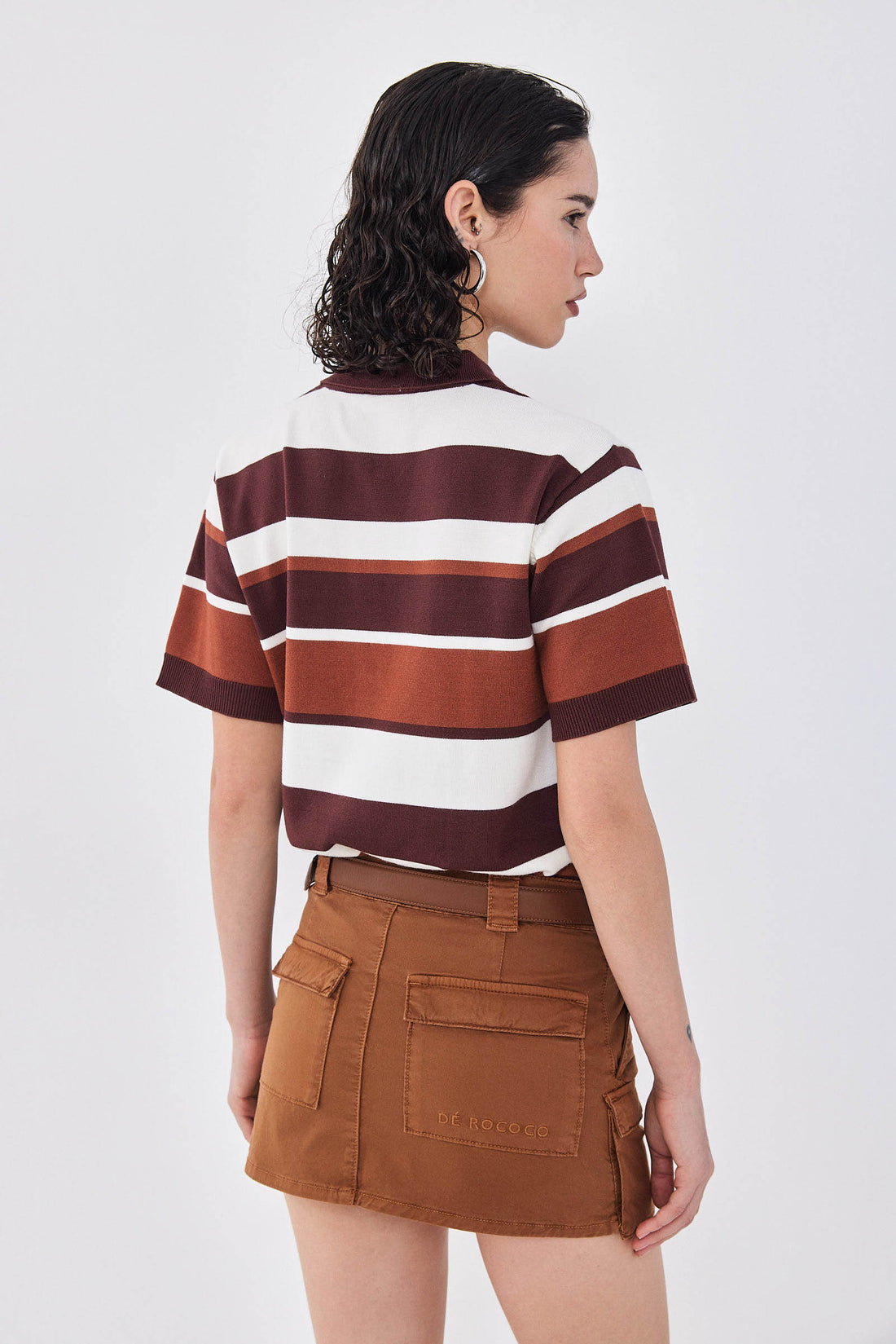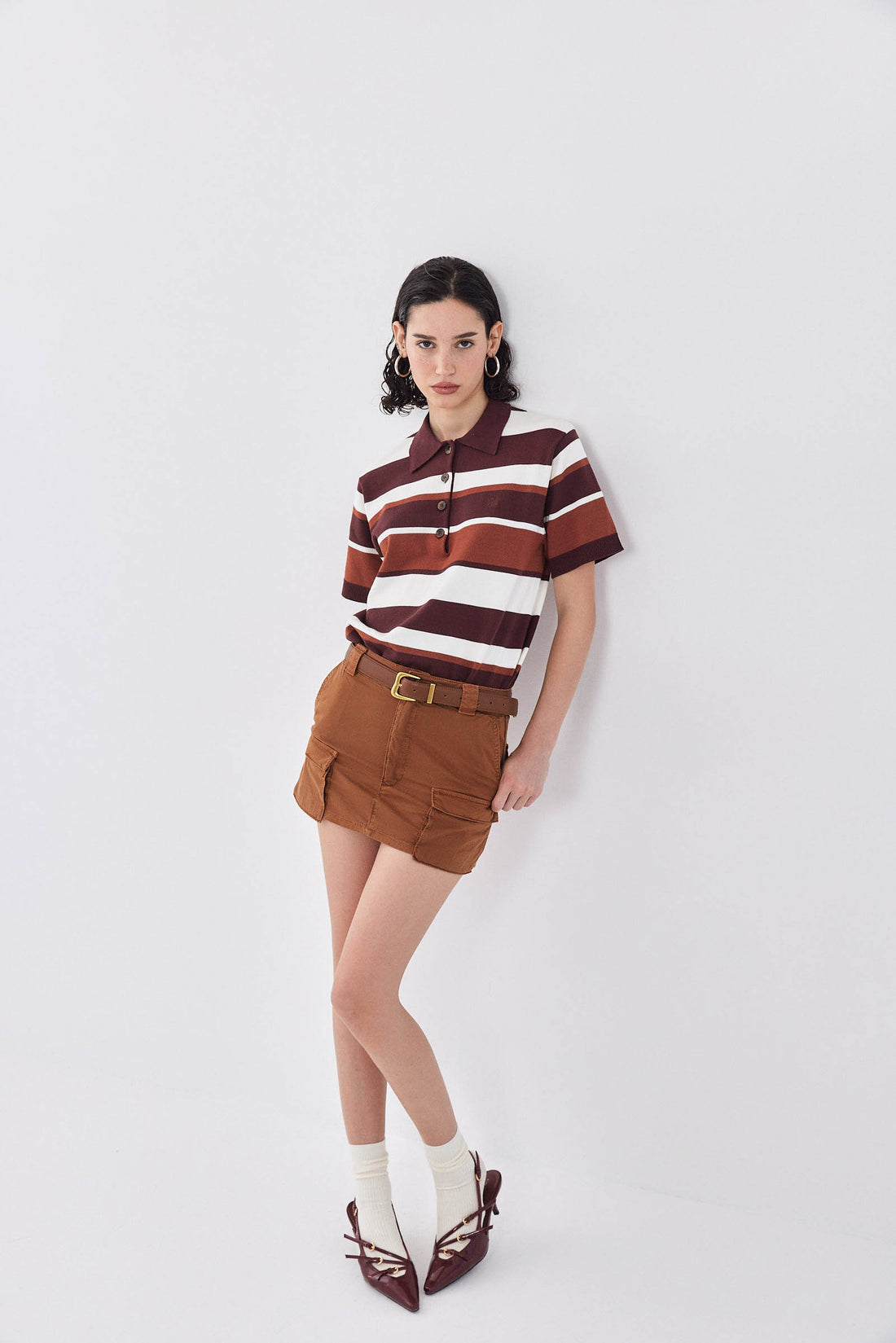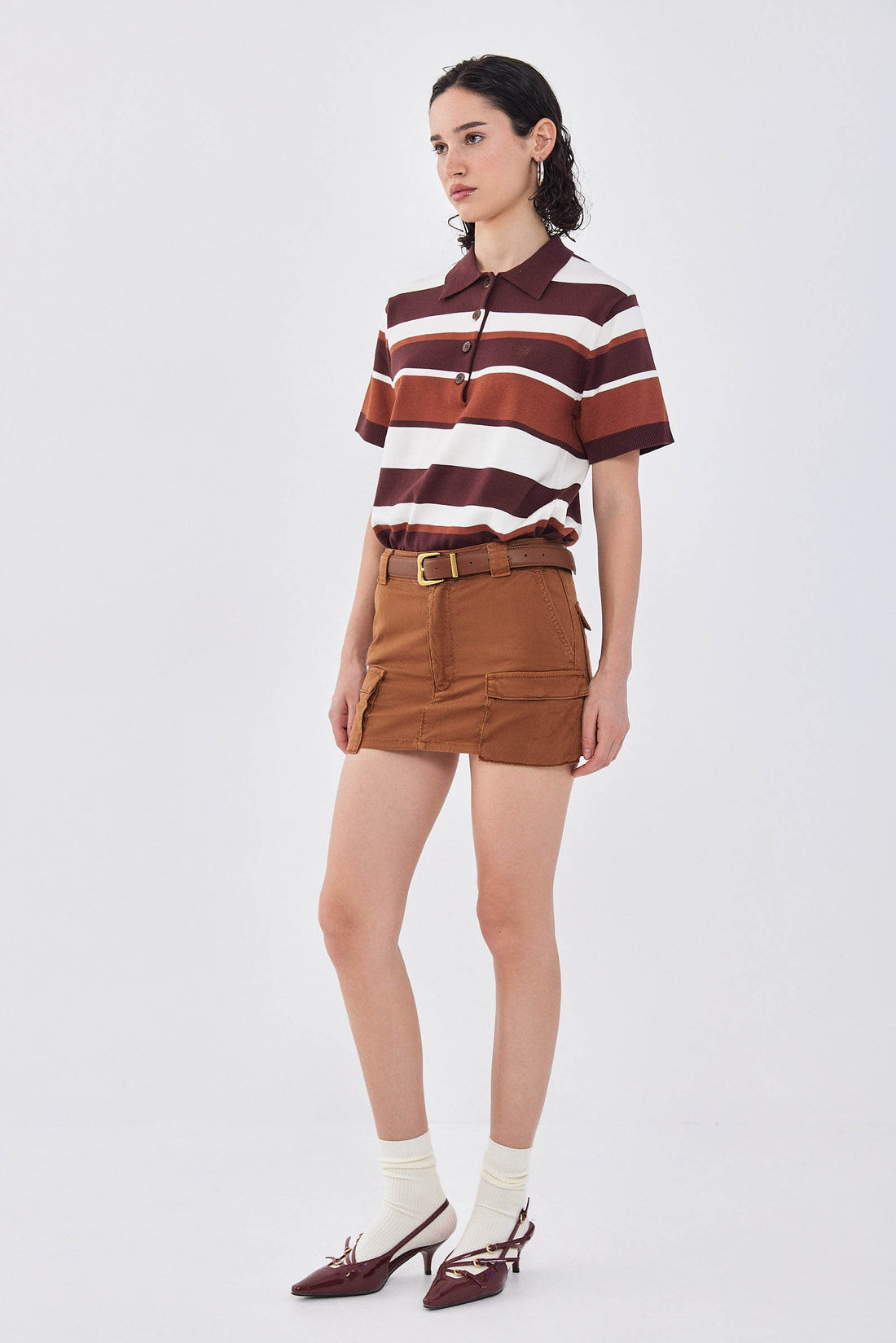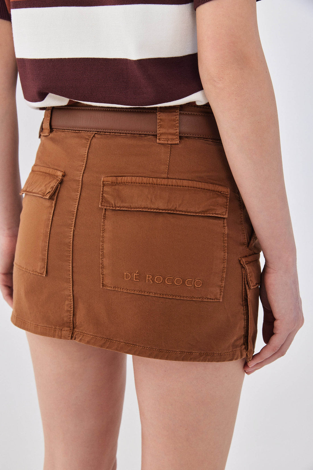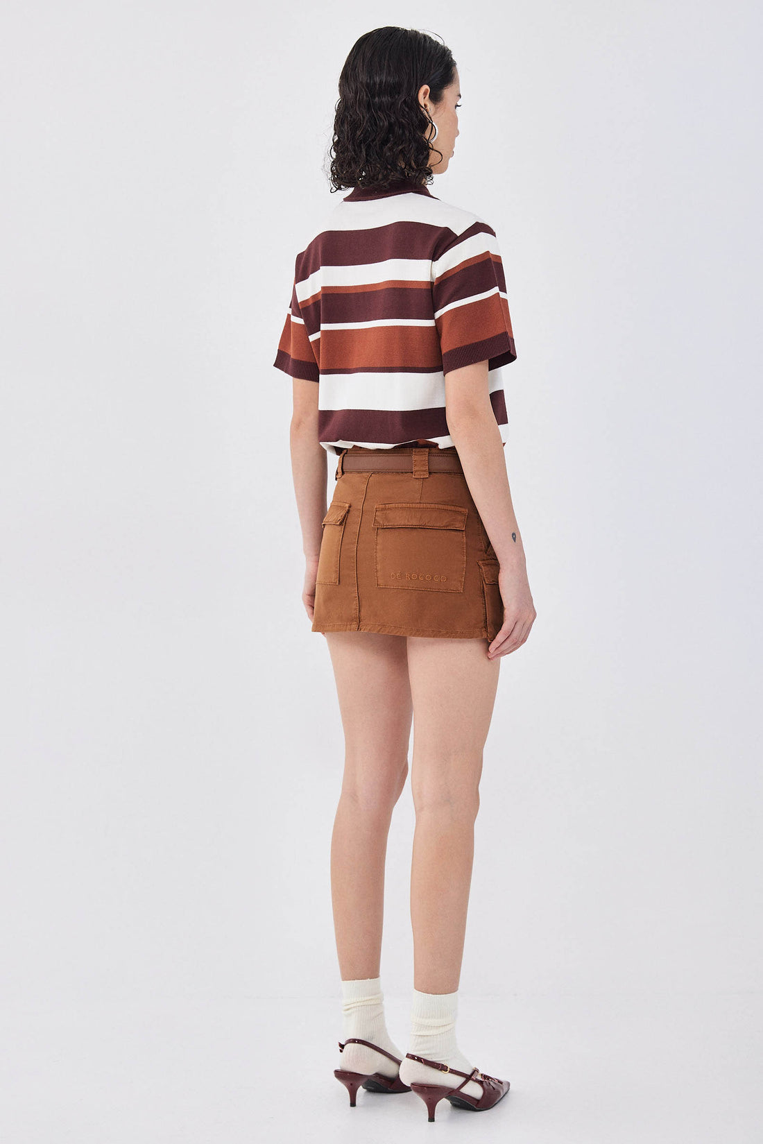 Our new Mid Waist Cargo Mini skirt was made to upgrade every classy look this fall. Two oversized cargo pockets on the side. Wide belt loops. Front zipper and metal hook closure. Tonal embroidered logo on the back pocket. Done with a crisp yet elastic washed cotton fabric. Unlined. Style it with our short sleeved striped polo shirt, our leather wide buckle belt and our two breasted trench for a day to night look.