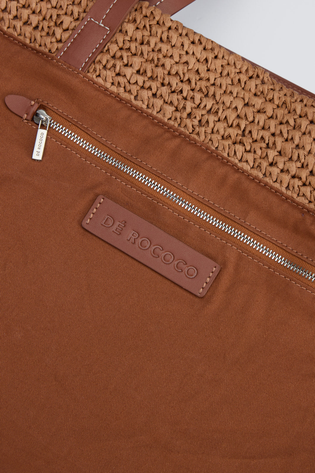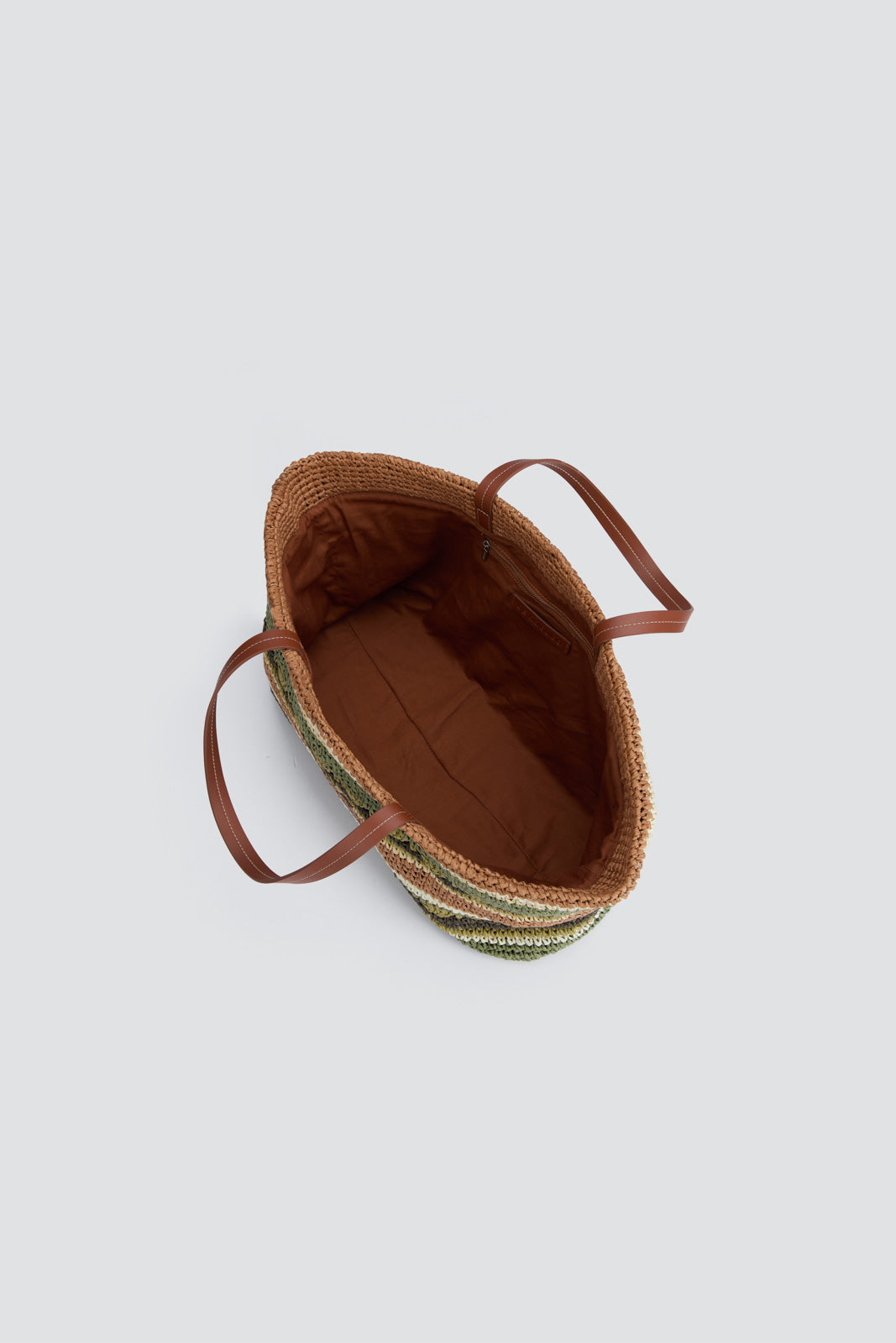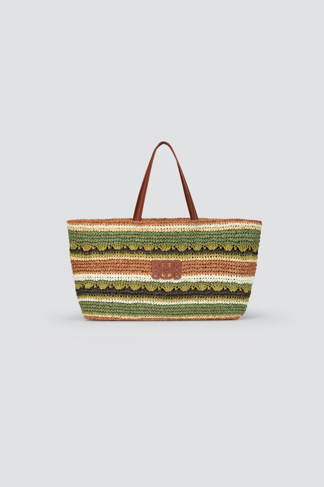 Introducing your new go-to summer bag. Spacious crochet tote bag. Soft, flexible structure. Double shoulder handles. Lined interior with small zip pocket. Delicate logo patch detail on the front. Featuring a breezy striped crochet texture. Style it with our crochet shorts and strapless top, our oval sunnies and finish this look with our beautiful crochet bucket hat.