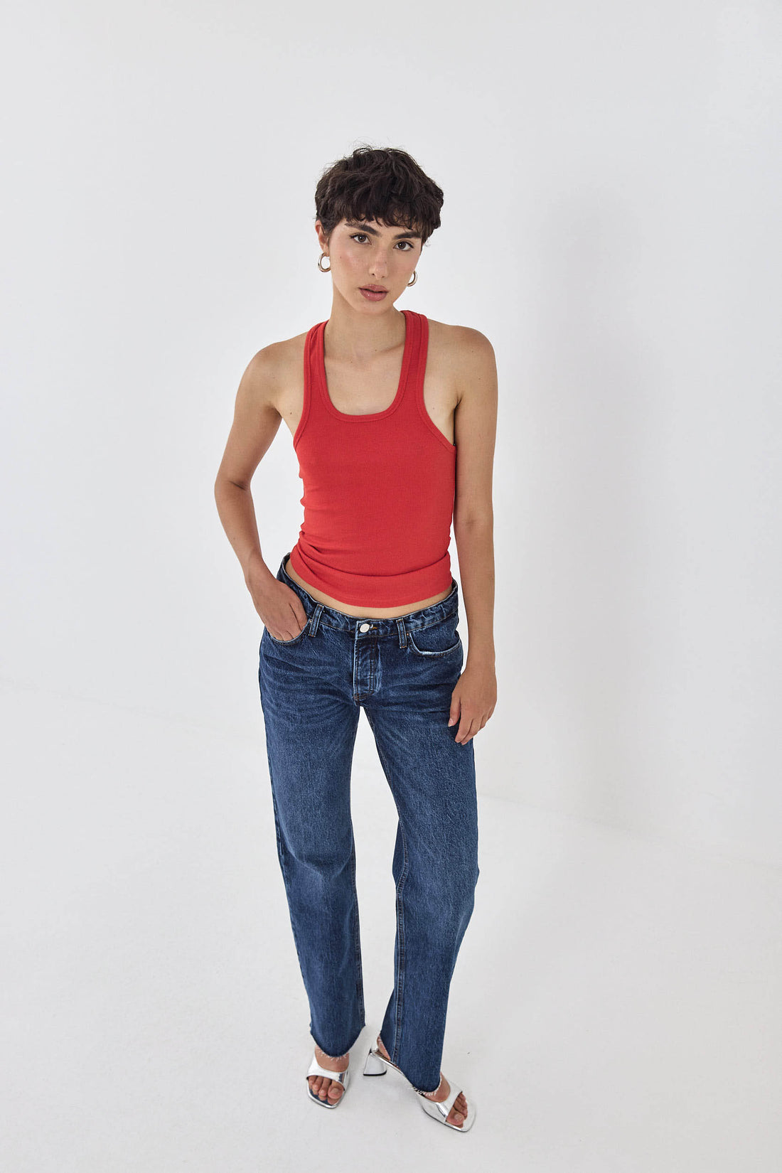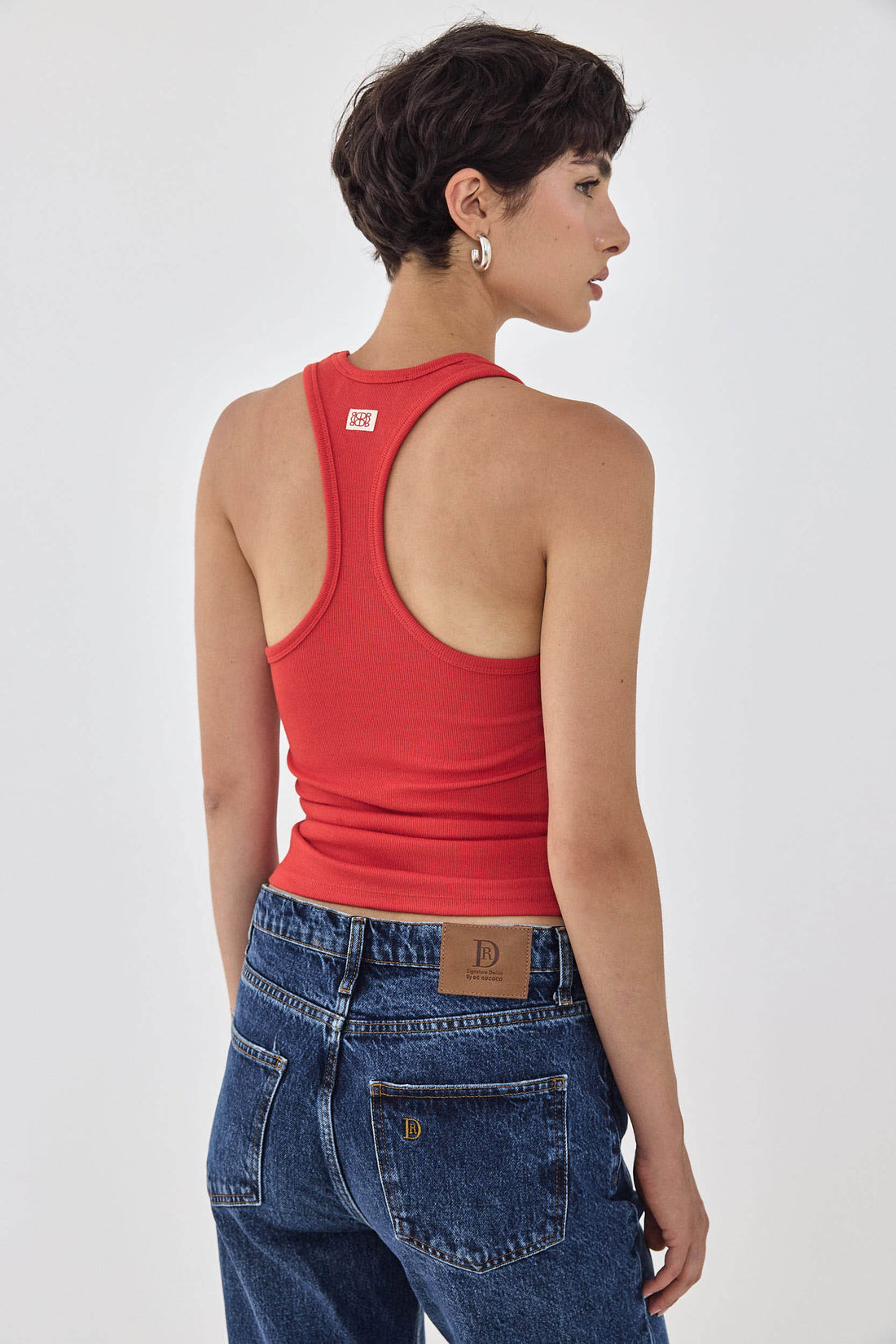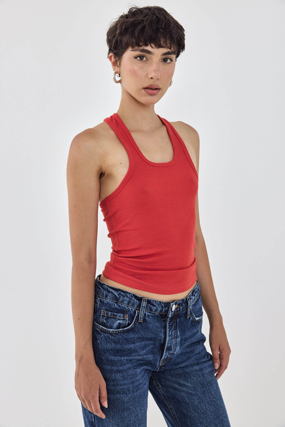 Deep scoop tank top. Racer back. Slightly squared neckline. Ribbed. Cotton woven label with logo detailing at the back. Delicate sheer. Ribbed finish. Ultra soft fabric you won't want to take off. Style it with your favorite oversized denim and a pair of kitten heels for an effortless 90's model-off-duty look.