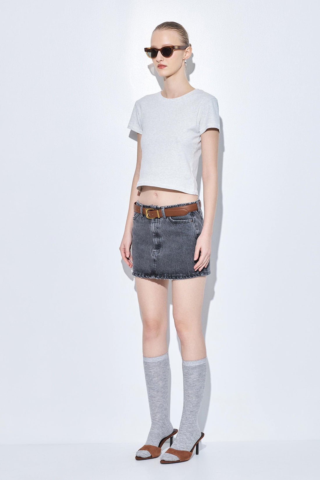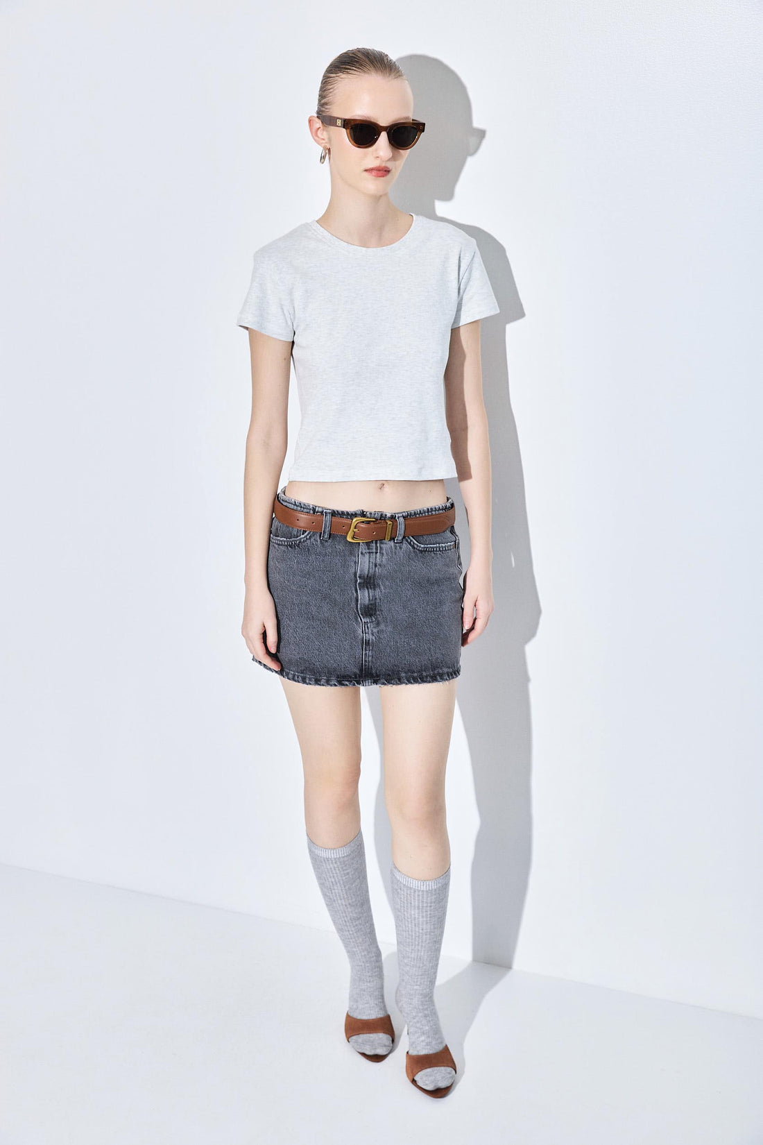 The perfect mid-rise denim micro mini skirt. Featuring two front pockets and two back pockets. Features belt loops and a frontal zipper closure. Clean cut waist. Style it with an oversized t shirt and a pair of slides for an effortlessly stylish everyday look.