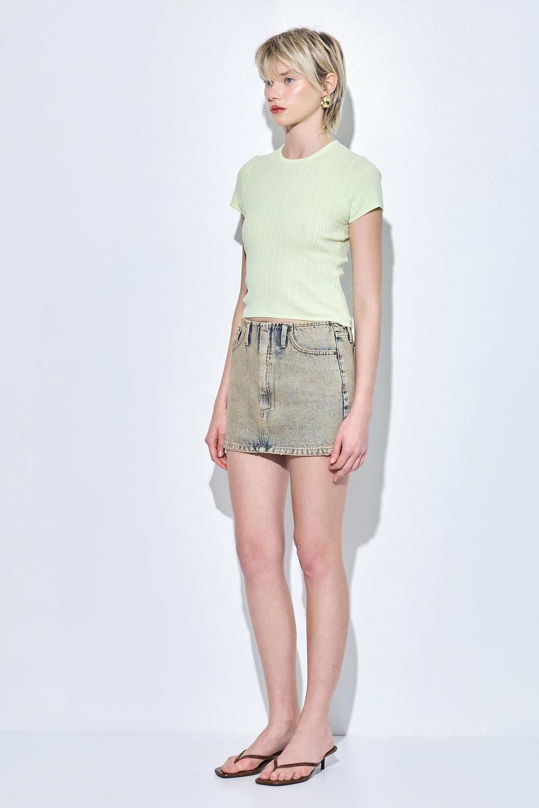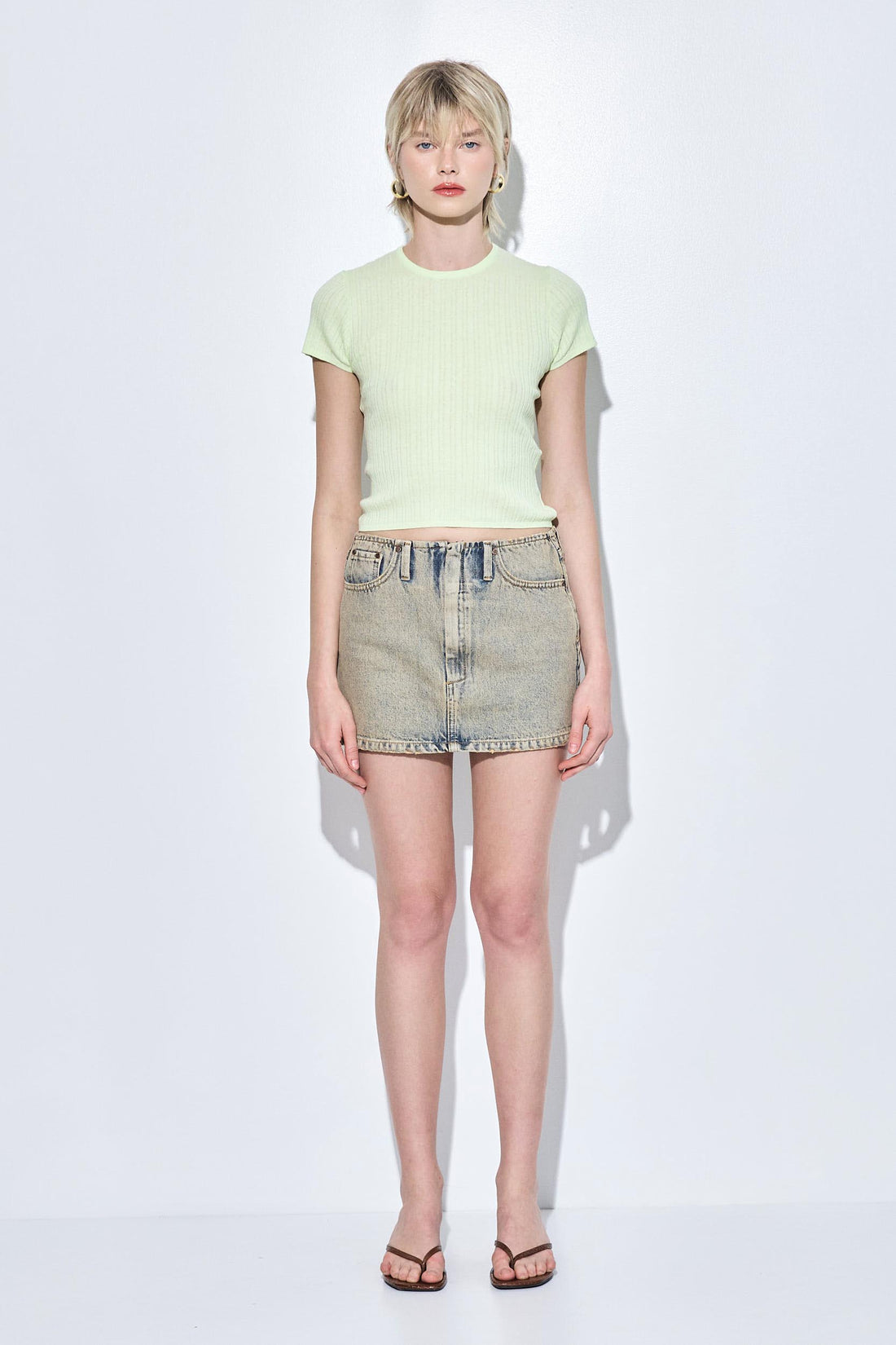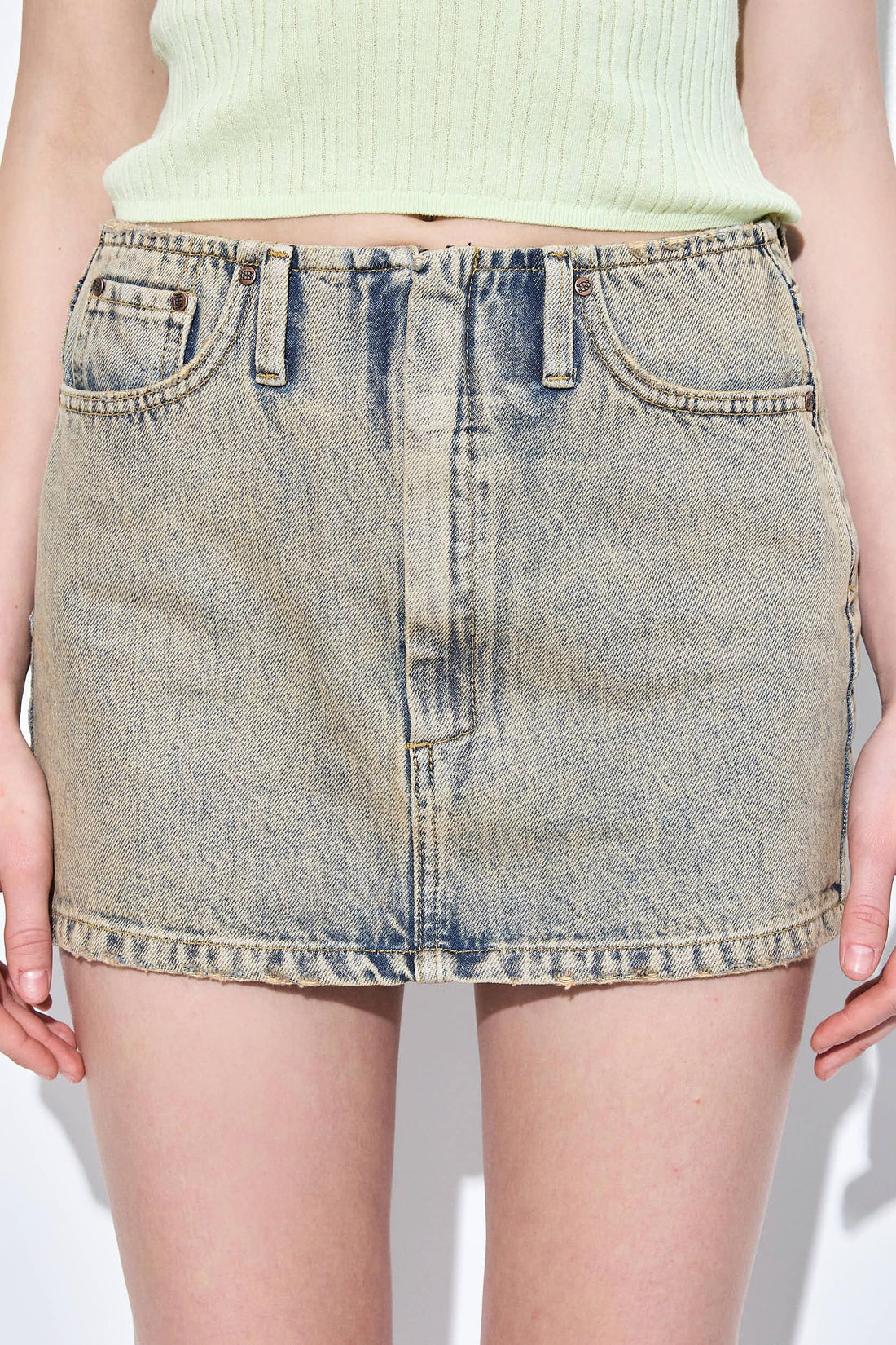 The perfect mid-rise denim micro mini skirt. Featuring two front pockets and two back pockets. Features belt loops and a frontal zipper closure. Clean cut waist. Style it with an oversized t shirt and a pair of slides for an effortlessly stylish everyday look.