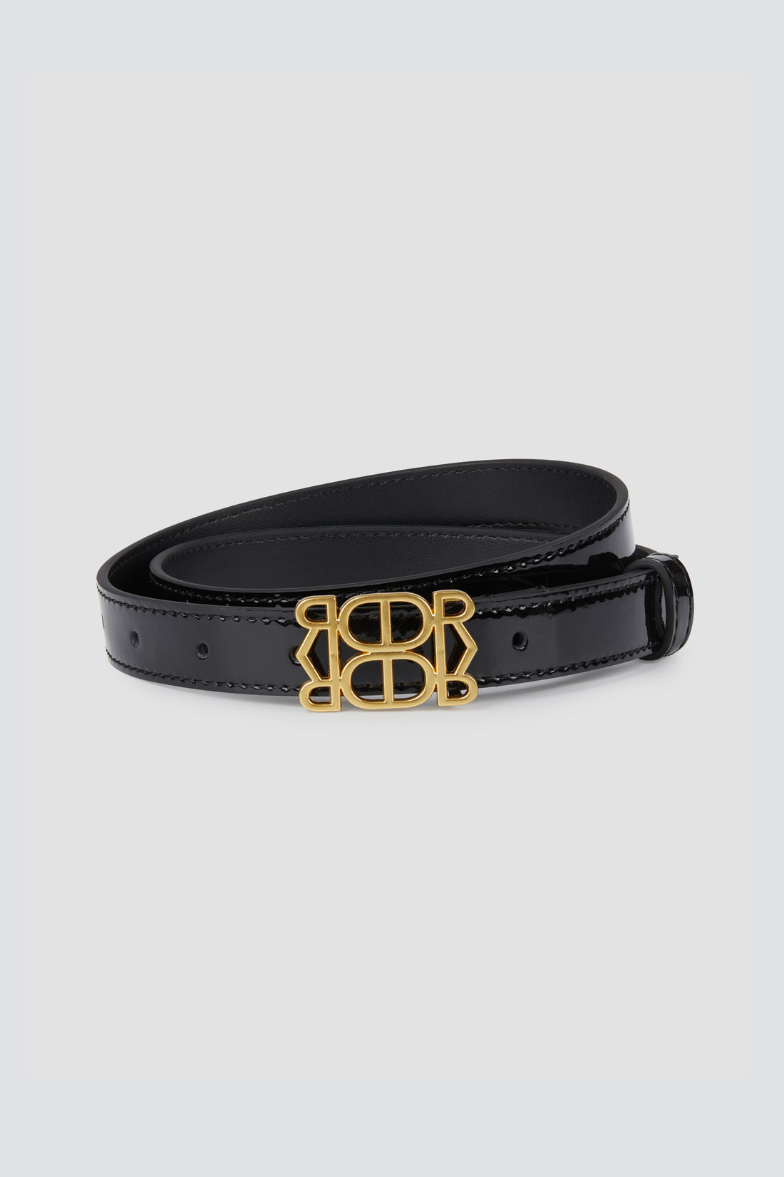 A classic narrow belt with a golden logo buckle. Made from a 100% genuine leather with glossy patent finish. 1.7 cm width. Featuring belt loops holes for convenient closure at your preferred length. Comes in a branded box featuring a cotton dust bag, to keep your accessories safe.The perfect and timeless accessory that completes every look.