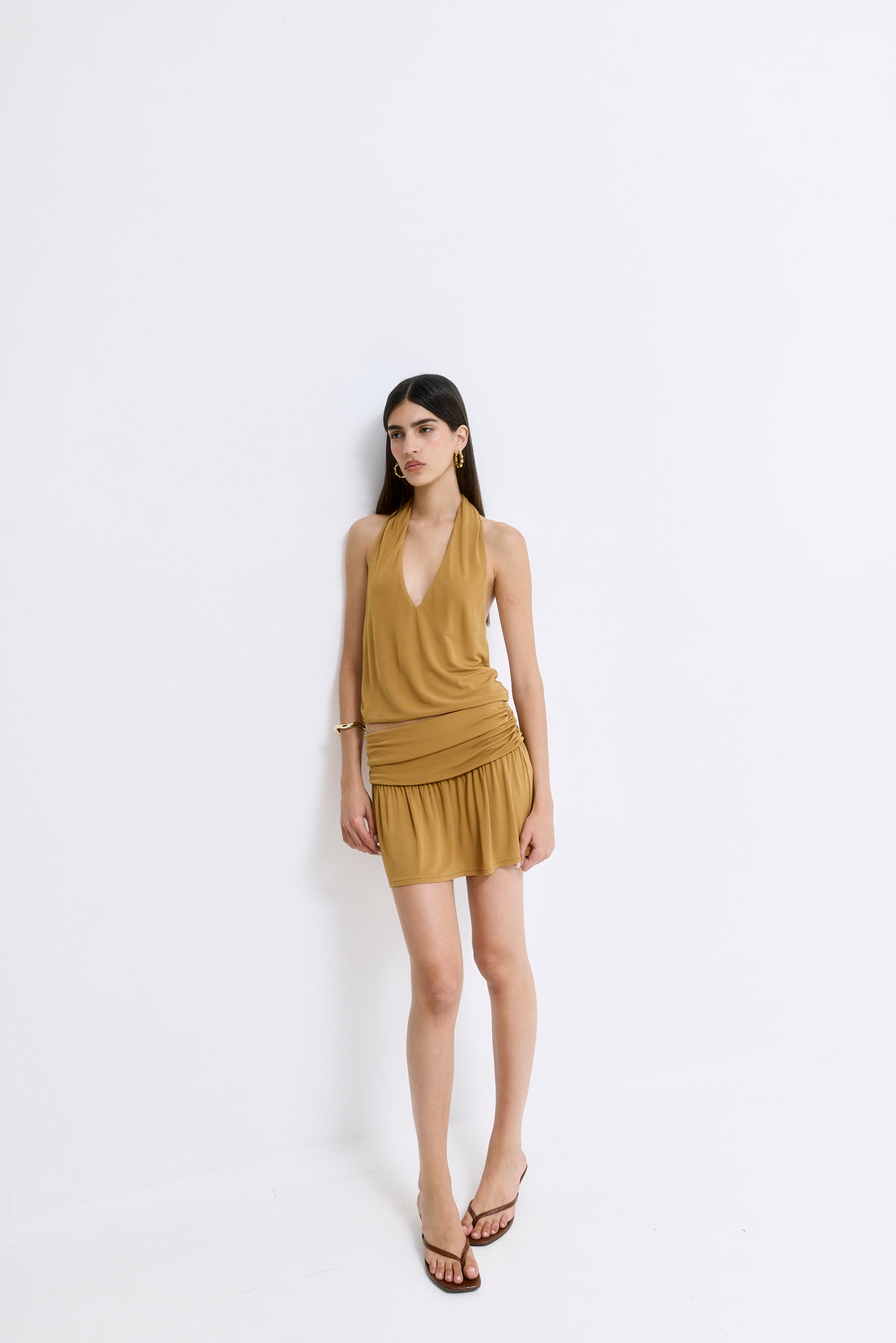 Get ready to fall in love wth our new draped jersey mini skirt. Crafted in stretchy and soft fabric that flatters and shapes the body. Gathered detailing at the waist for a flattering silhouette. Mini-length hemline for a graceful, elongated effect. Slip-on style with a relaxed fit through the skirt. Style it with our classy leather Yvon bag and our oval sunglasses for the perfect effortless look.