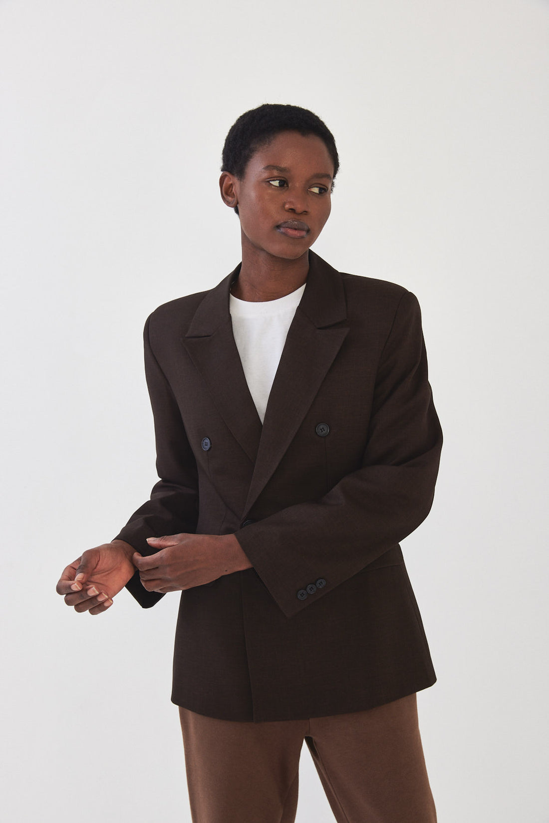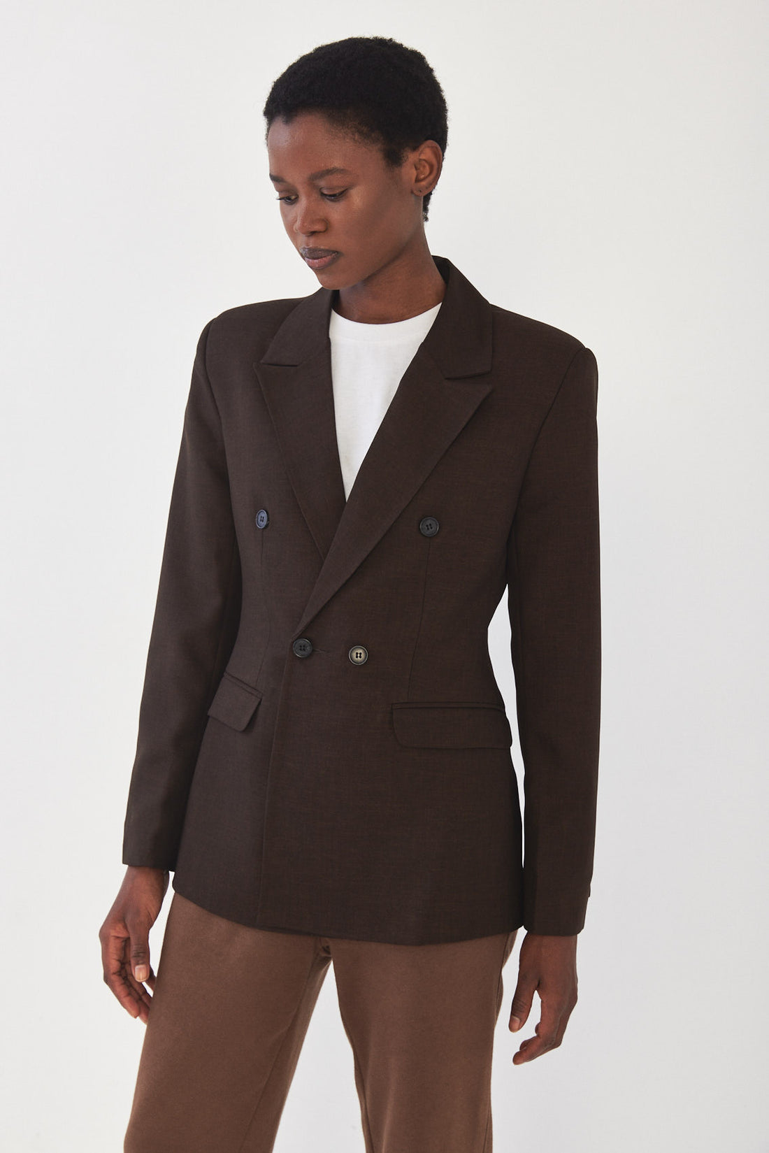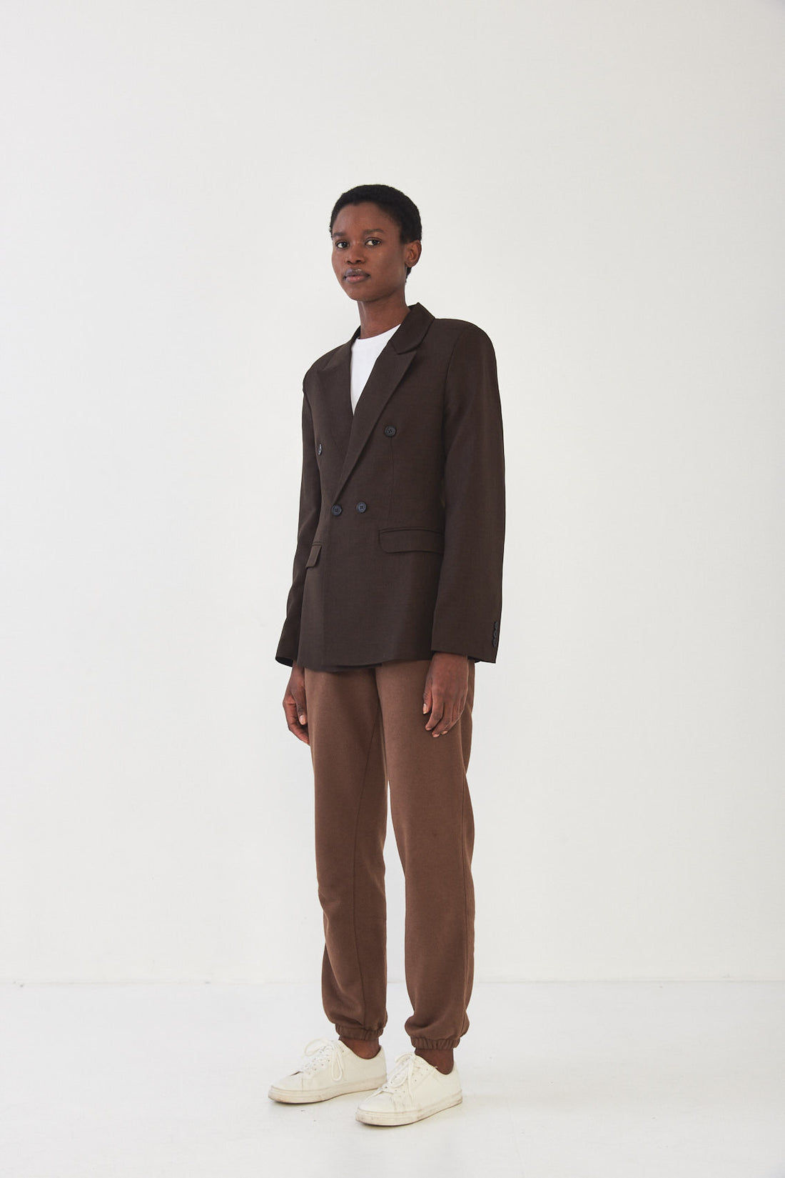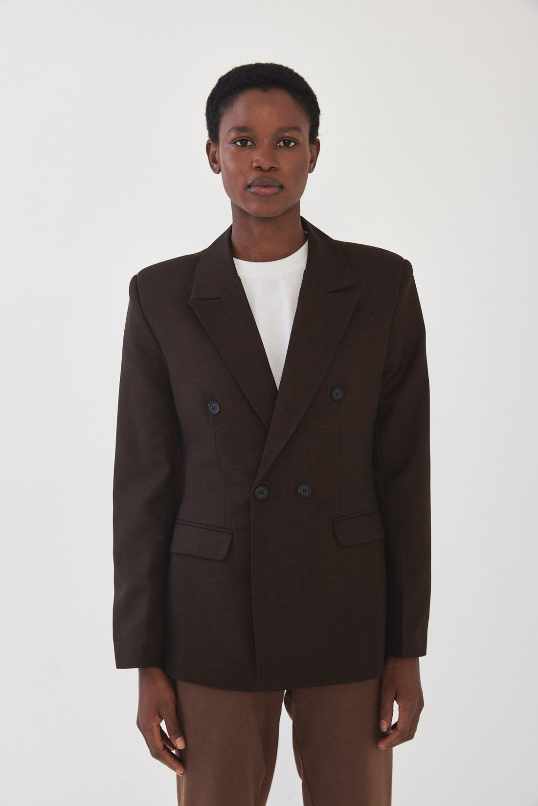 A classic blazer with an oversize fit. Features broad shoulders and a lapel collar. Fitted at the waist for a structural shape. Double breasted buttoned closure and detailes. Back embroidered logo detail at collar. Complete the look with a matching color Daddy pants.