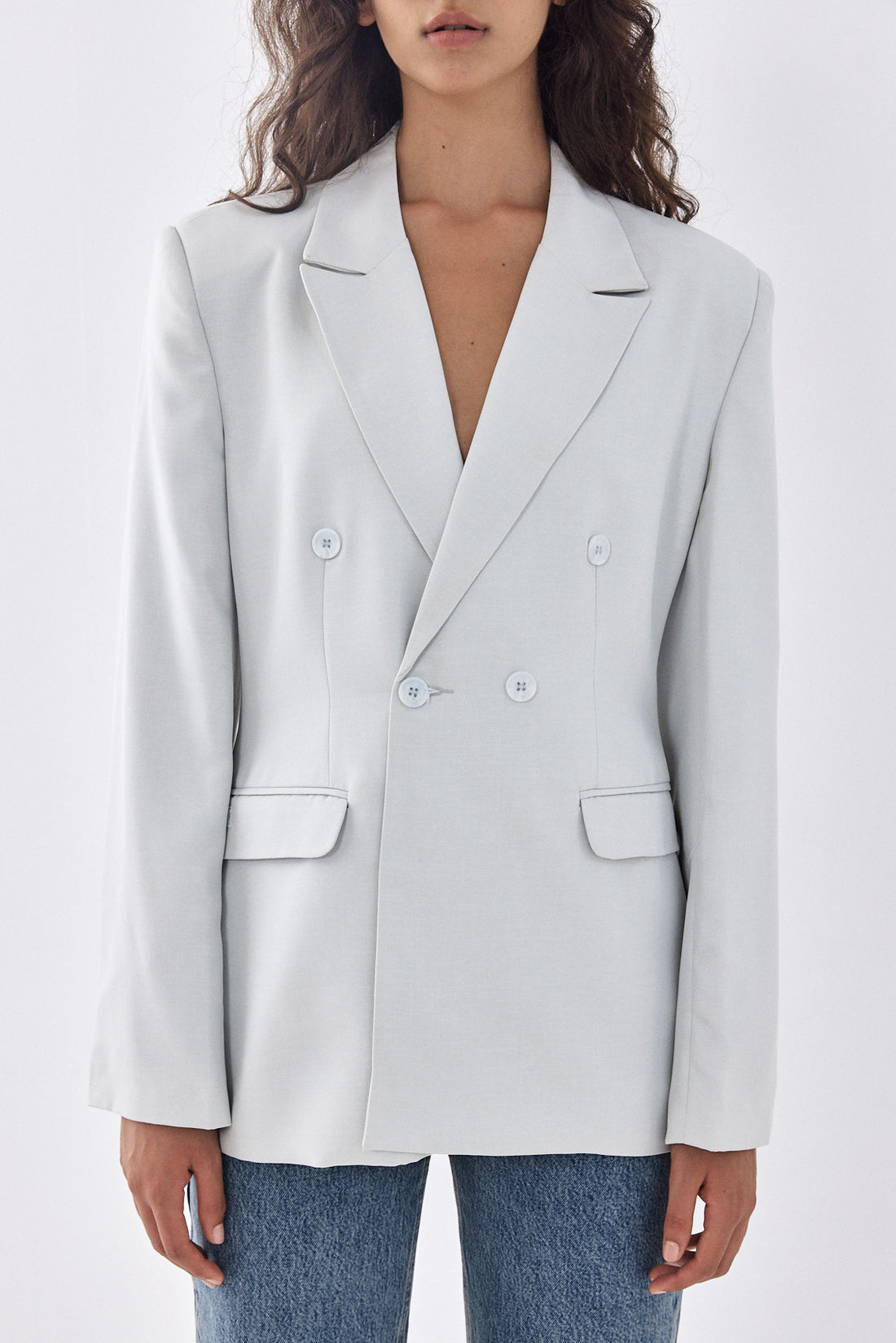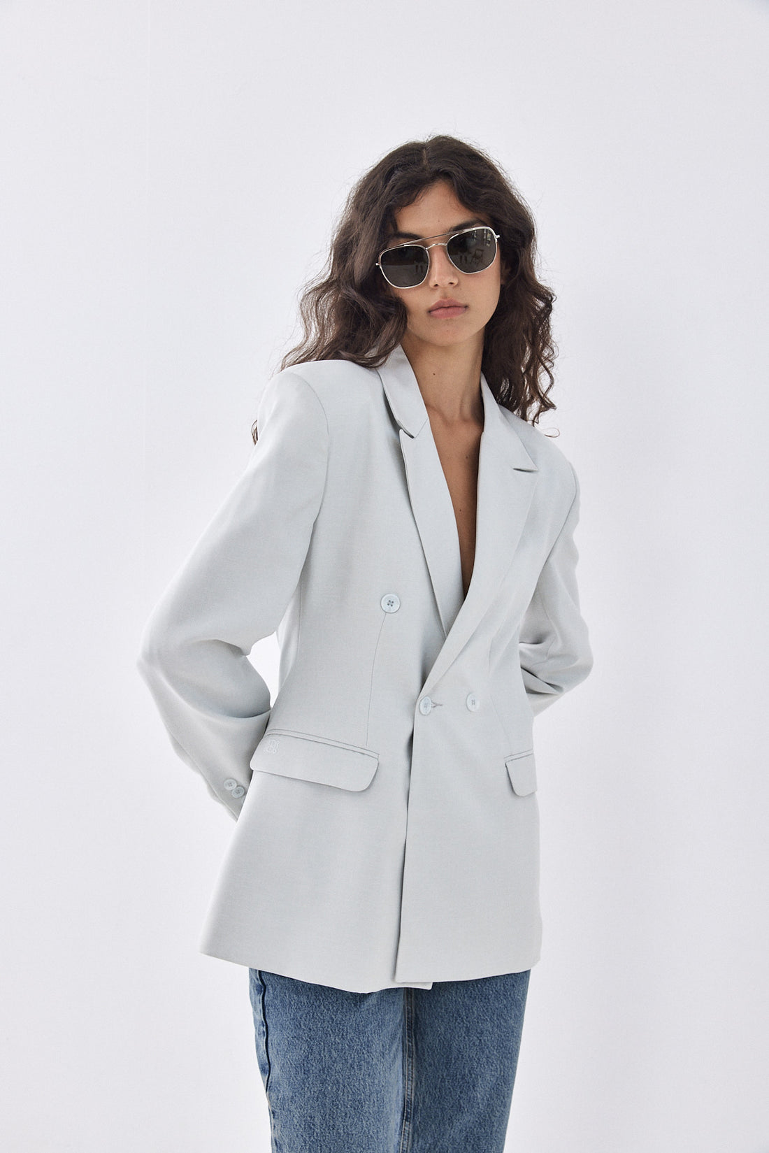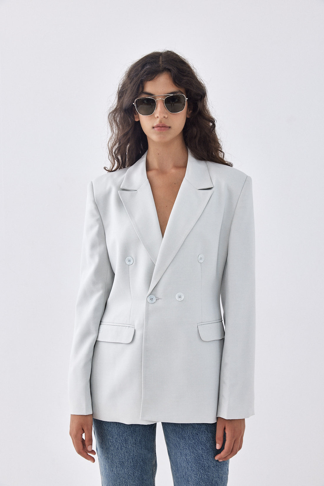 A classic blazer with an oversized fit. Features broad shoulders and a lapel collar. Fitted at the waist for a cinched look, giving the blazer a structural shape. Double breasted buttoned closure. Back embroidered logo detail on the collar. Complete the look with a pair of matching daddy pants and a pair of loafers for a classic look.