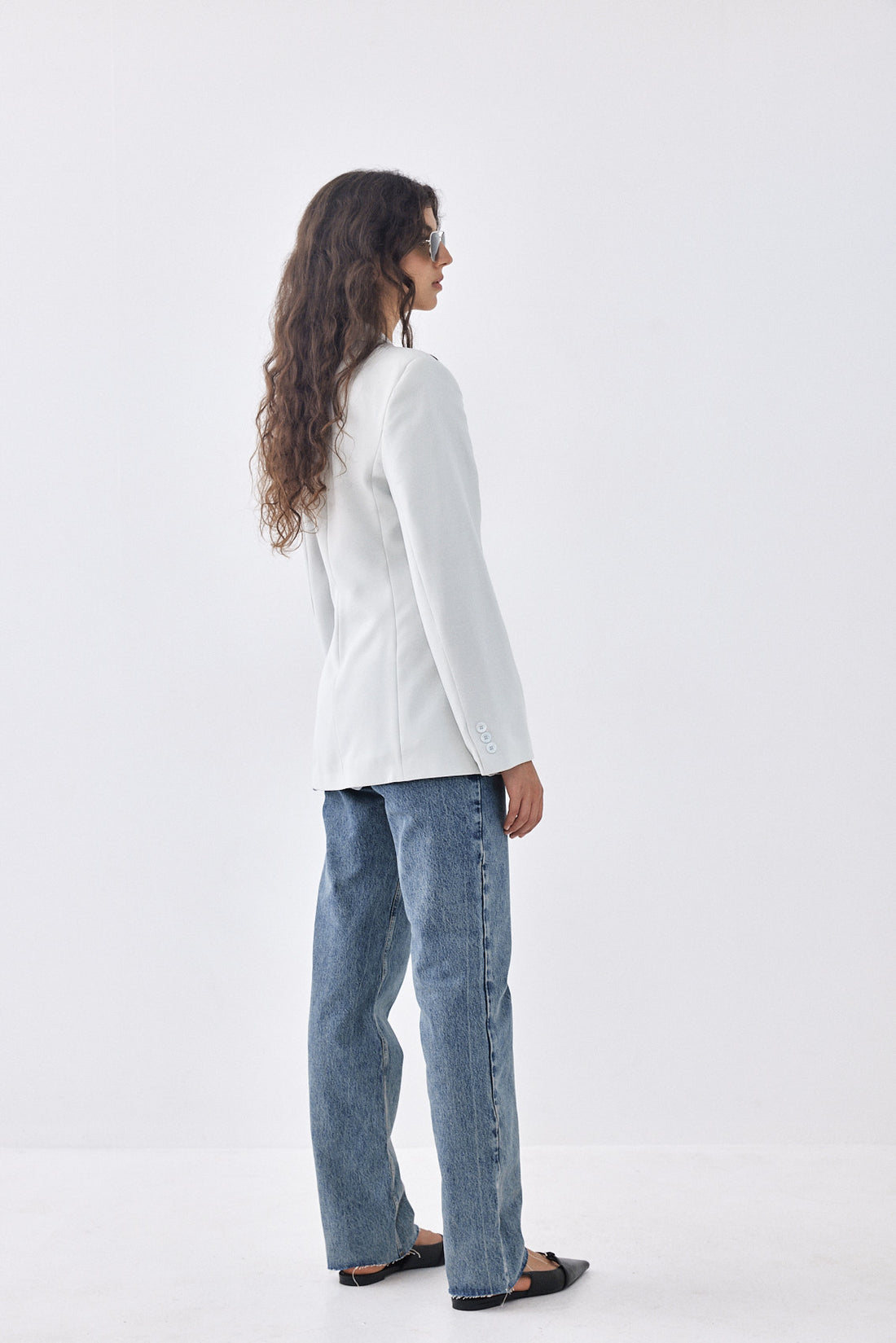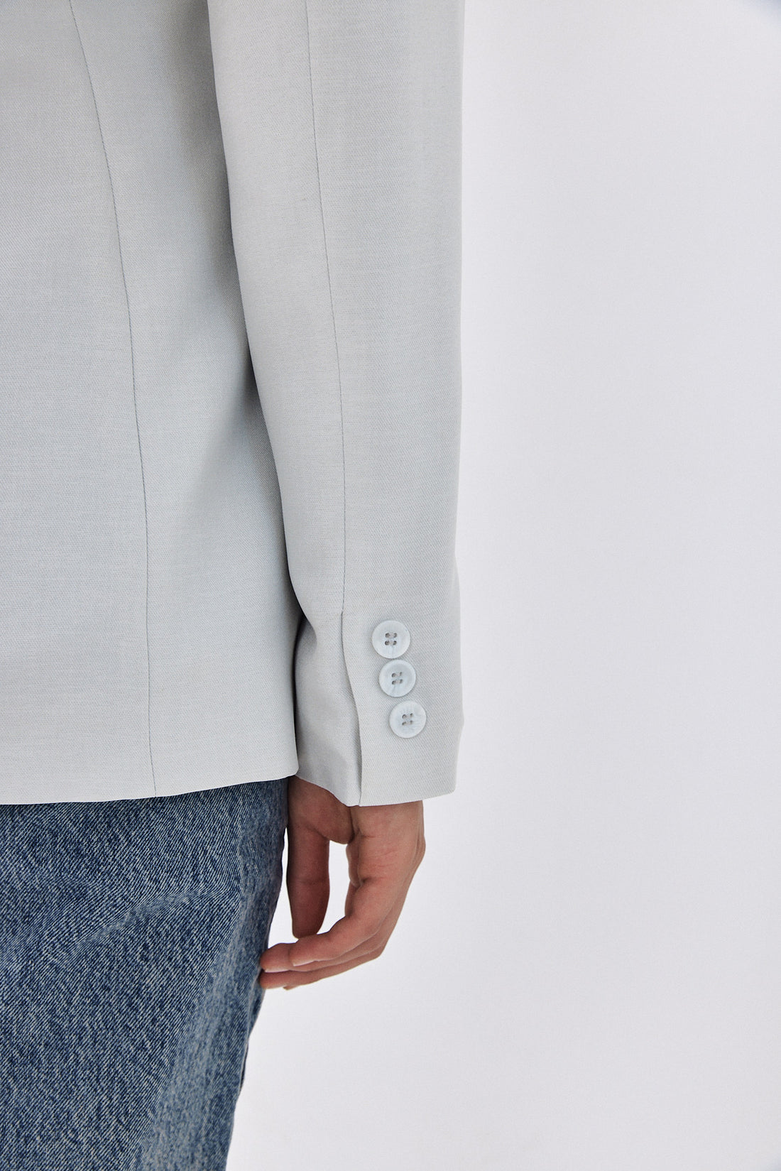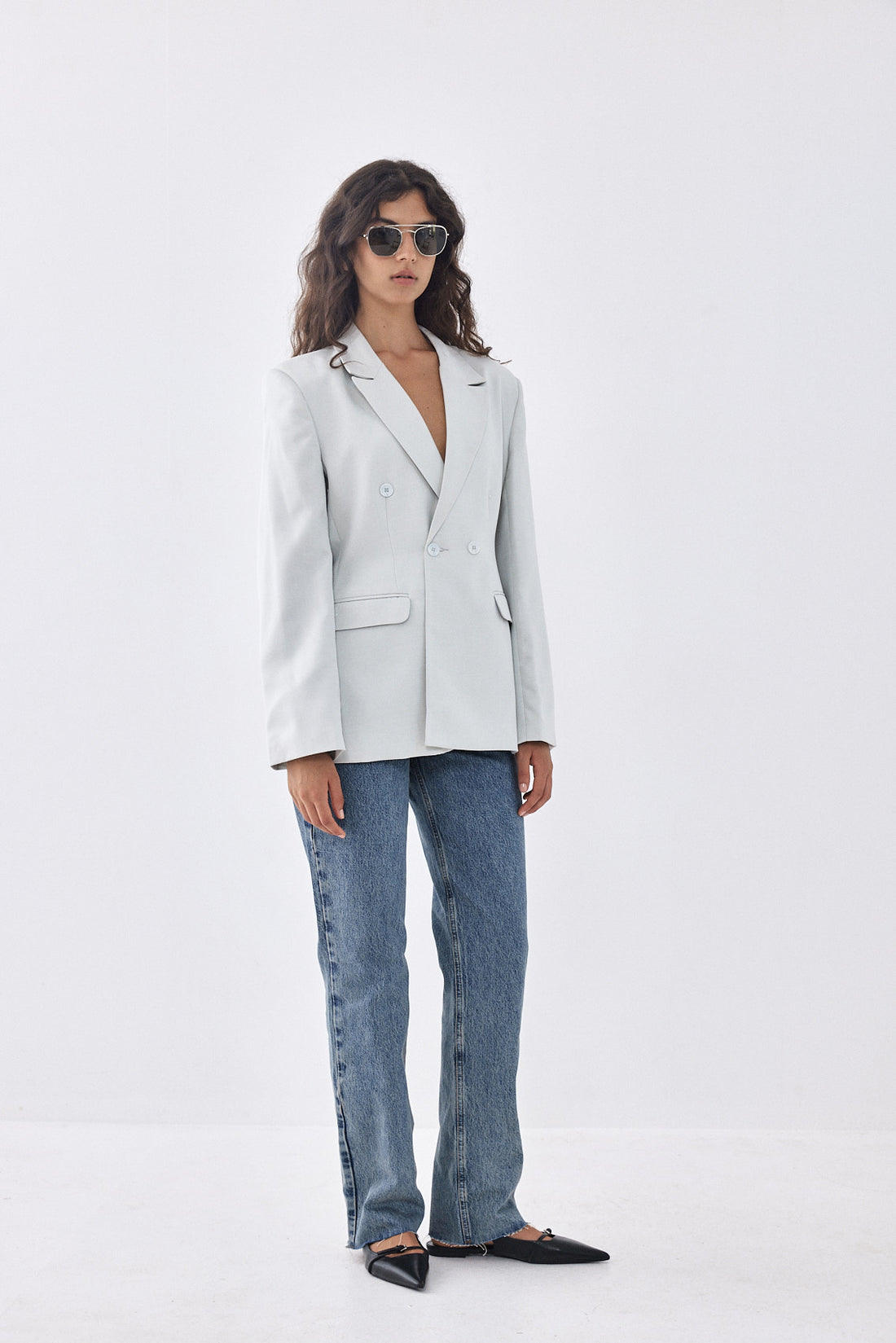 A classic blazer with an oversized fit. Features broad shoulders and a lapel collar. Fitted at the waist for a cinched look, giving the blazer a structural shape. Double breasted buttoned closure. Back embroidered logo detail on the collar. Complete the look with a pair of matching daddy pants and a pair of loafers for a classic look.