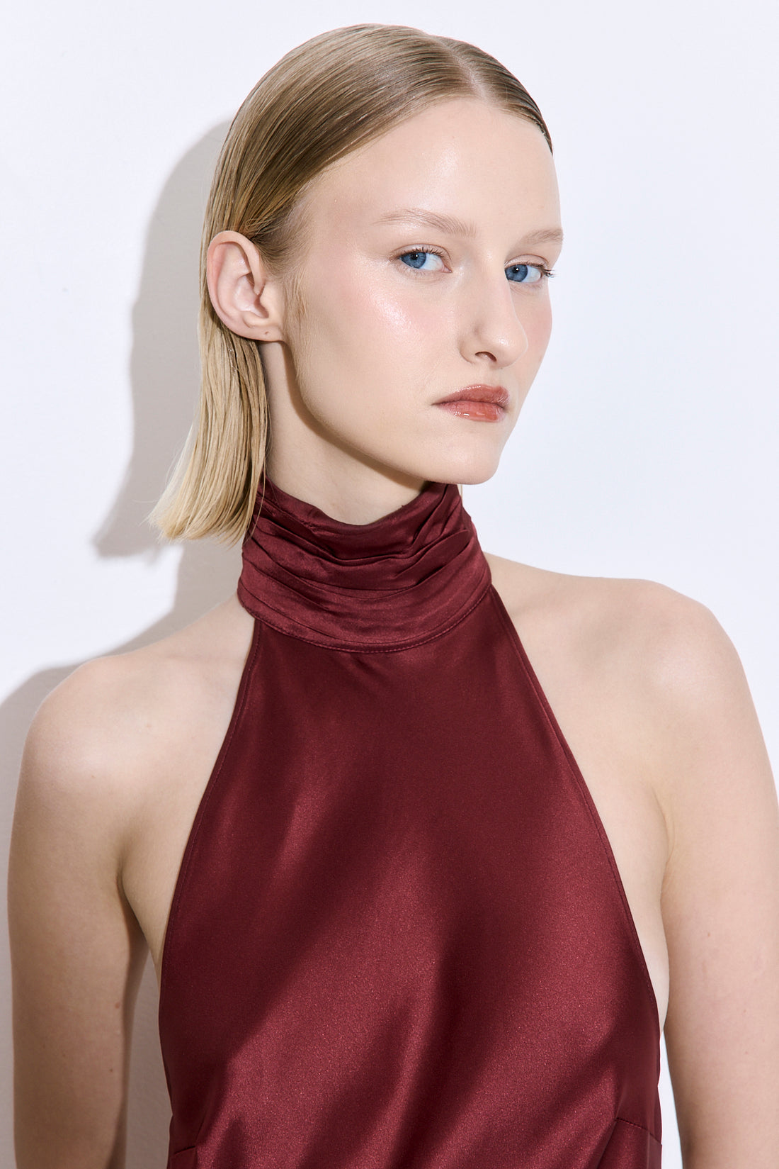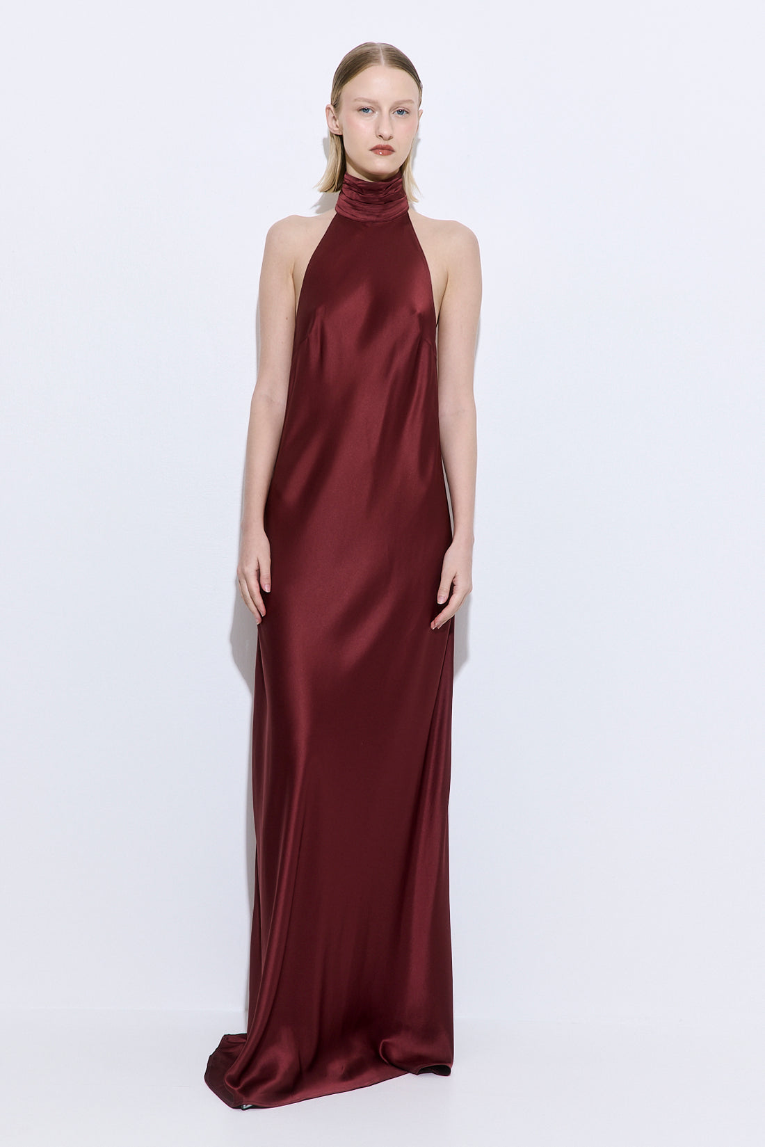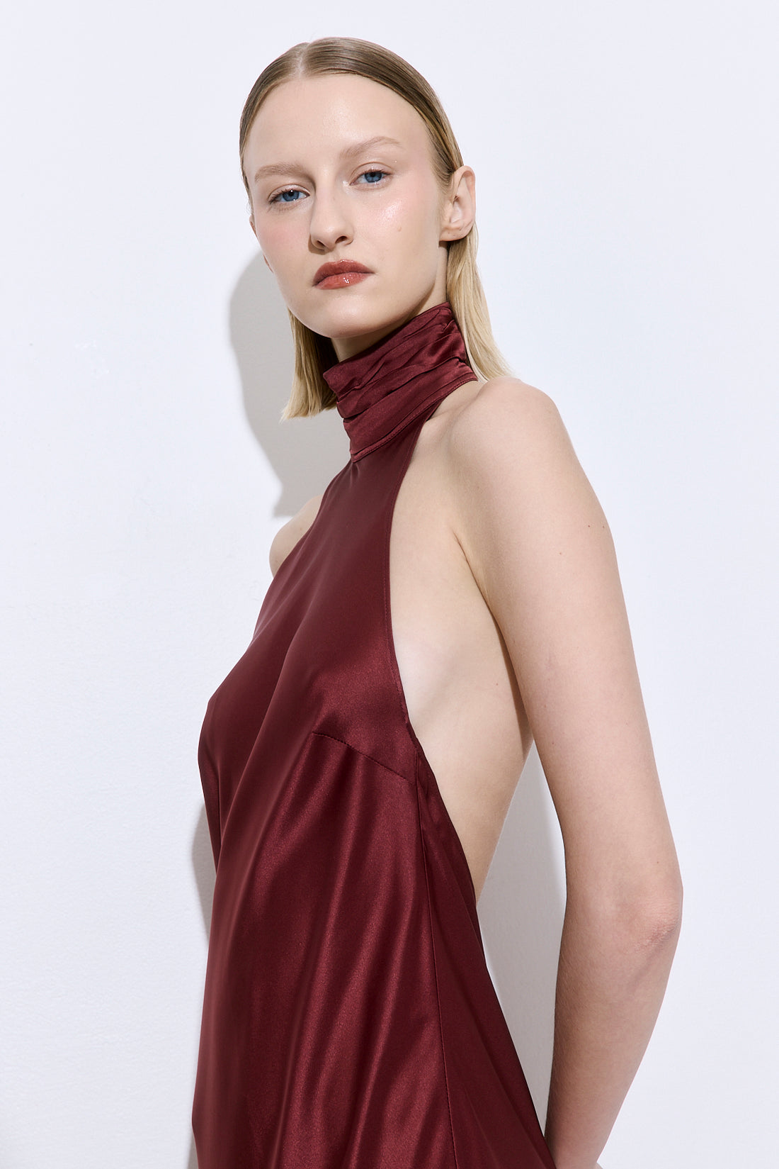 Our new high collar satin dress will make you feel like you came out of a dream. Maxi Length. Soft and luxurious satin fabric. High gathered collar. Deep open back. Column silhouette that skims the body with a sleek, figure-hugging fit. Secured at the back with a delicate satin-covered button and loop closure for a seamless finish. Style it with our matching scrunchie and throw a blazer on top to seal this gorgeous look.