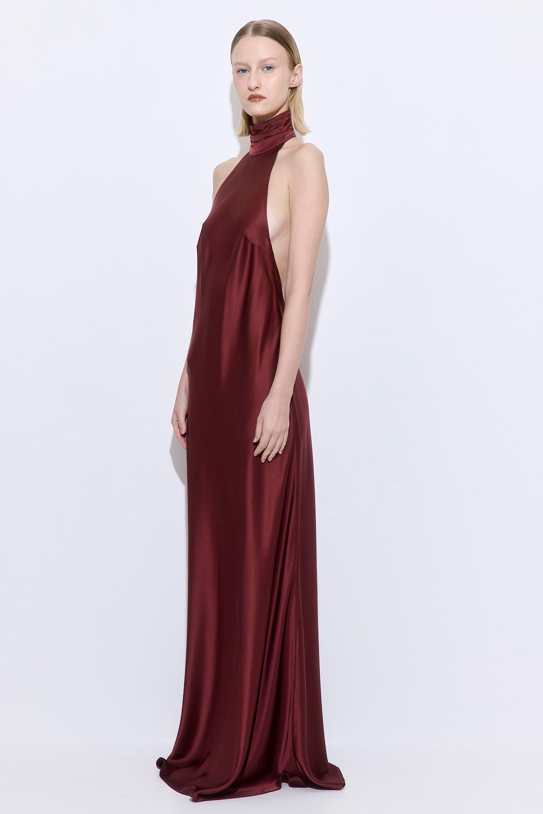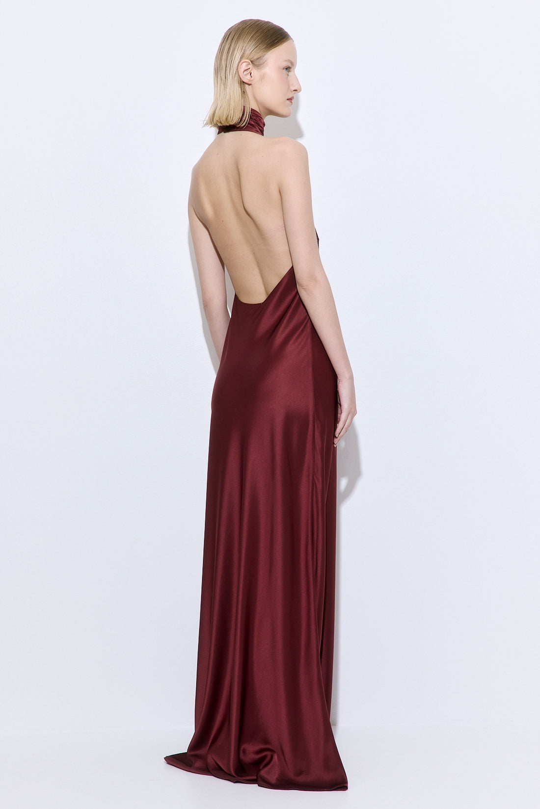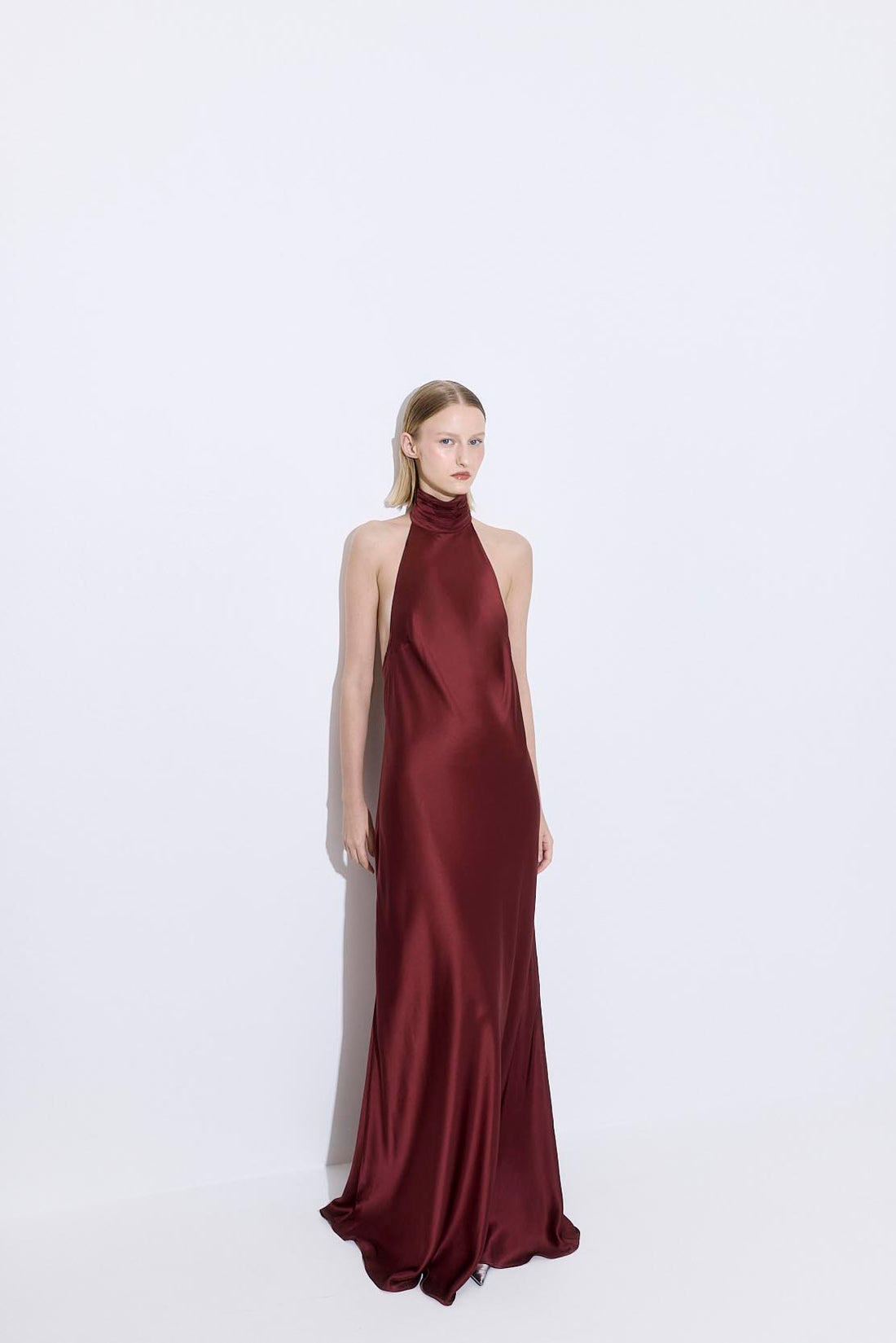 Our new high collar satin dress will make you feel like you came out of a dream. Maxi Length. Soft and luxurious satin fabric. High gathered collar. Deep open back. Column silhouette that skims the body with a sleek, figure-hugging fit. Secured at the back with a delicate satin-covered button and loop closure for a seamless finish. Style it with our matching scrunchie and throw a blazer on top to seal this gorgeous look.