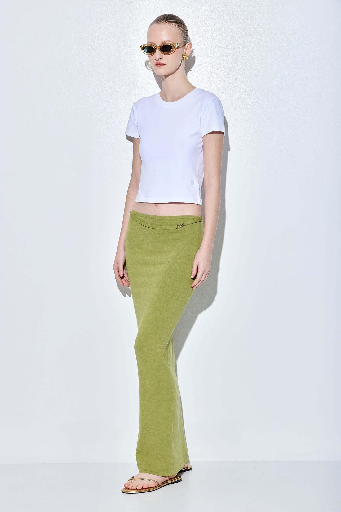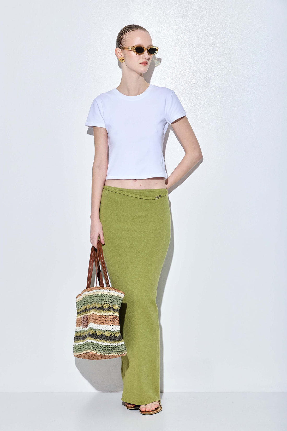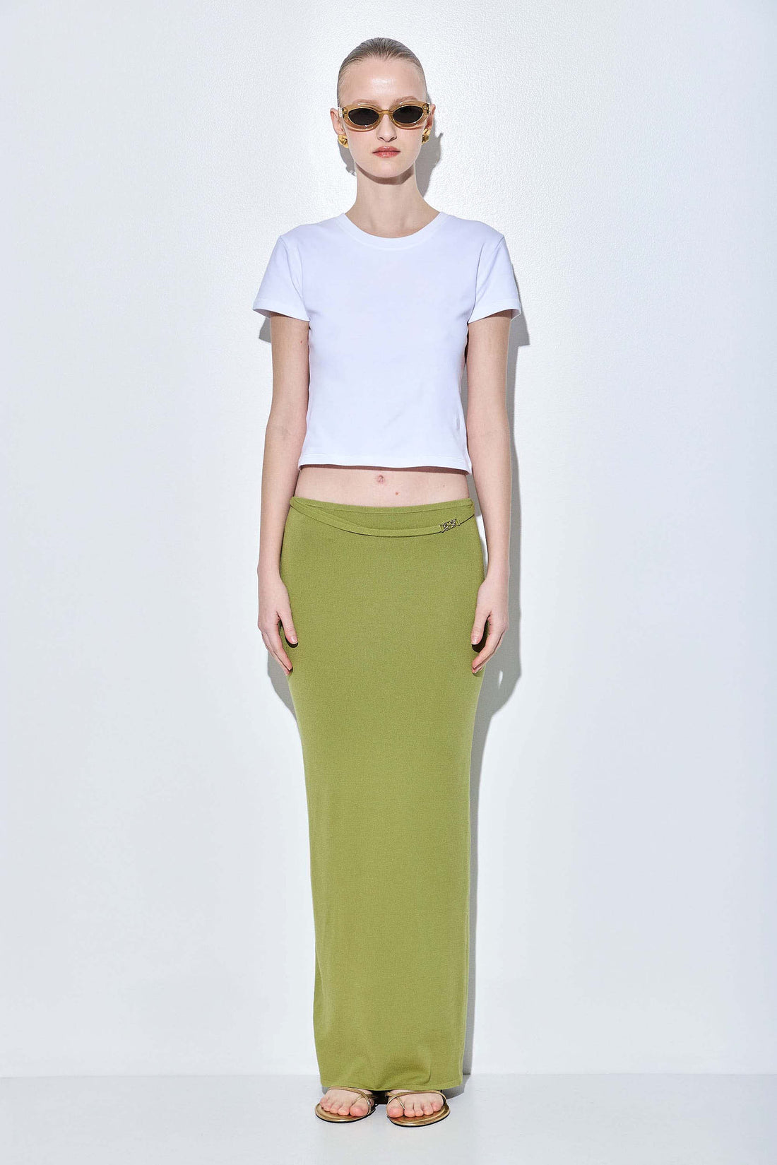 Our knitted buckle maxi skirt is this season's true must have. Made from a soft, stretchy knit fabric that hugs the body for a flattering silhouette. Features a gold buckle logo detailing on the front side. Straight fit. Fully fashioned fabric. Thin clean finish. Style it with our deep scoop knitted tank top and our beautiful pair of oval sunnies for a chic look.
