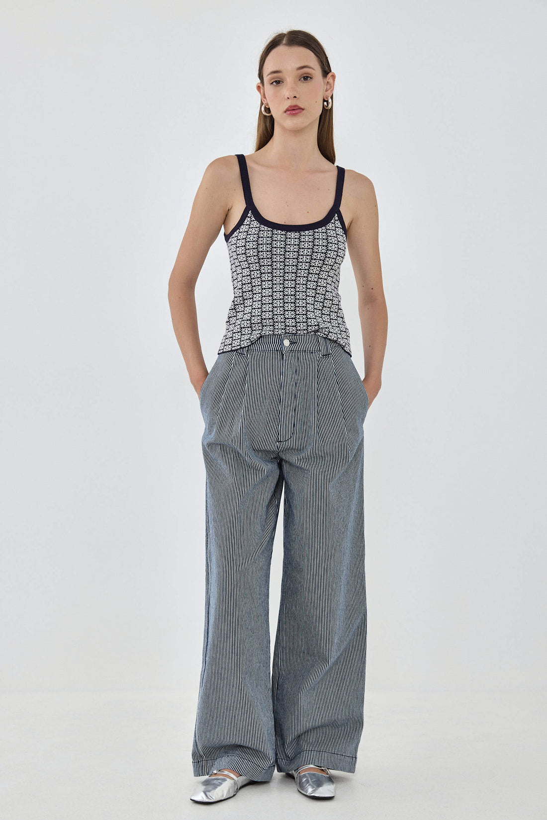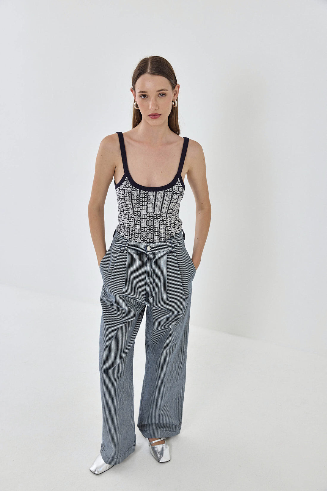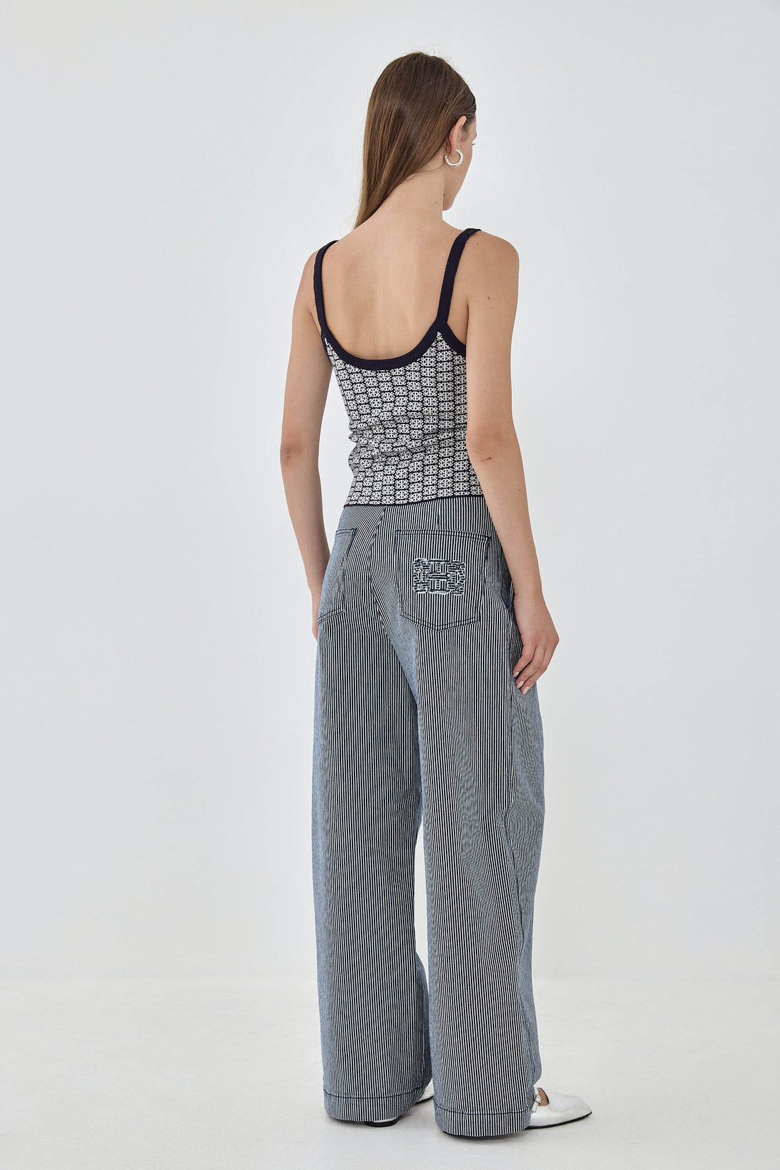 A fun print with a classic silhouette top is an absolute wardrobe essential this summer. Featuring thin precise straps. Contrast ribbed stripe. Deep round neckline. Deep round back. Monogram intarsia print. Style it with the striped cotton maxi skirt for a fun play on textures and prints, a fun chic look for summer.