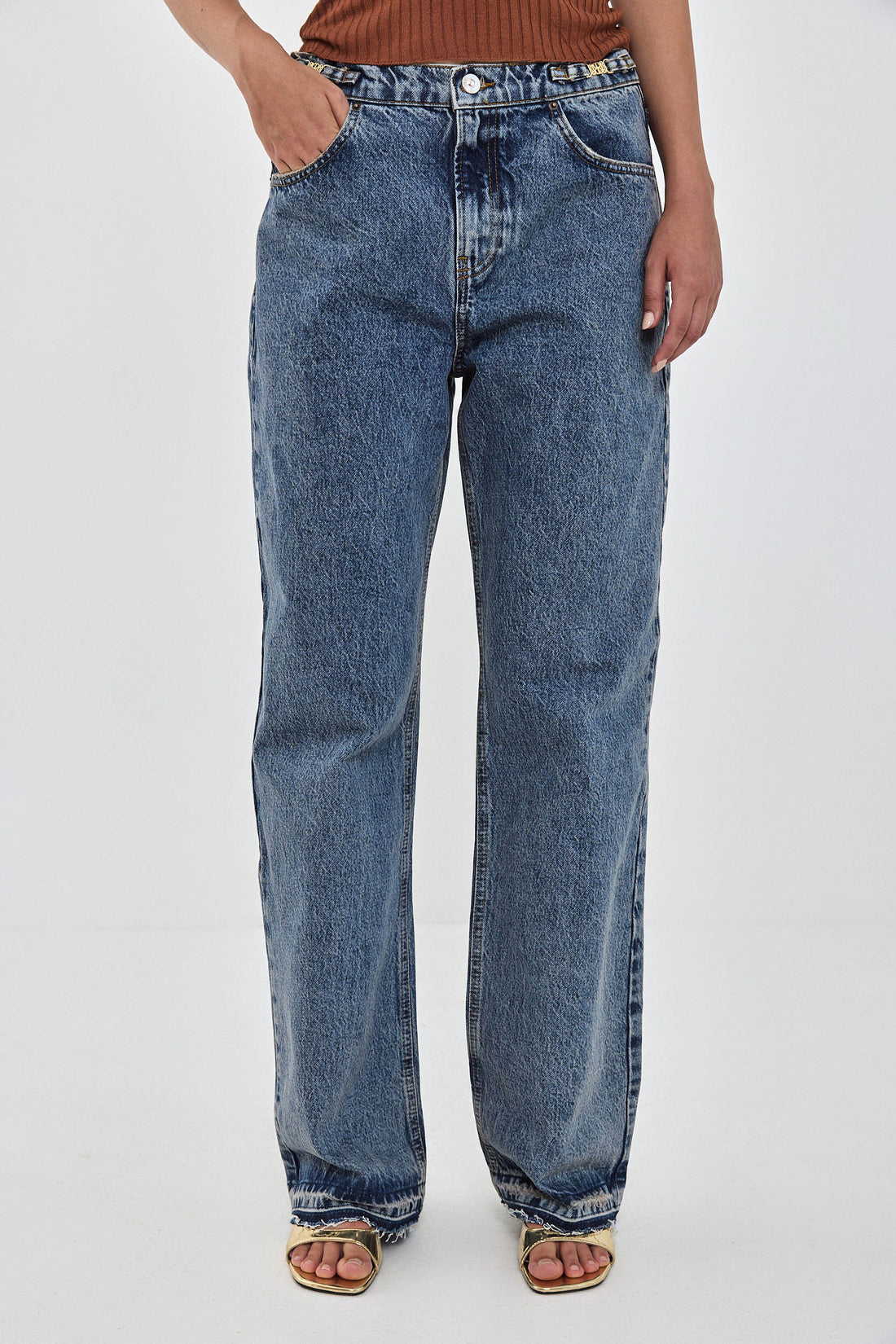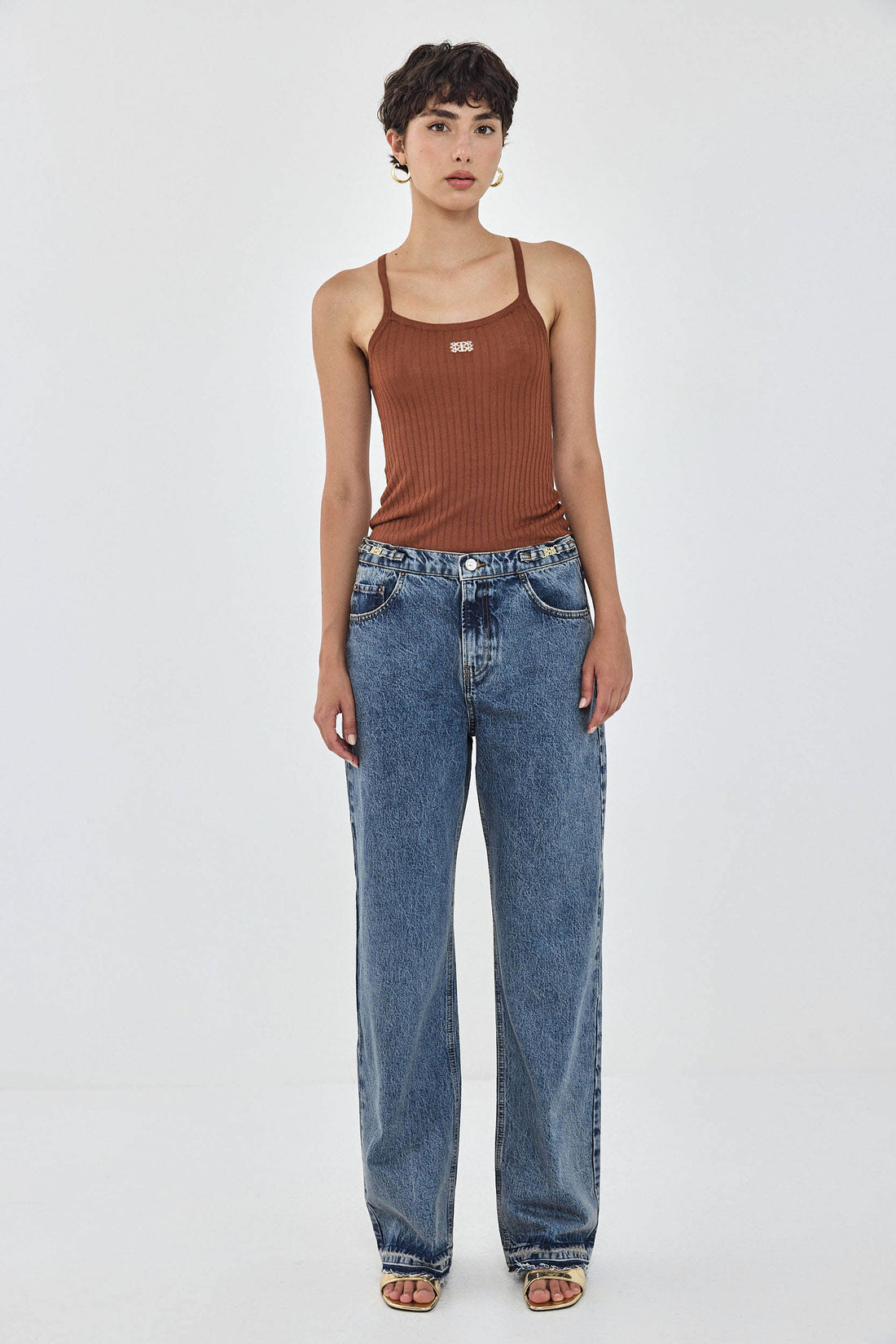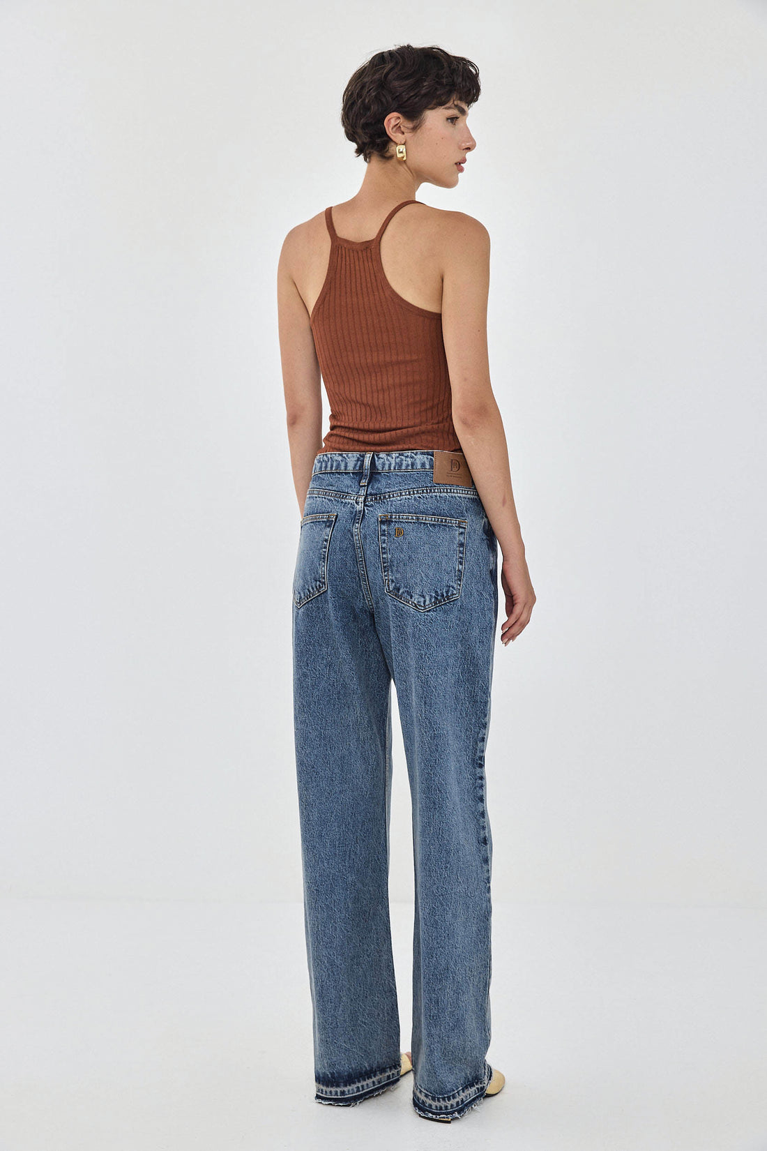 Our No.11 denim is a mid rise full length with a baggy fit. Frontal zip closure. Features a logo detail embroidered above the back pocket. Raw unfolded hemline. Meet your new go to denim. Style yours with an oversized button down and a kitten heel for an effortlessly stylish going out look.