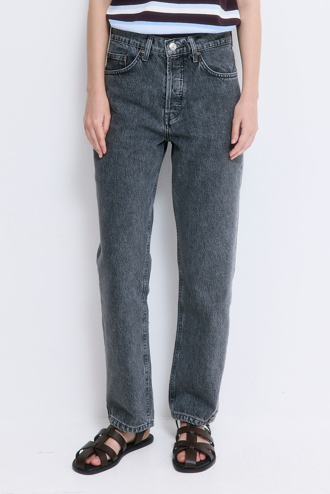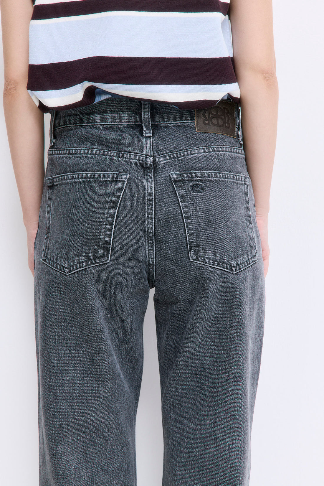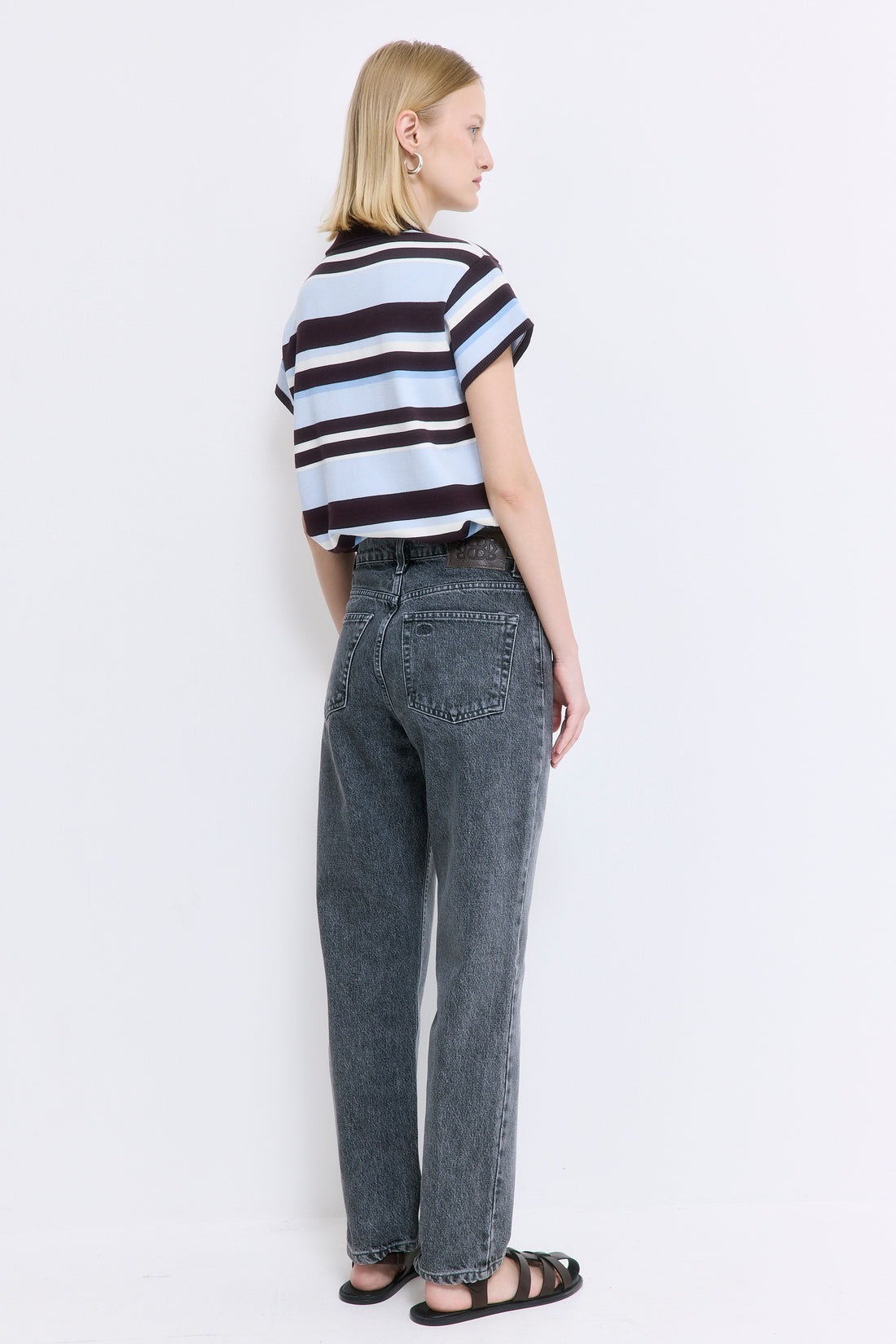 Our No.5 denim is a high waisted straight with a cropped fit. The perfect addition to your summer wardrobe. Front buttoned closure. Features a logo detail embroidered at the back pocket. Style it with your favorite crewneck and a pair of kitten heels.