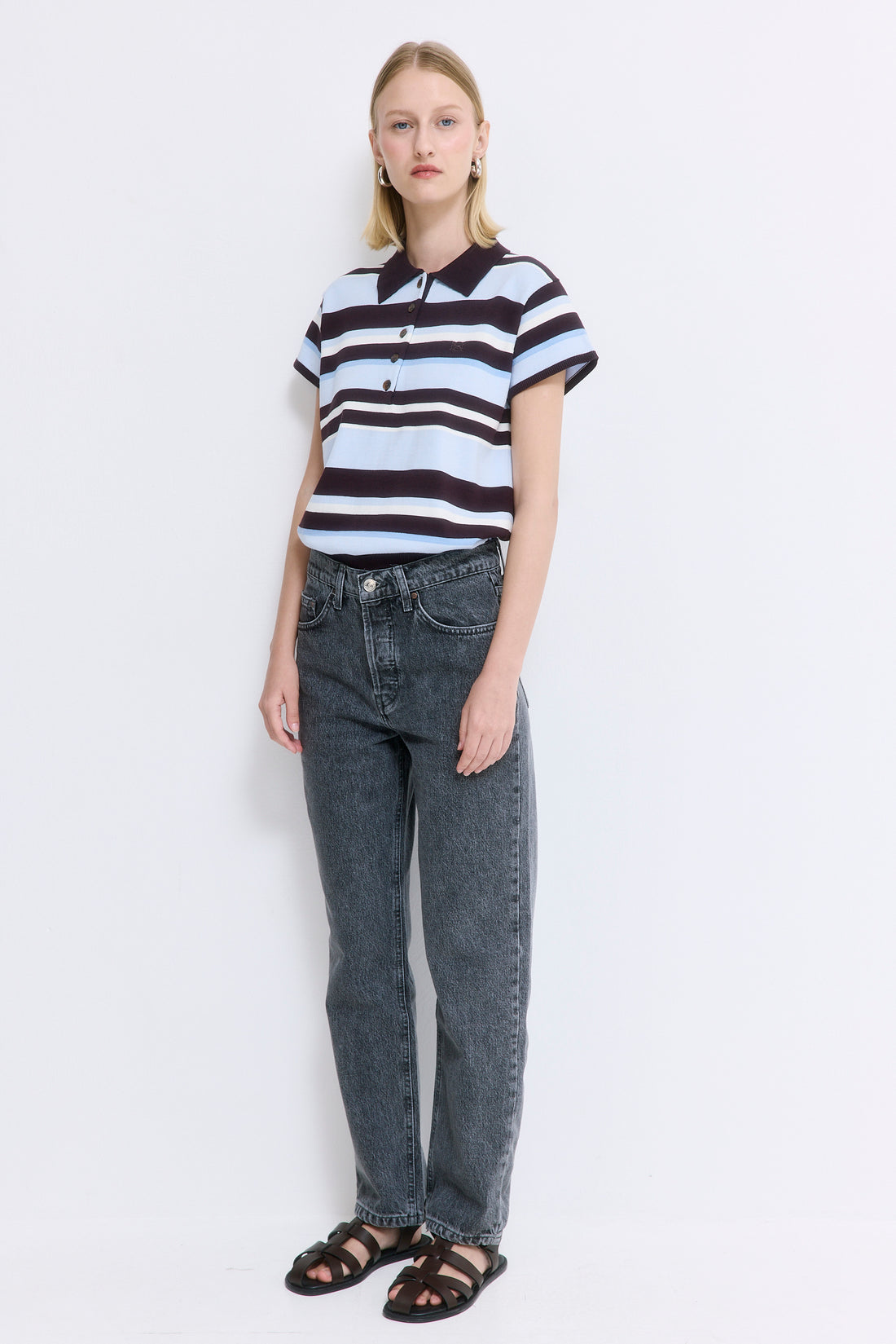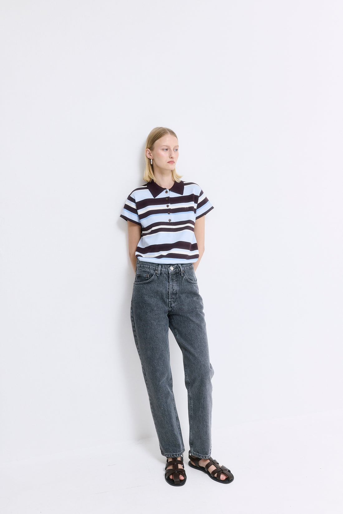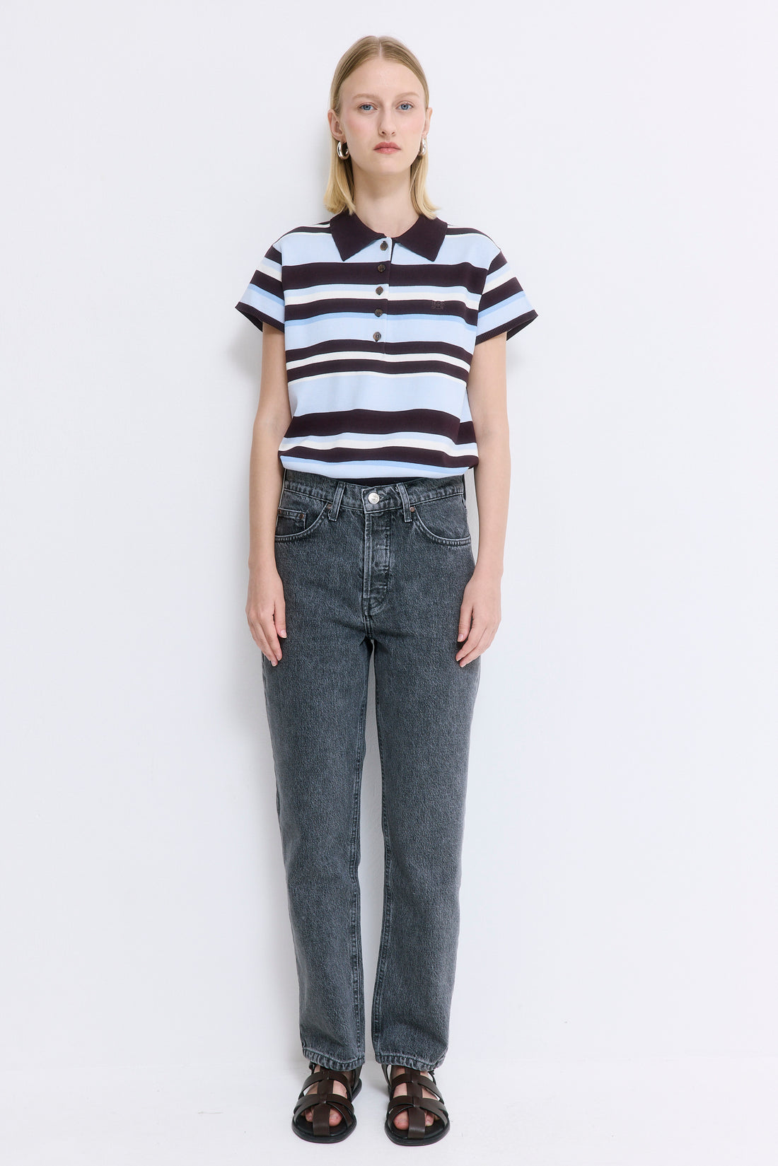Our No.5 denim is a high waisted straight with a cropped fit. The perfect addition to your summer wardrobe. Front buttoned closure. Features a logo detail embroidered at the back pocket. Style it with your favorite crewneck and a pair of kitten heels.