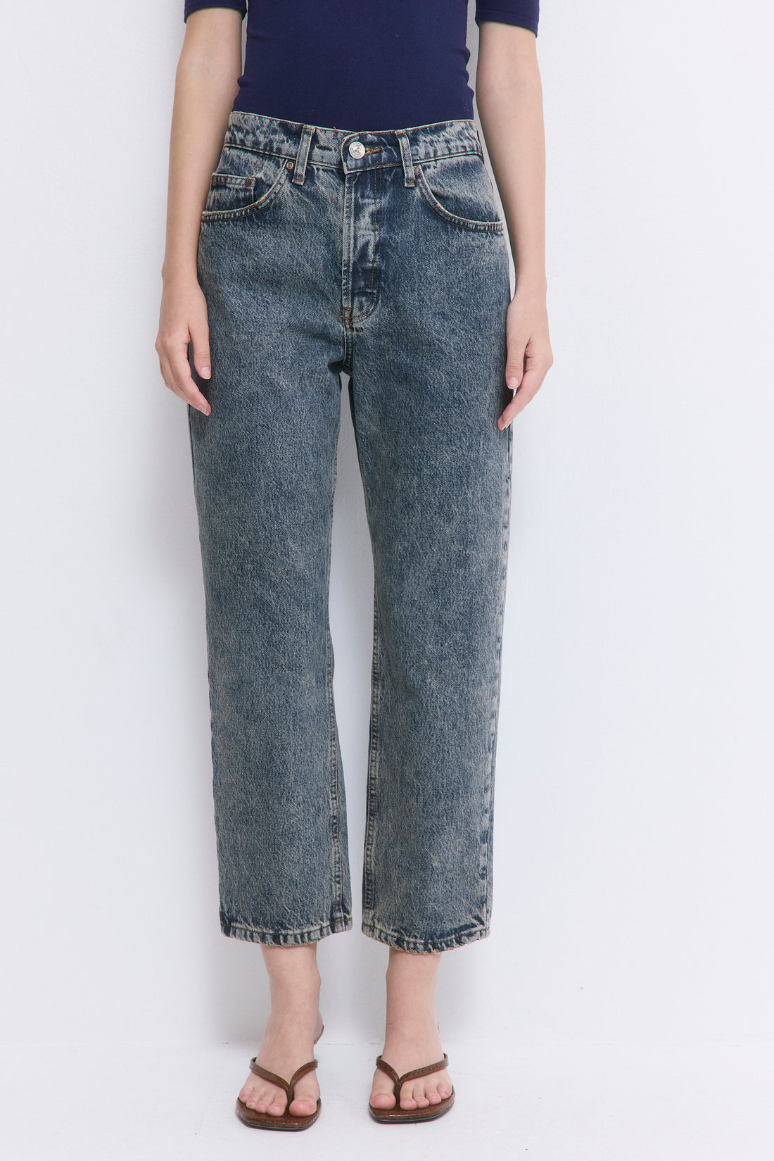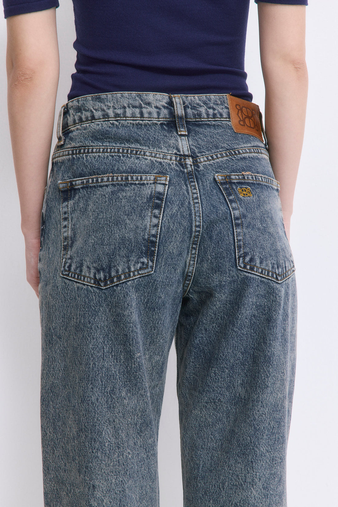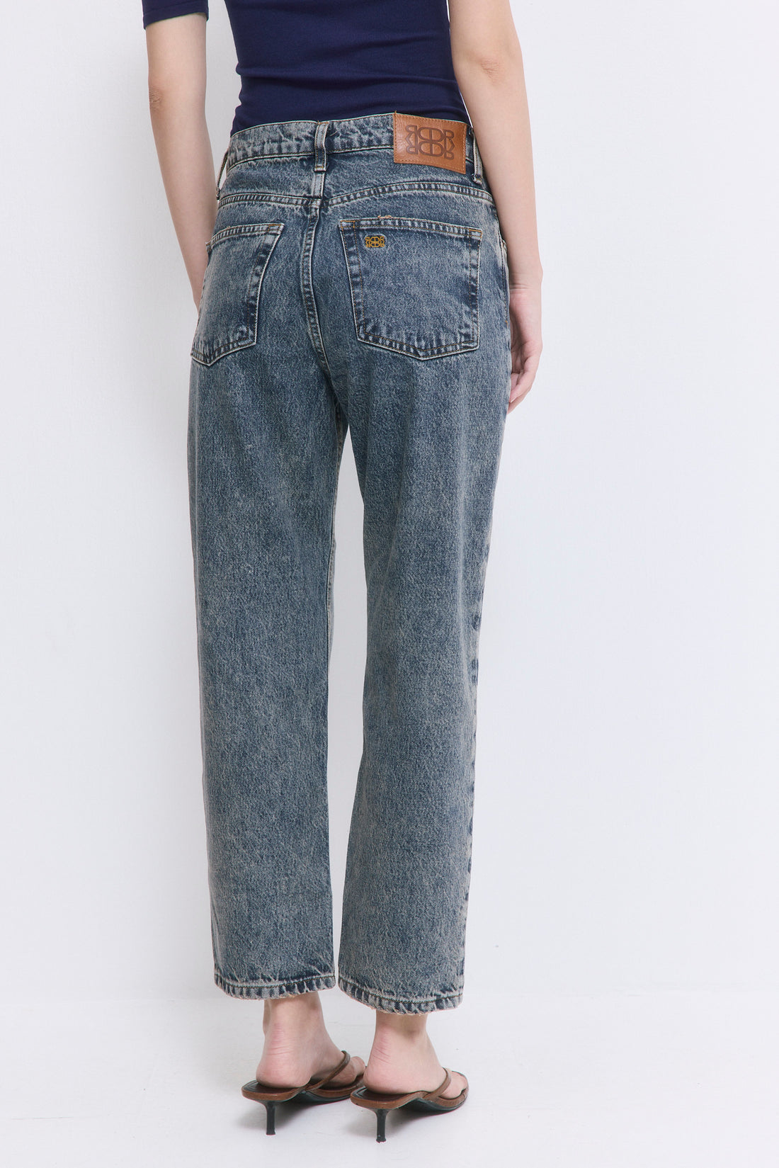 Our No.5 denim is a high waisted straight with a cropped fit. The perfect addition to your summer wardrobe. Front buttoned closure. Features a logo detail embroidered at the back pocket. Style it with your favorite crewneck and a pair of kitten heels.