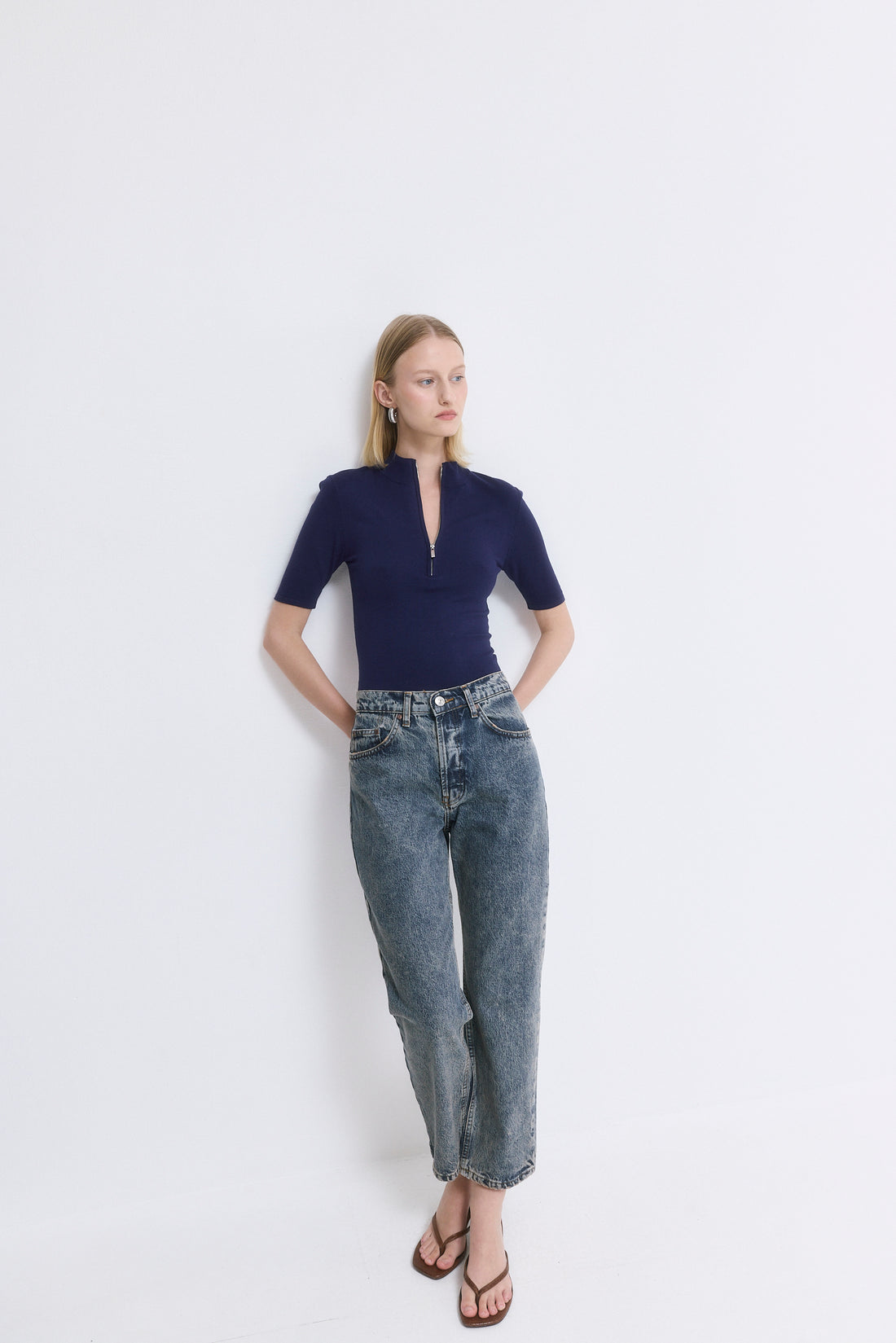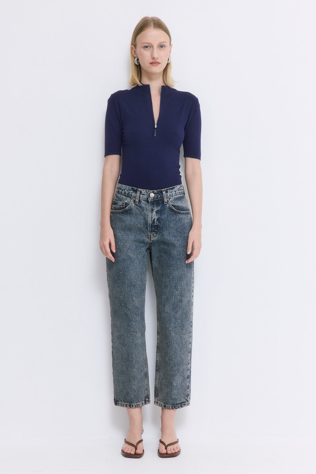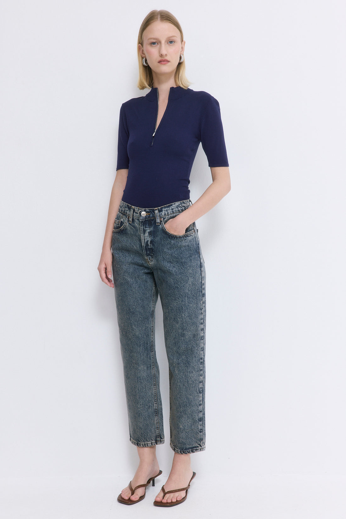 Our No.5 denim is a high waisted straight with a cropped fit. The perfect addition to your summer wardrobe. Front buttoned closure. Features a logo detail embroidered at the back pocket. Style it with your favorite crewneck and a pair of kitten heels.