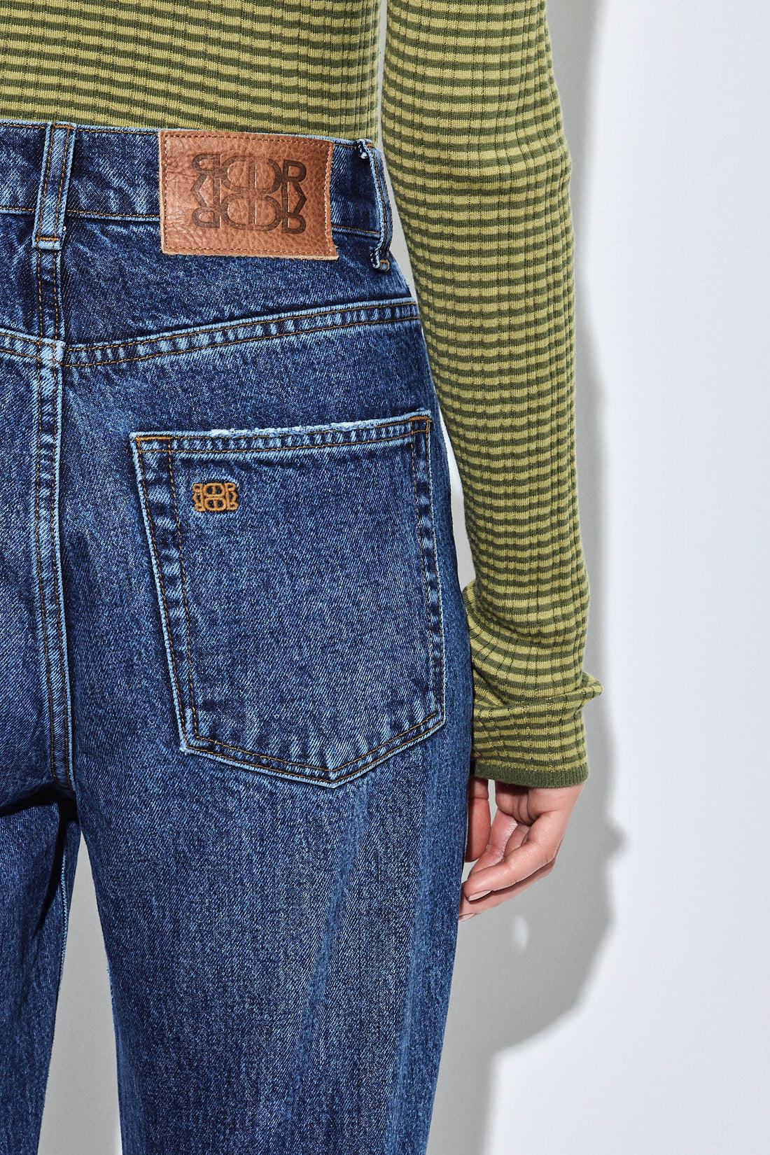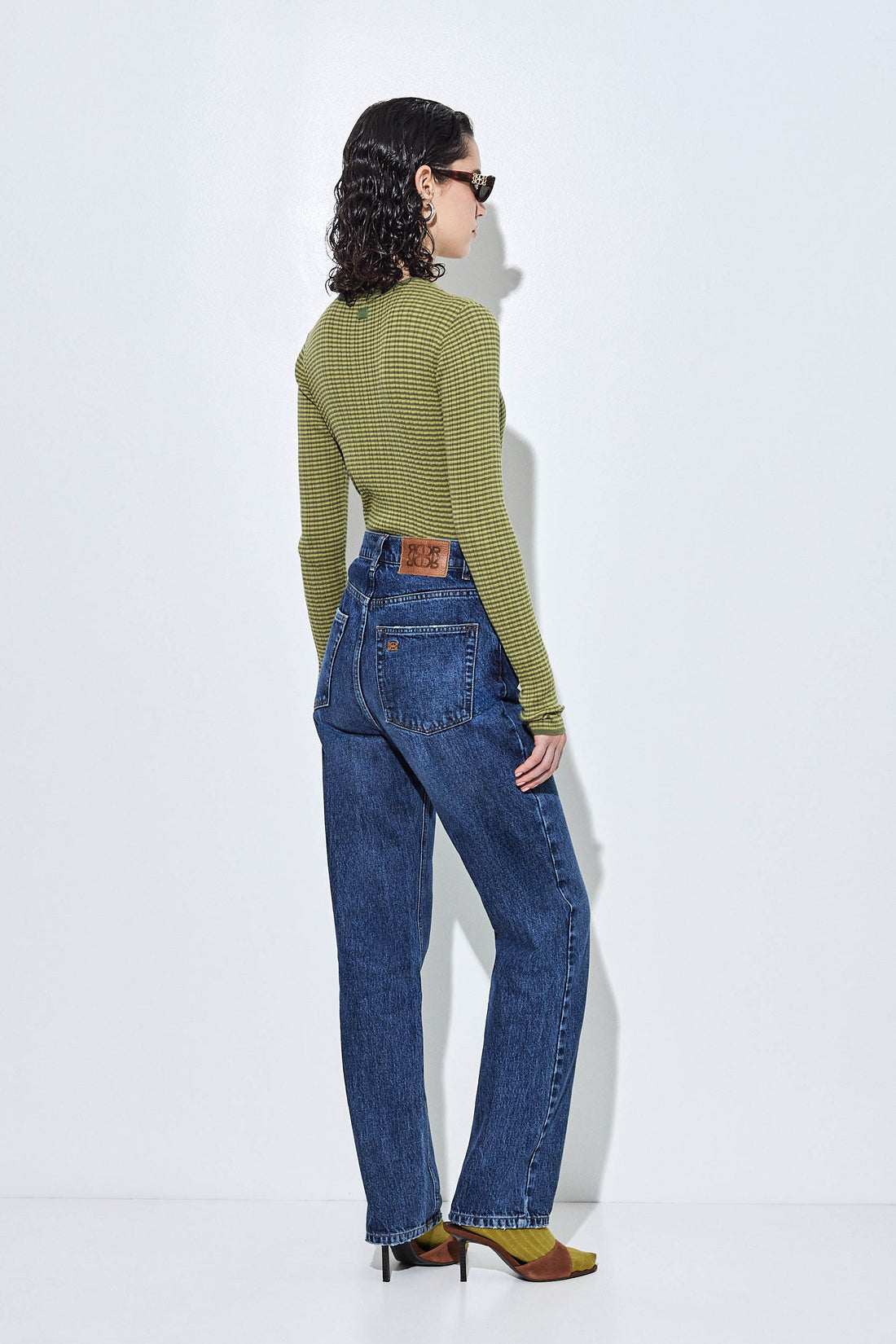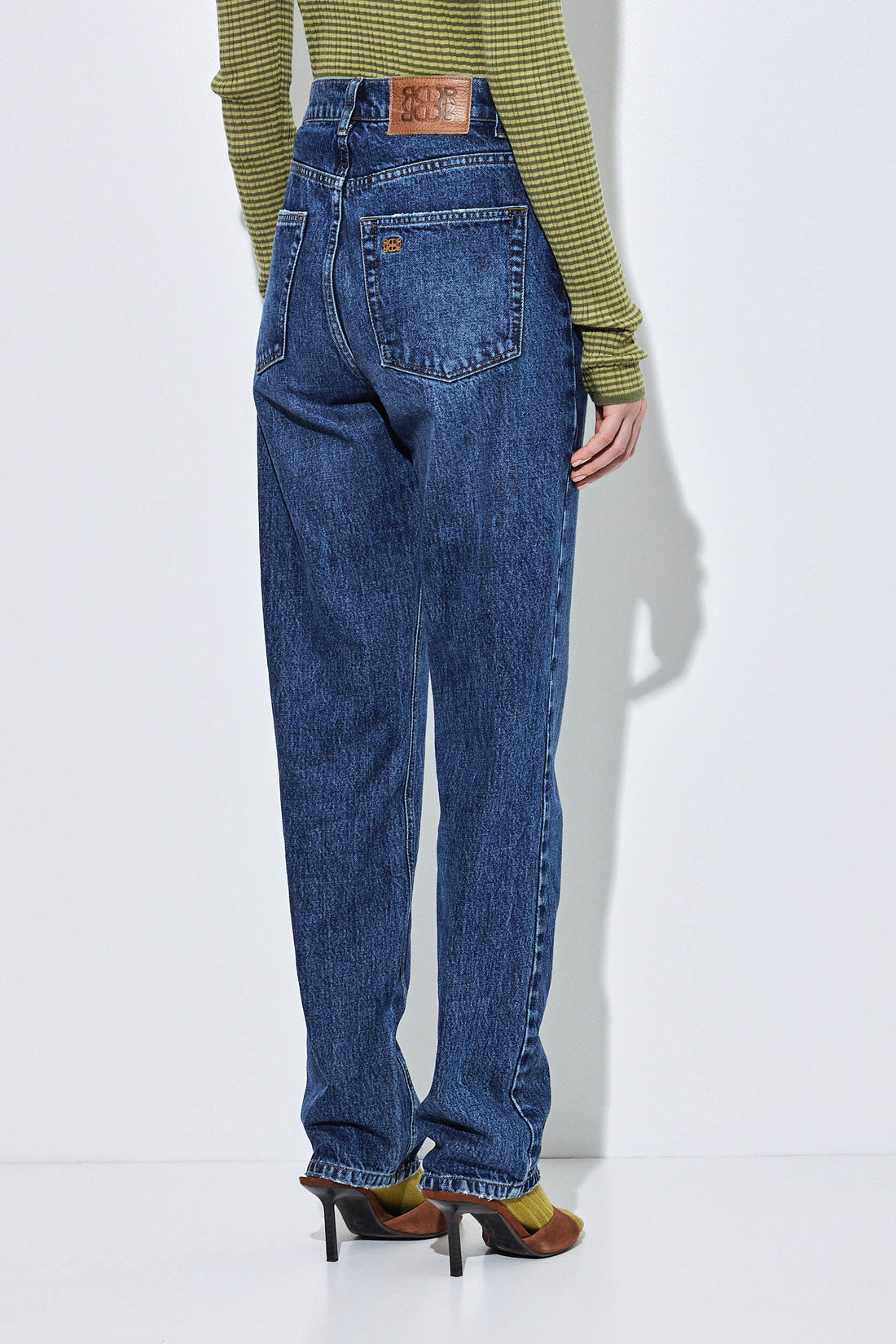 Our No.6 denim is a high waisted full length fit. An essential addition to your wardrobe. Front buttoned closure. Features a logo detail embroidered at the back pocket. Style it with your favorite basic top, a pair of hoop earrings and a kitten heel for the ultimate effortless look.