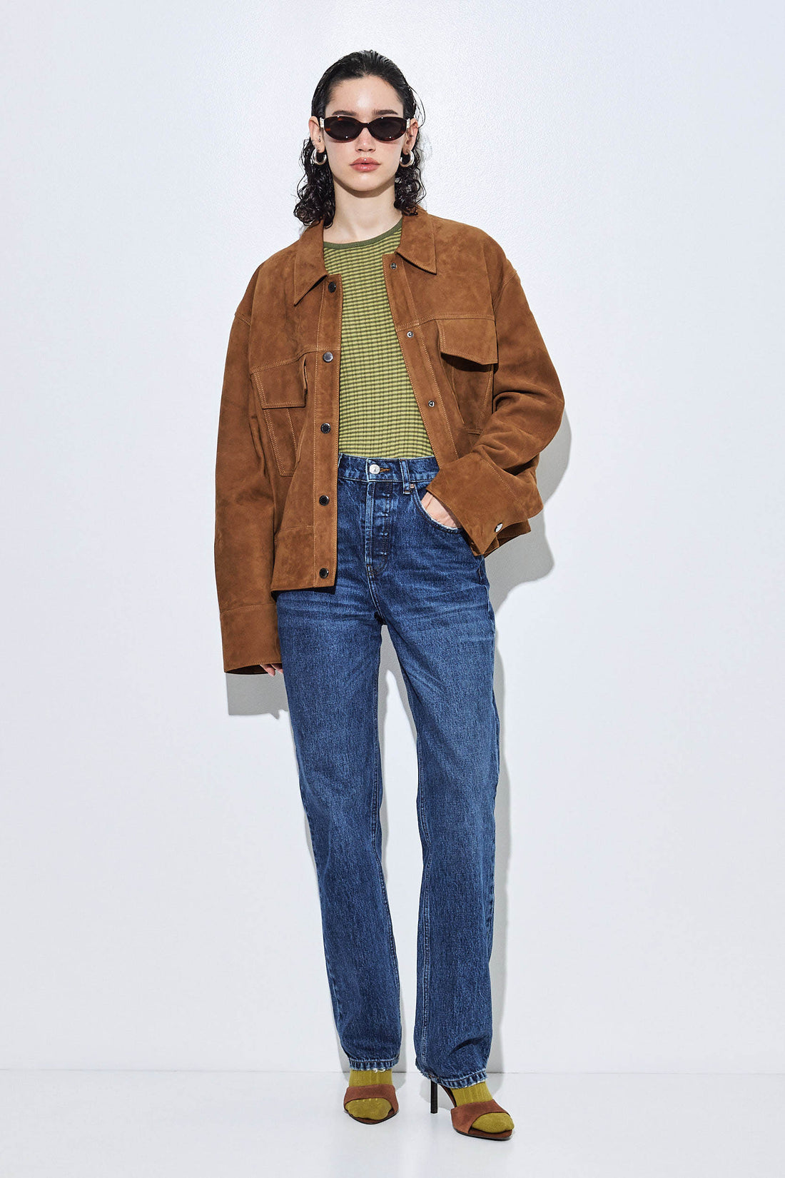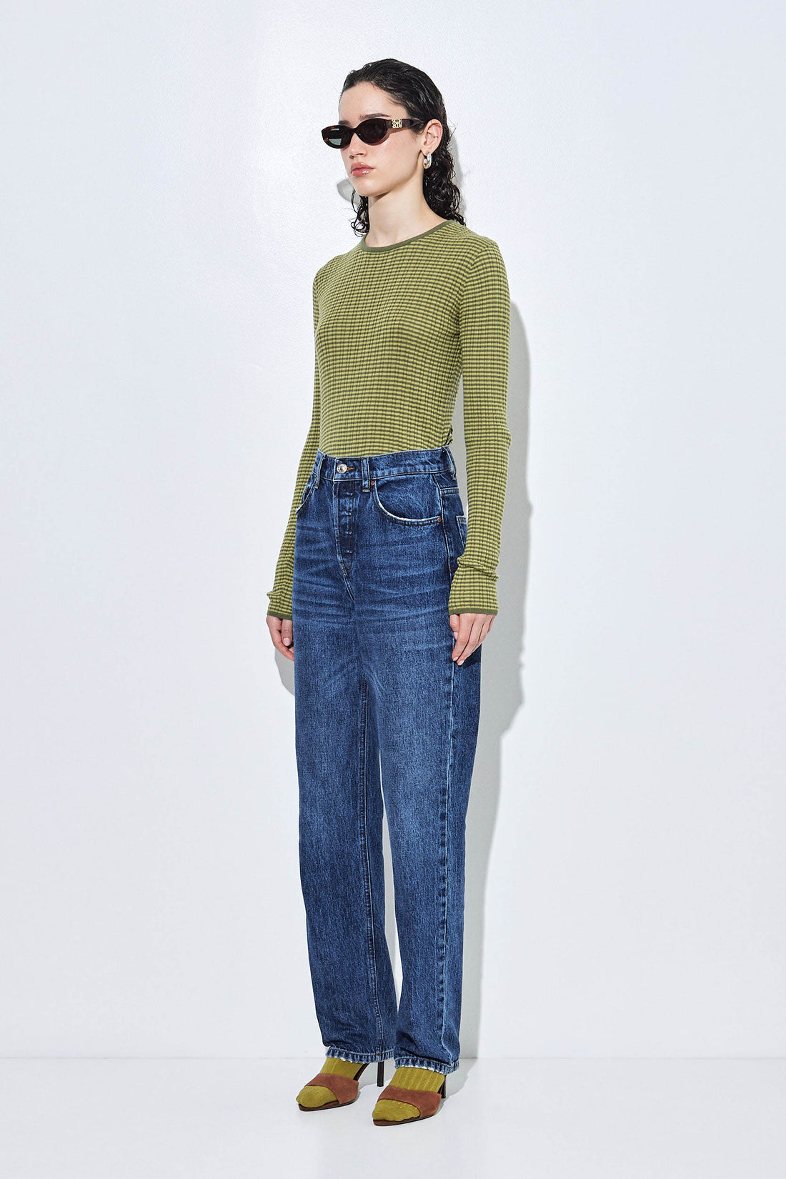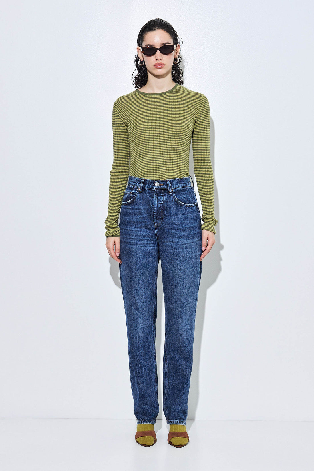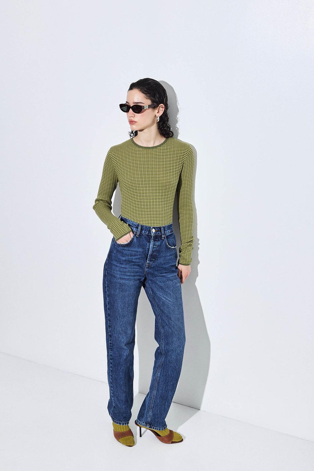 Our No.6 denim is a high waisted full length fit. An essential addition to your wardrobe. Front buttoned closure. Features a logo detail embroidered at the back pocket. Style it with your favorite basic top, a pair of hoop earrings and a kitten heel for the ultimate effortless look.