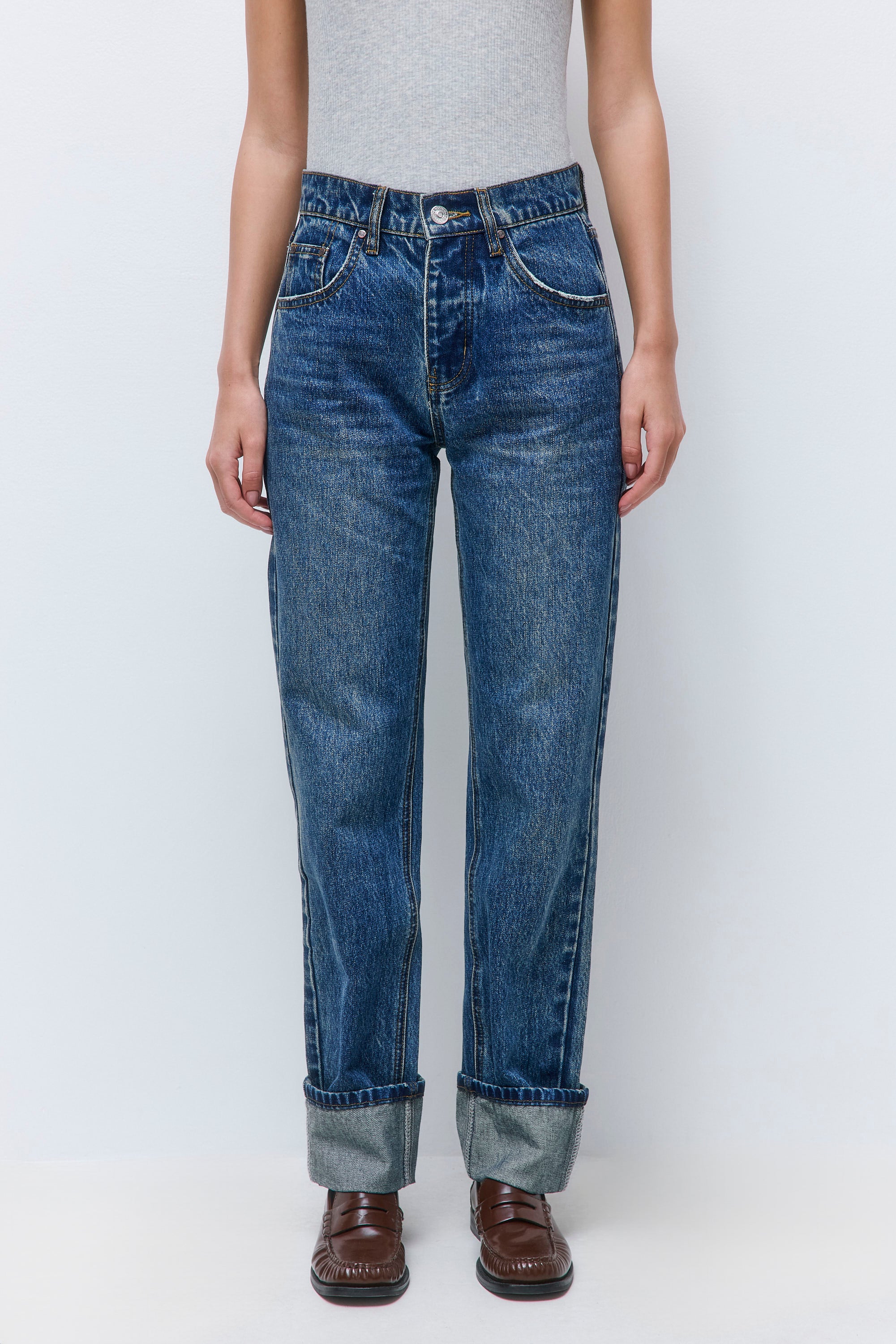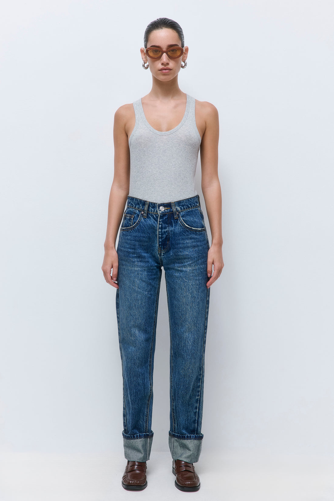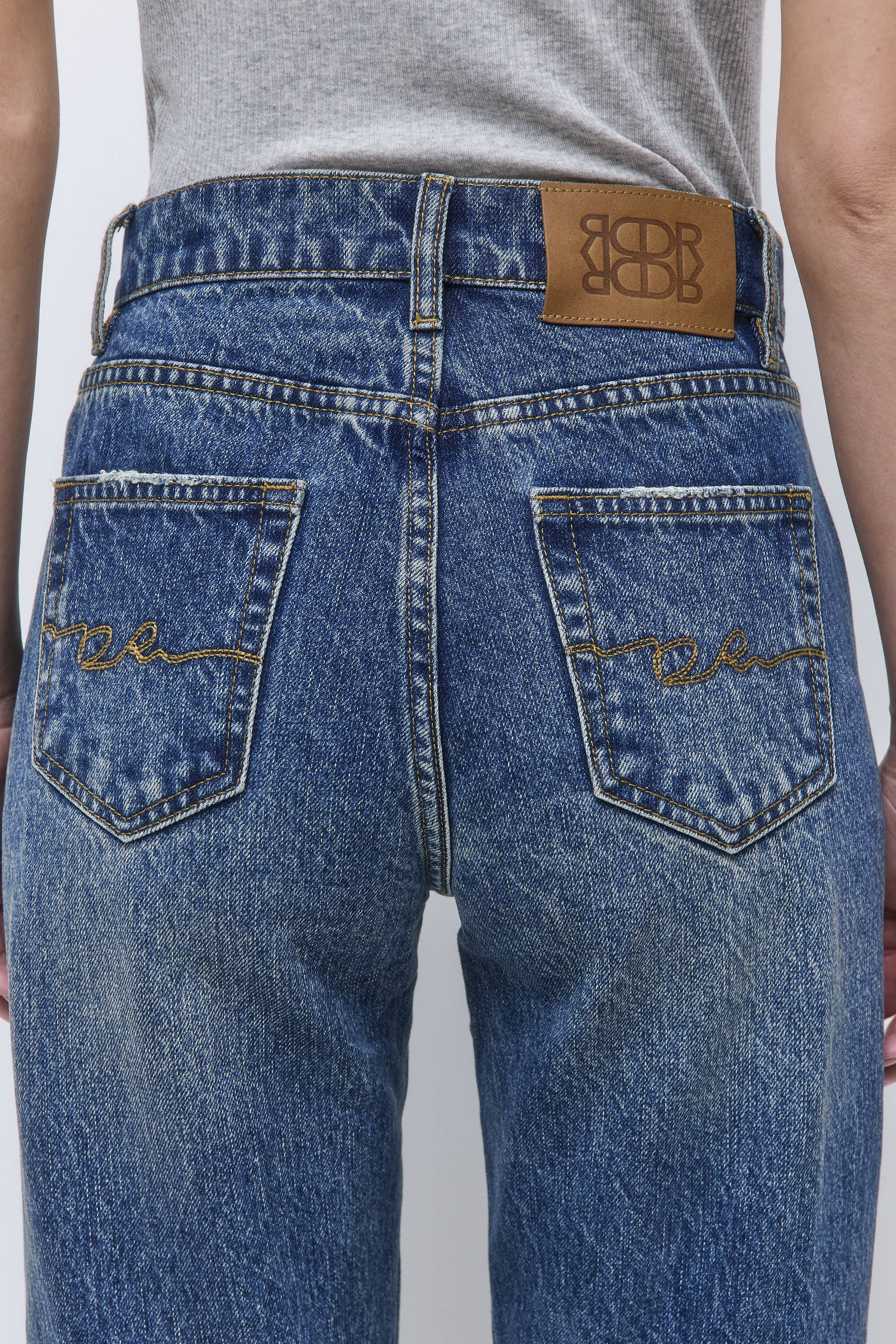 The newest addition to our iconic Denim collection. No.16 is a mid-waist, slim fit denim that combines a timeless design with an effortless silhouette. Featuring a folded hem that is left unstitched for versatile styling; can be worn cuffed or down and relaxed. Detailed with two front pockets, two back patch pockets, and a classic coin pocket. Tonal logo embroidery at the side backFinished with our signature jean buttons. Style it with our sleek Oval Sunglasses and refined Vegan Leather Denim Fit Jacket for a refined, effortless look.