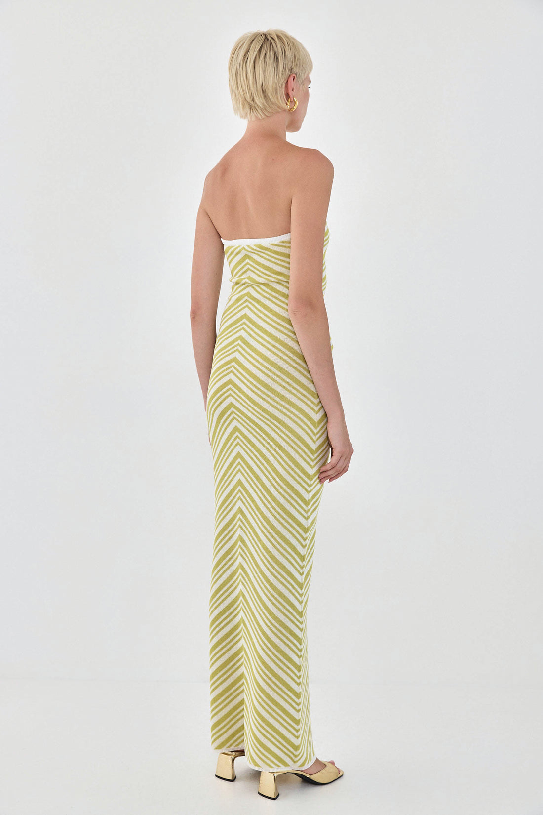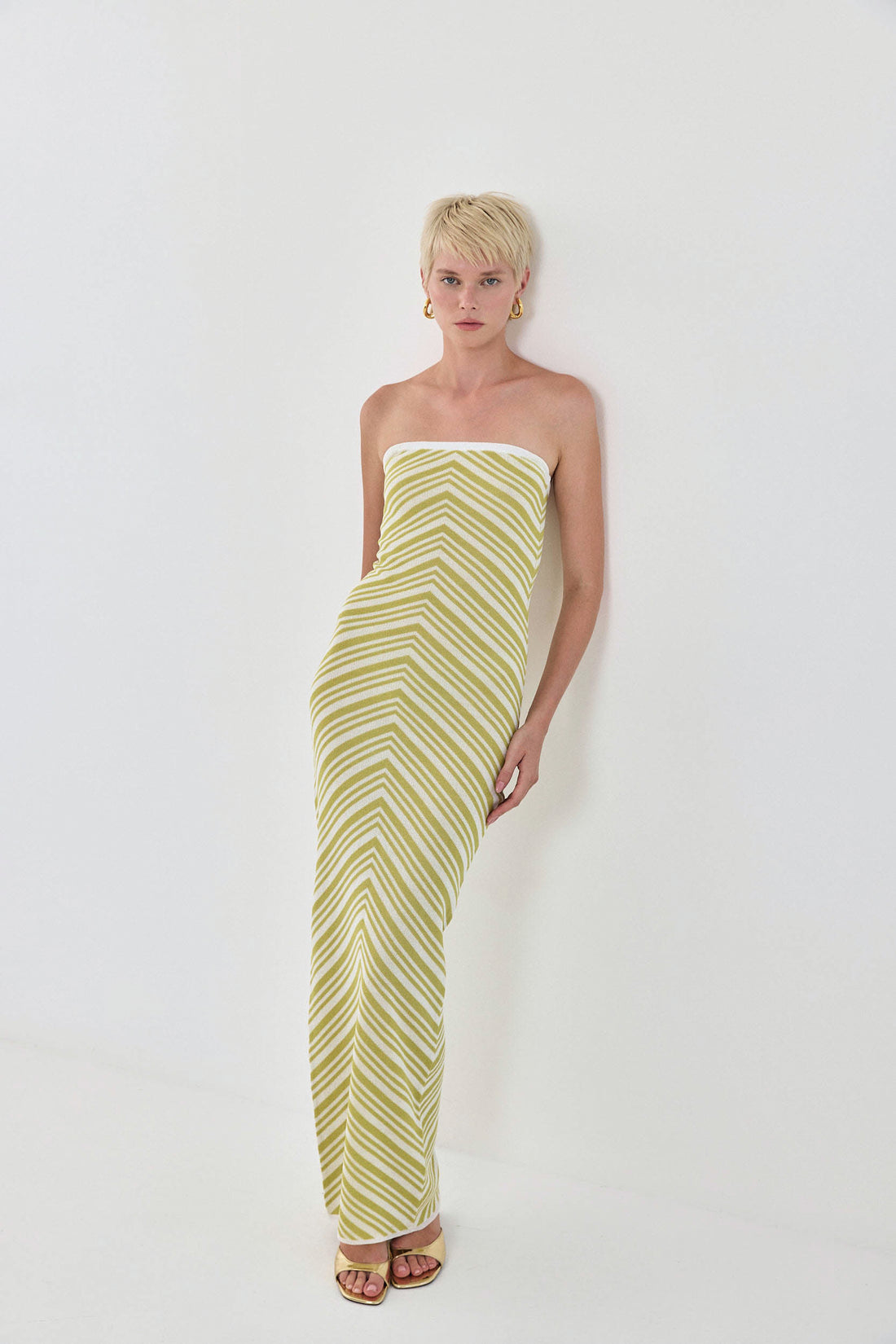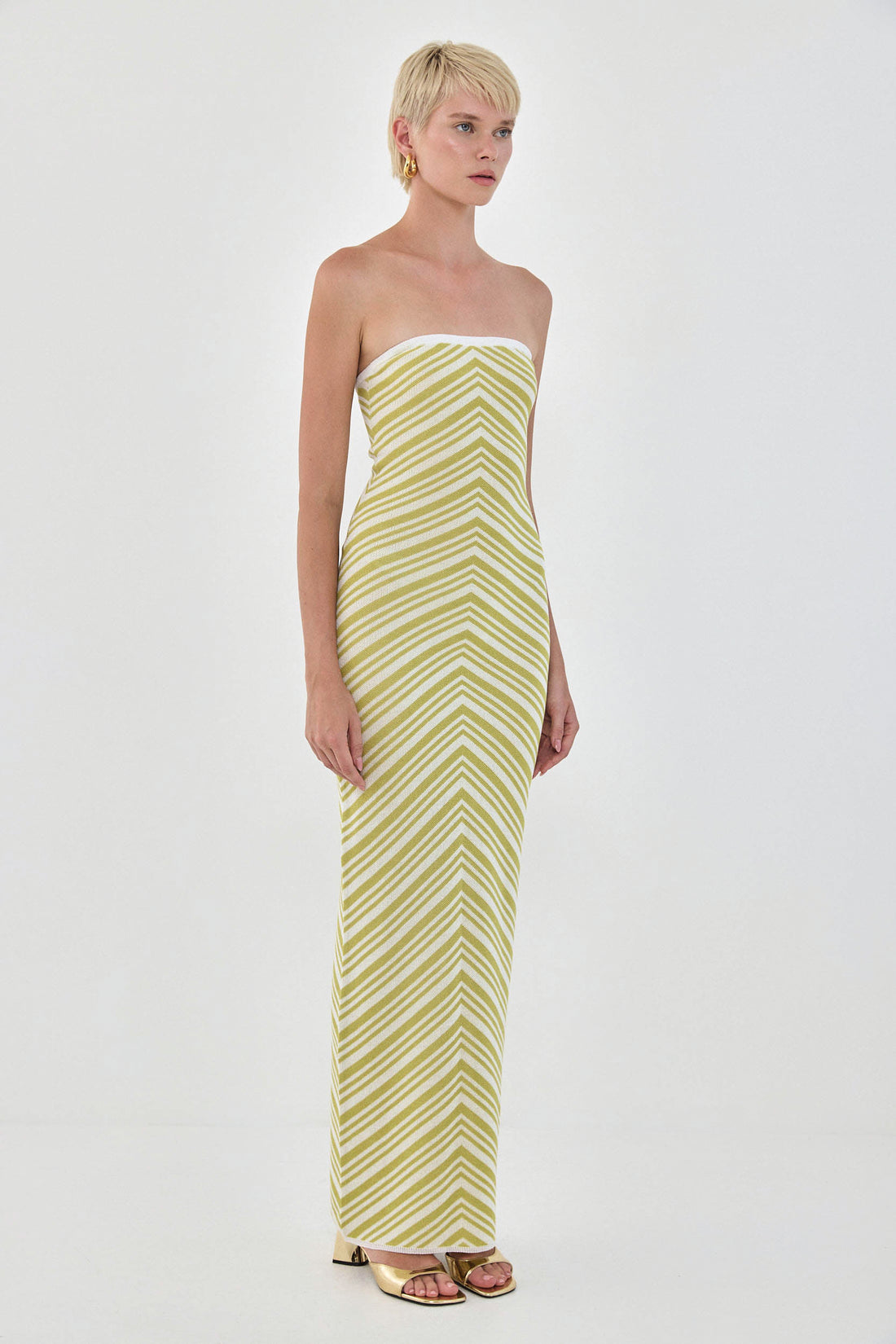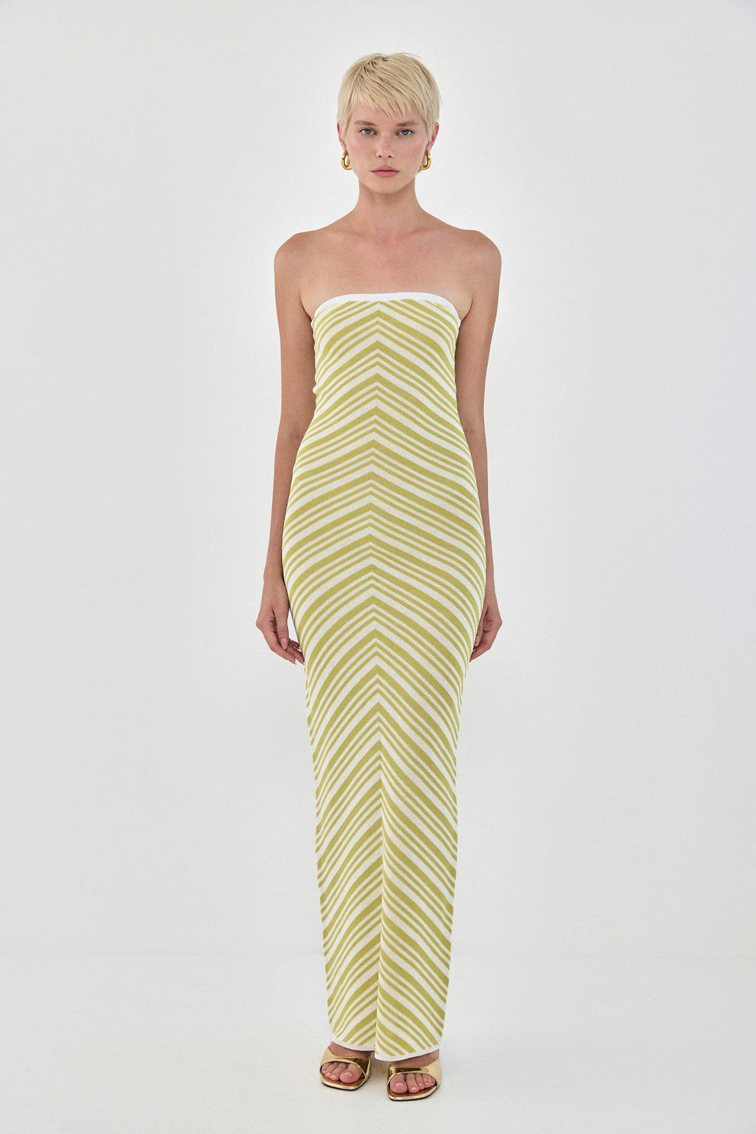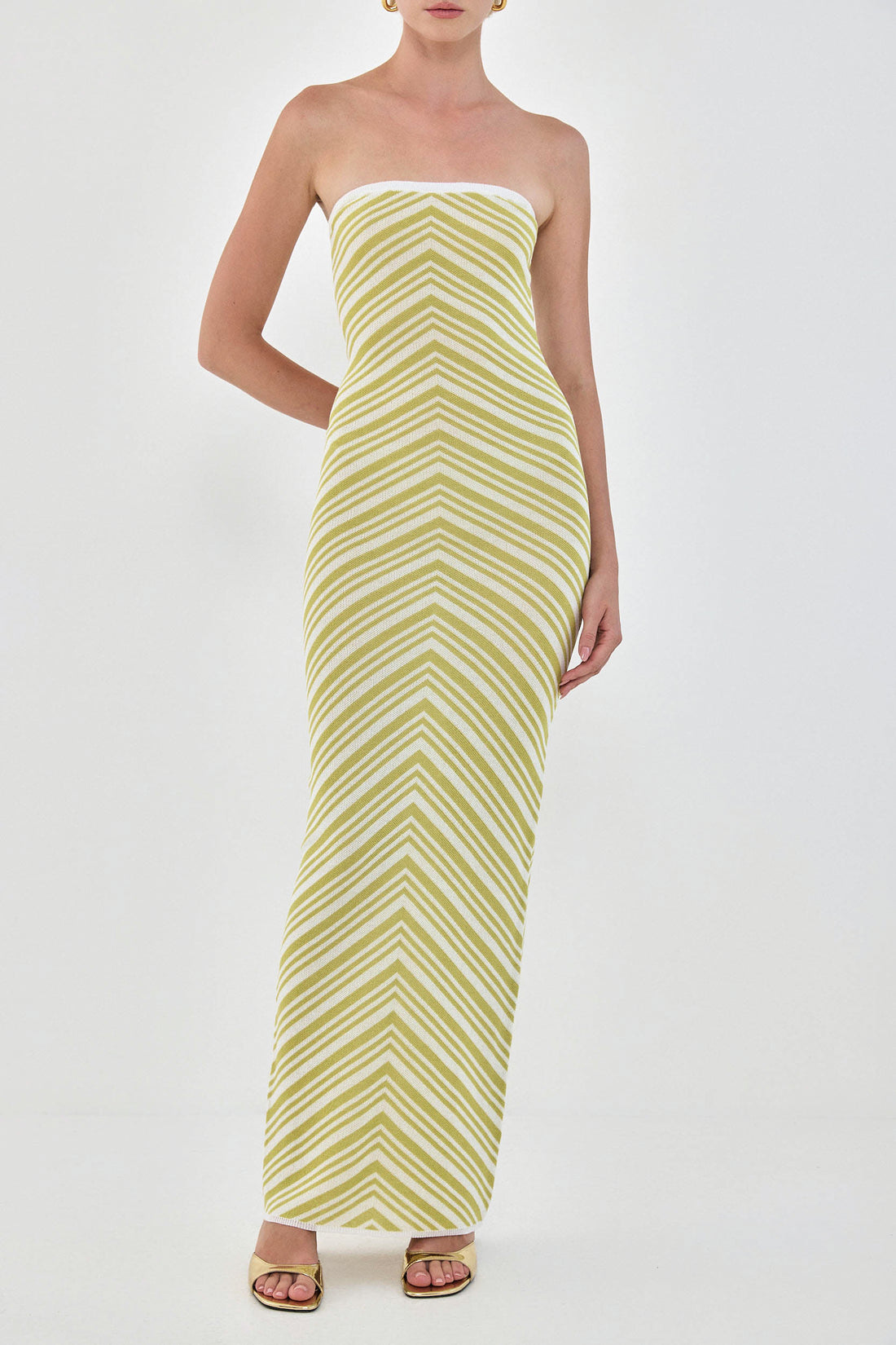 The most stylish summer knit maxi dress. Knit geometrical pattern that will make you ready to plan your next vacation. Contrast elastic band at the chest for extra grip. Hugs the body. Maxi full length. Style it with your favorite sandals and golden accents for the perfect summer pop of color.