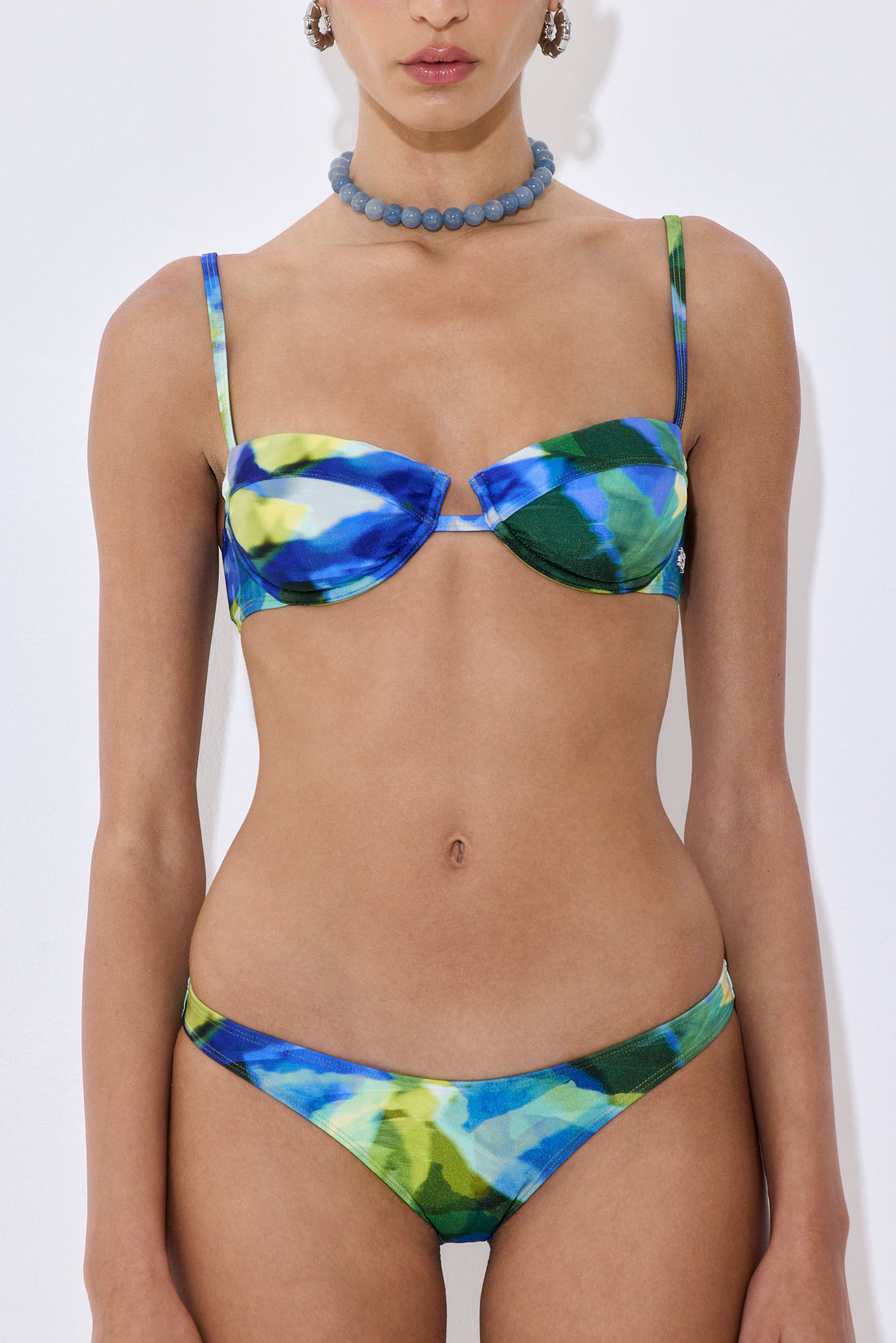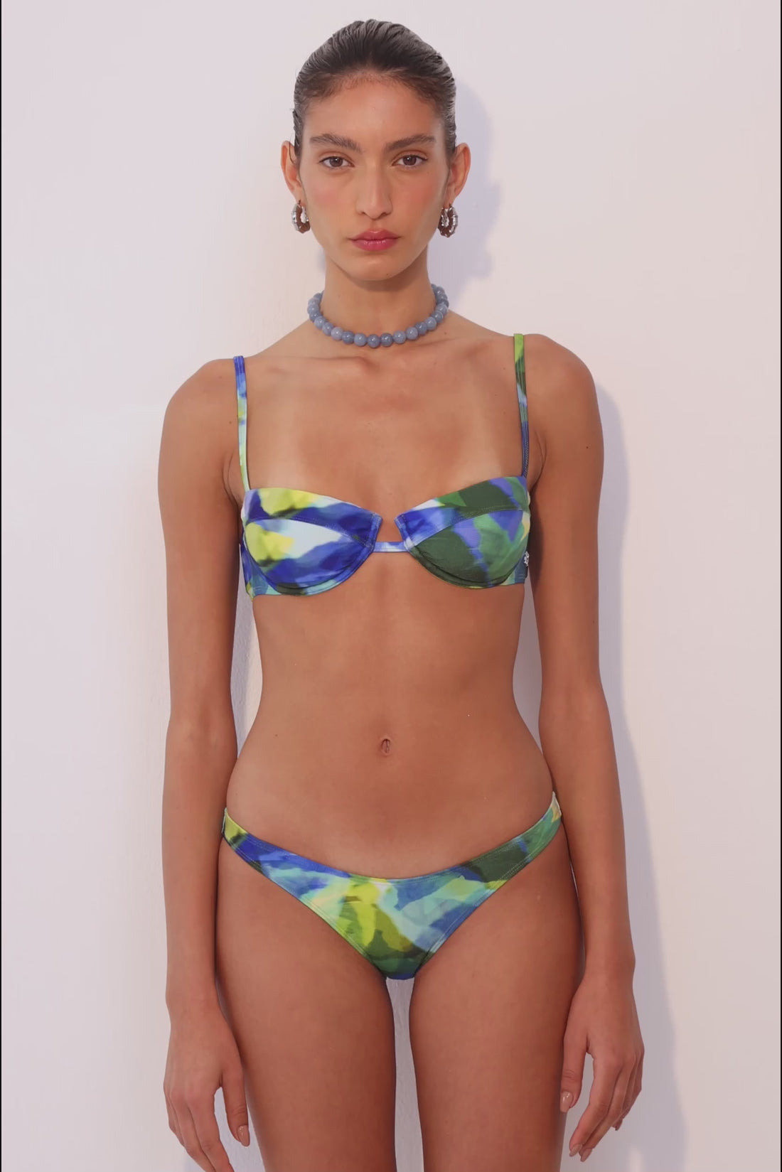 Petra, in our most special Lagoon pattern that inspired our magical swimwear collection. This piece was evoked by the raw beauty of water-sculpted stones, and was designed to enhance and support with effortless sophistication. Made from luxurious Italian fabric that contours the body for a sleek, sculpted fit. Structured underwire balconette silhouette with a modern front cut-out detail for an ultra flattering and lifted look. Available in a S+ size. Features a silver metallic logo detailing on the side. Thin adjustable shoulder straps. Secure back clasp for a customizable, supportive fit. Style it with our Alsea bottom, our shirred maxi dress, a pair of our oval sunnies and our signature claw clip for the most perfect beachy look.