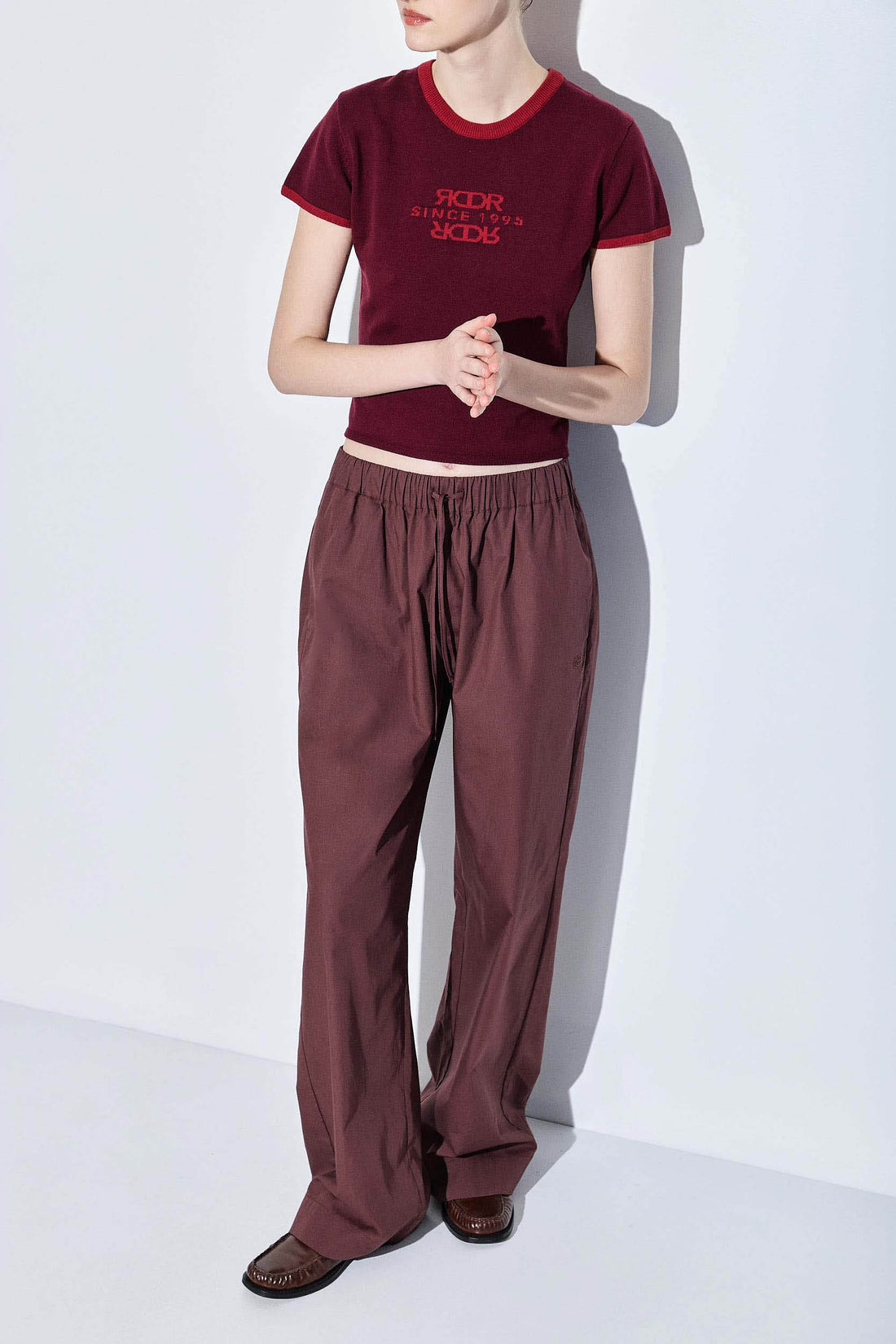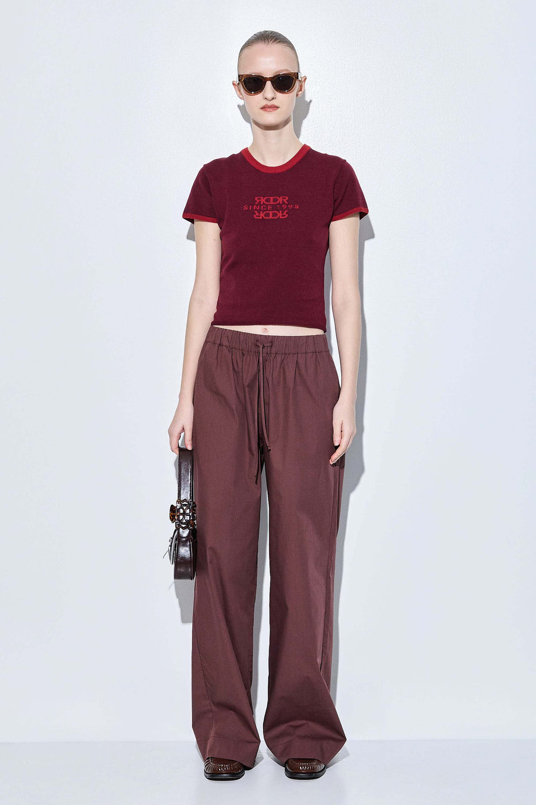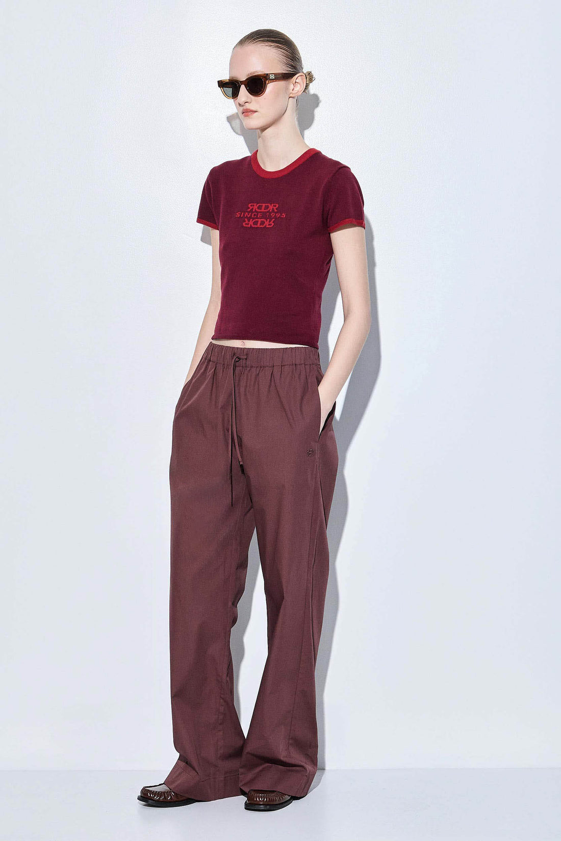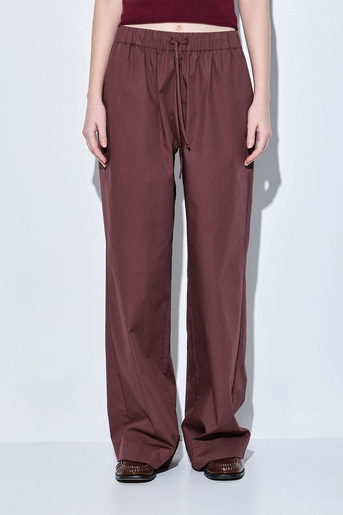 Poplin is this season's most fashionable fabric. There's nothing better than a pair of crispy, stylish long pants for summer in a perfect silhouette. Low rise long pants. Elastic waistband featuring an ultra thin drawstring closure. Two side pockets. Delicate logo embroidery detailing. Wide legged fit. Style it with a white tank top, and your favorite button down unbuttoned and add natural elements such as hints of Rattan, woven elements and golden accents, to tie the look together.