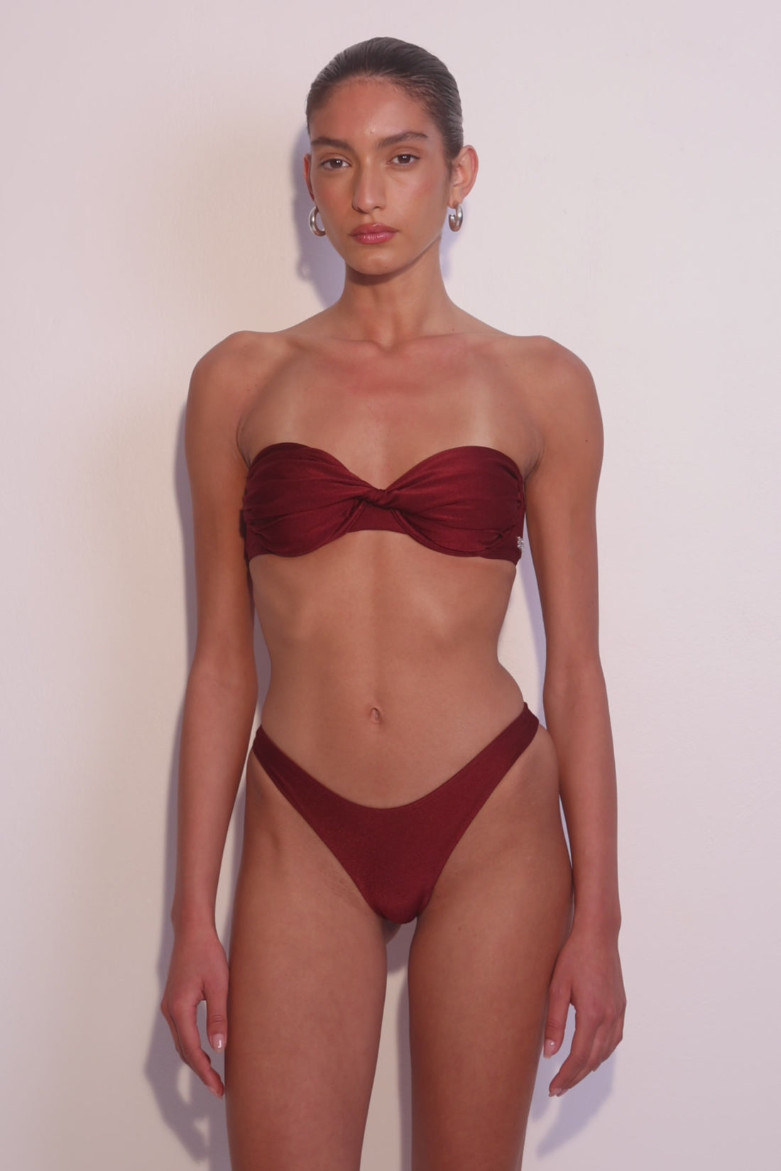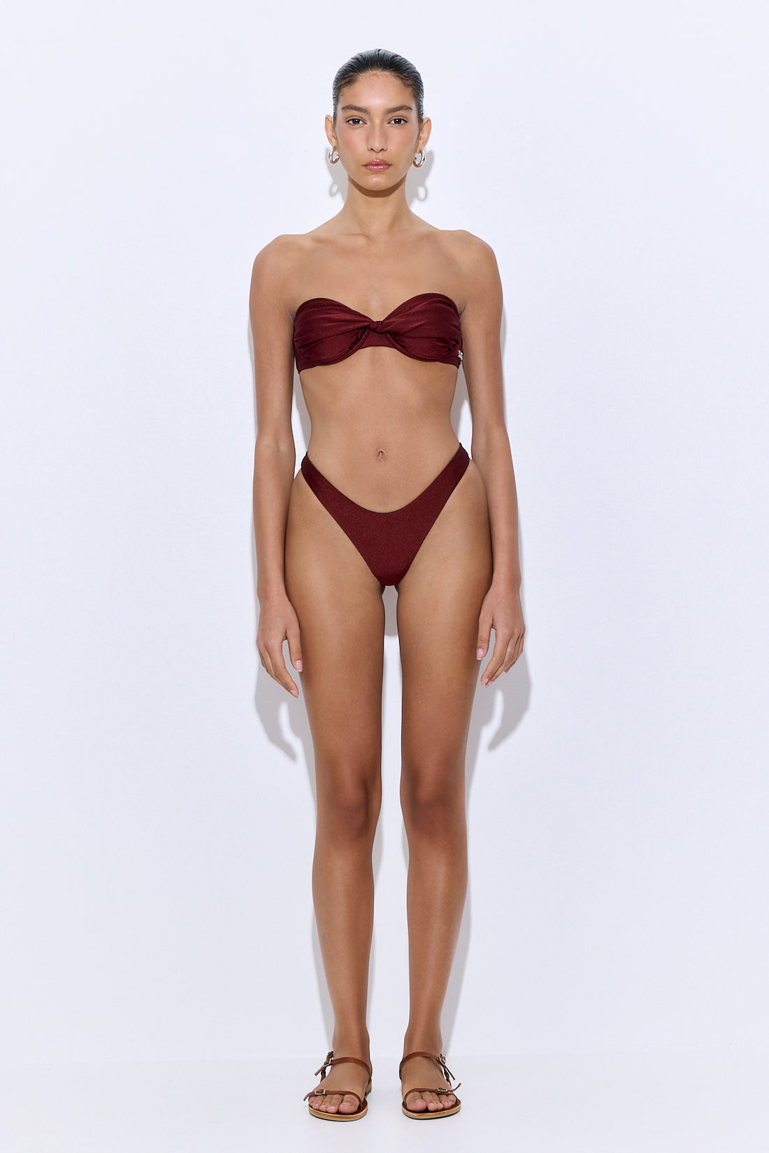 Poppy, inspired by the delicate yet bold water flower, embodies effortless beauty with a touch of allure. Made from luxurious and shiny Italian fabric that tailors perfectly to your body, offering a sleek and supportive fit. Strapless silhouette. Internal silicone band along the top part for extra grip and support. Underwired support. Available in a S+ size. Delicate twist detail on the front center. Beautiful side ruching. Silver engraved logo back clasp closure. Lined for extra coverage and support. Preparation for cups insert (no cups included). Style it with our new lotus bottom, a matching scrunchie and our beautiful shirred straps mini dress for an effortless vacation look.