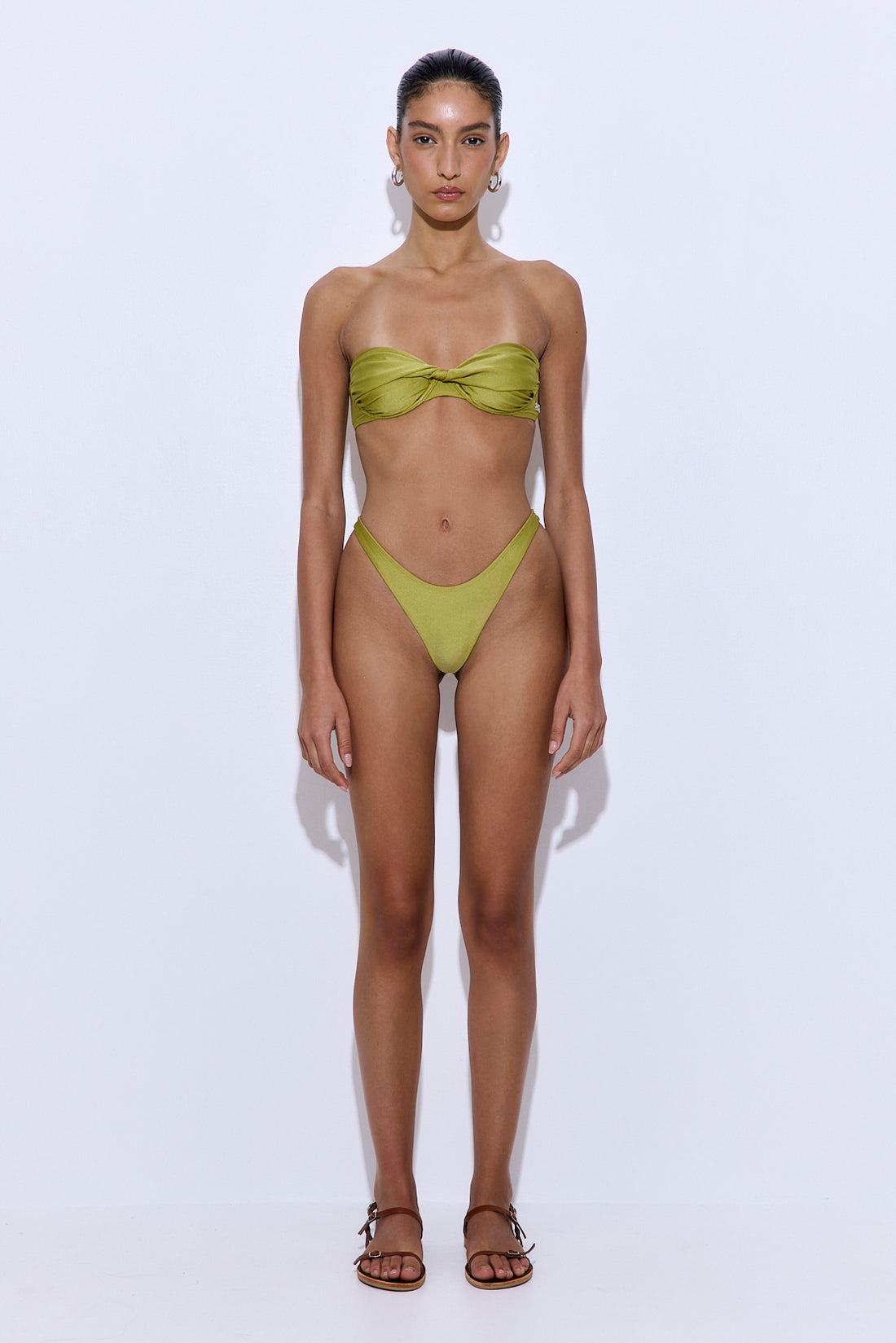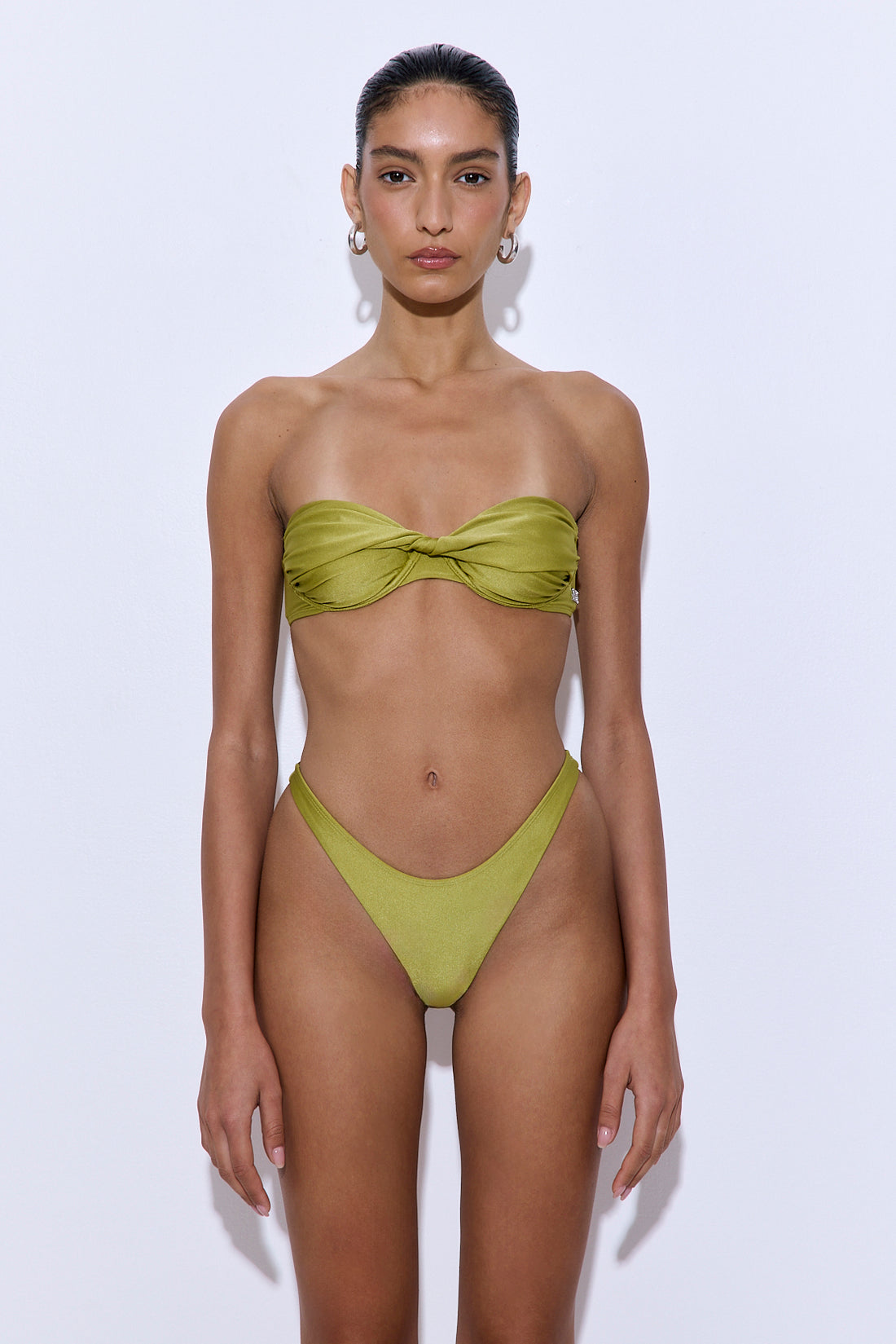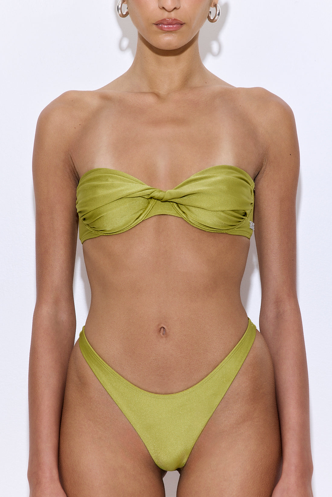 Poppy, inspired by the delicate yet bold water flower, embodies effortless beauty with a touch of allure. Made from luxurious and shiny Italian fabric that tailors perfectly to your body, offering a sleek and supportive fit. Strapless silhouette. Internal silicone band along the top part for extra grip and support. Underwired support. Available in a S+ size. Delicate twist detail on the front center. Beautiful side ruching. Silver engraved logo back clasp closure. Double lined for extra support and non sheer look. Preparation for cups insert (no cups included). Style it with our new lotus bottom, a matching scrunchie and our beautiful shirred straps mini dress for an effortless vacation look.