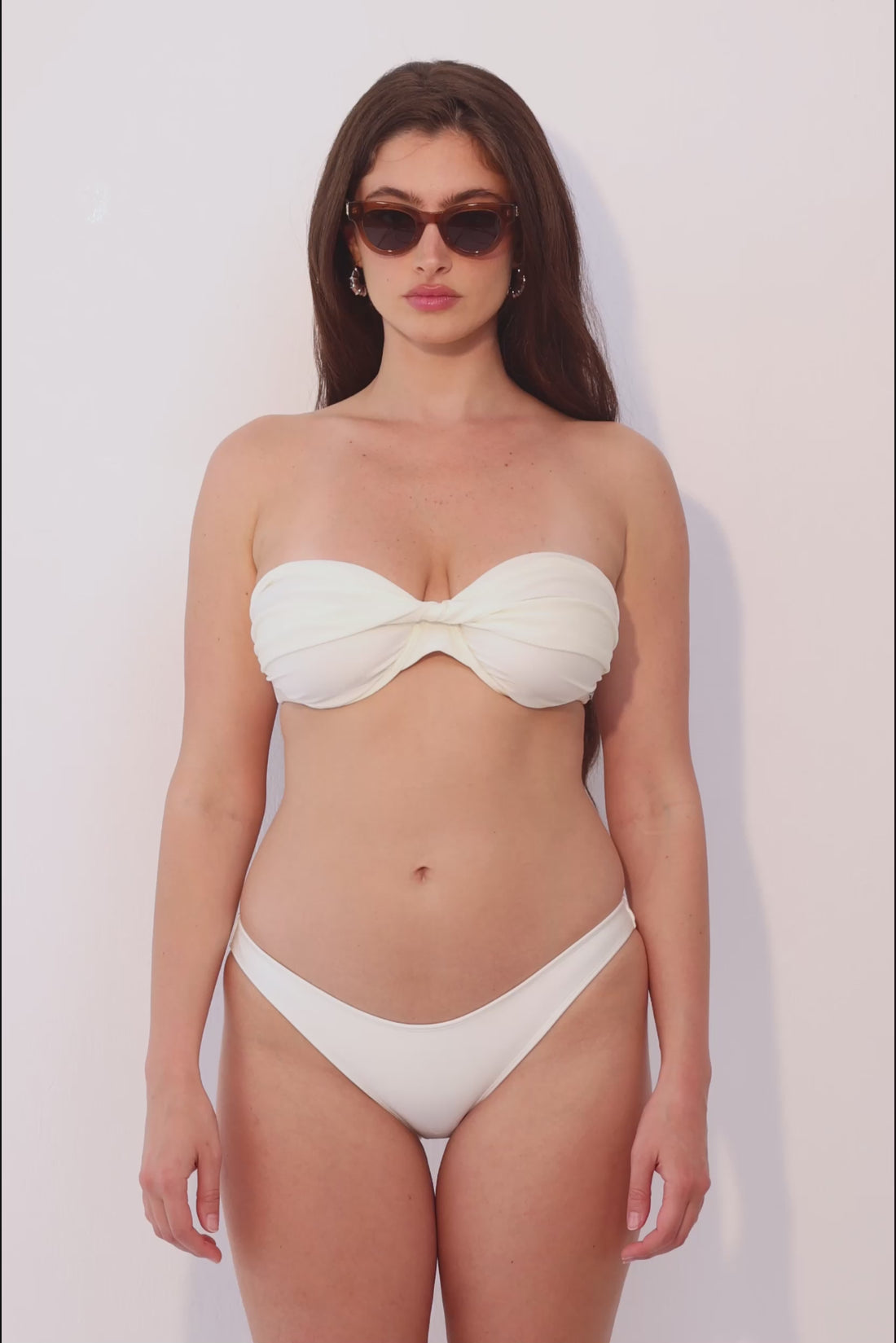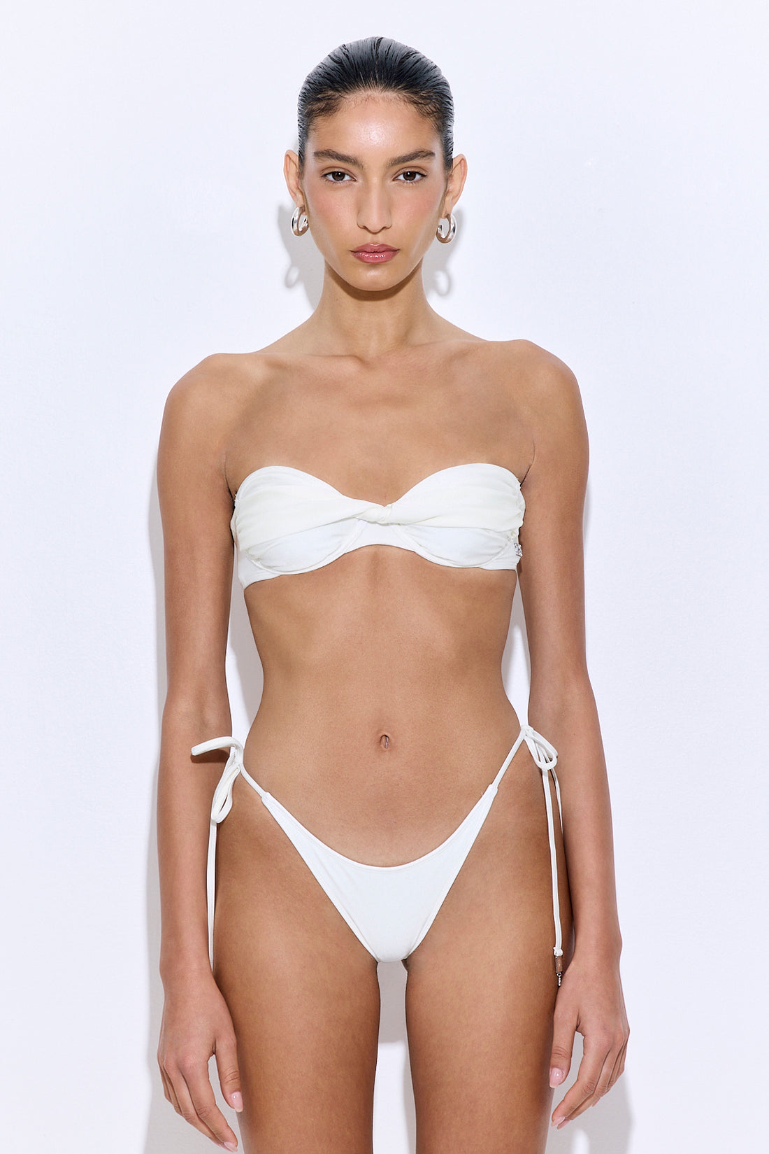 Poppy, inspired by the delicate yet bold water flower, embodies effortless beauty with a touch of allure. Made from luxurious and shiny Italian fabric that tailors perfectly to your body, offering a sleek and supportive fit. Strapless silhouette. Internal silicone band along the top part for extra grip and support. Underwired support. Available in a S+ size. Delicate twist detail on the front center. Beautiful side ruching. Silver engraved logo back clasp closure. Double lined for extra support and non sheer look. Preparation for cups insert (no cups included). Style it with our new lotus bottom, a matching scrunchie and our beautiful shirred straps mini dress for an effortless vacation look.