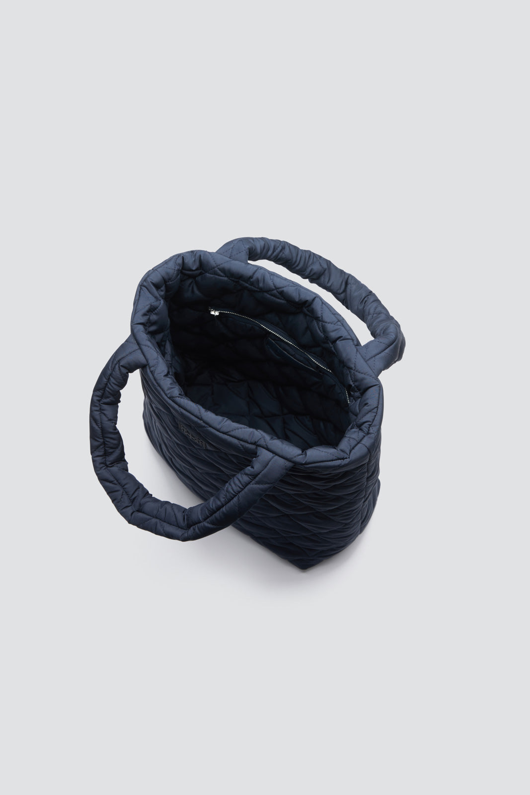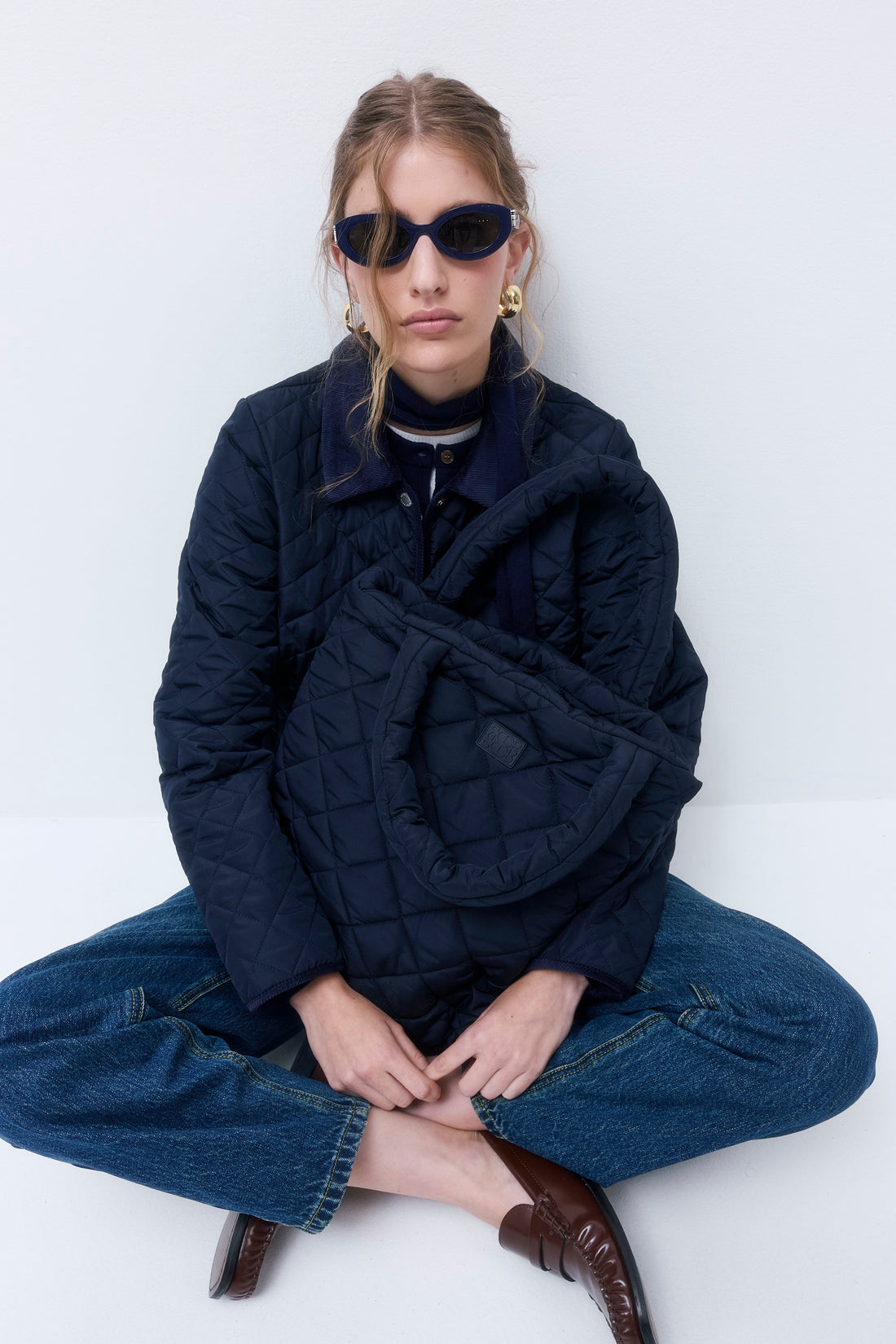 The newest addition to our Quilt Carry All Bags; versatile sizes for everyday use. Boxy. Diamond pattern. Unlined. Tonal silicon logo. Features two inside pockets; one patch pocket, one zipper pocket. Debossed tonal faux leather patch on the inside. Can carry up to 4KG. Style it with our new effortless Lounge Set and chic Cat Eye Sunglasses for an elevated, everyday look.