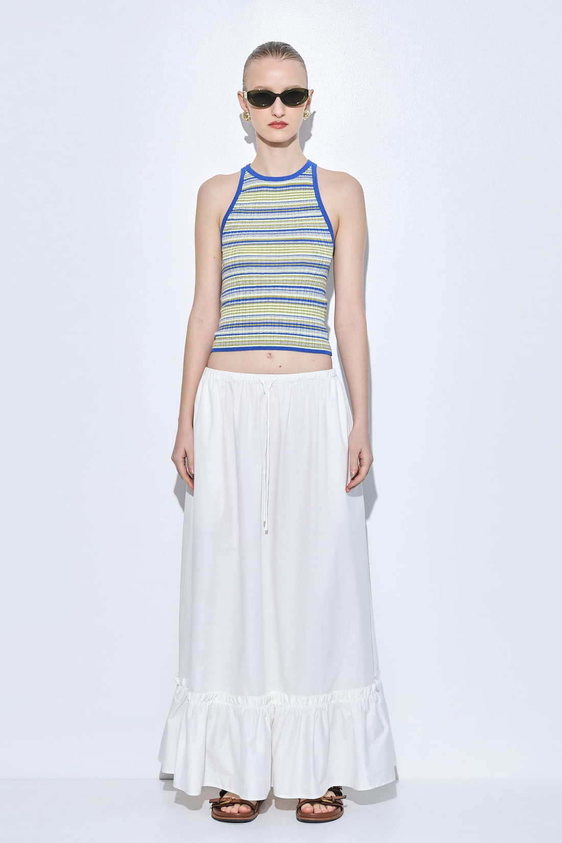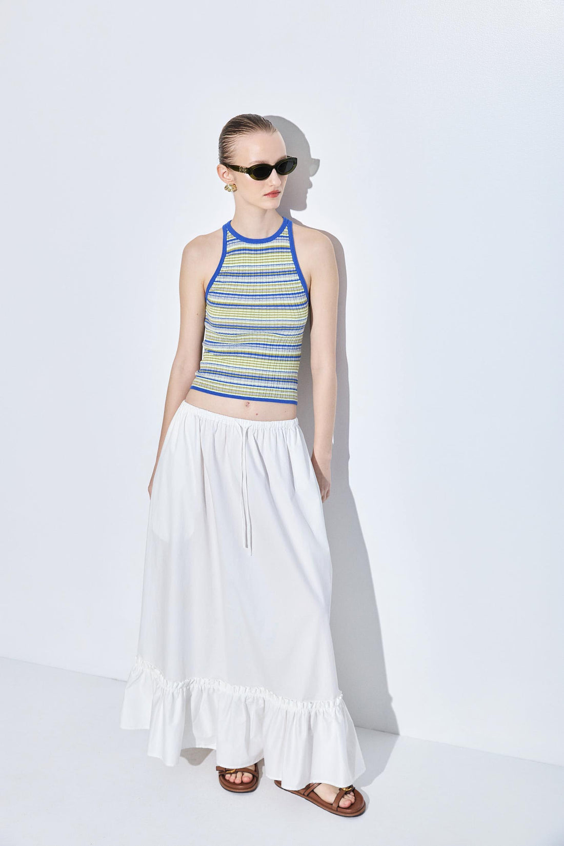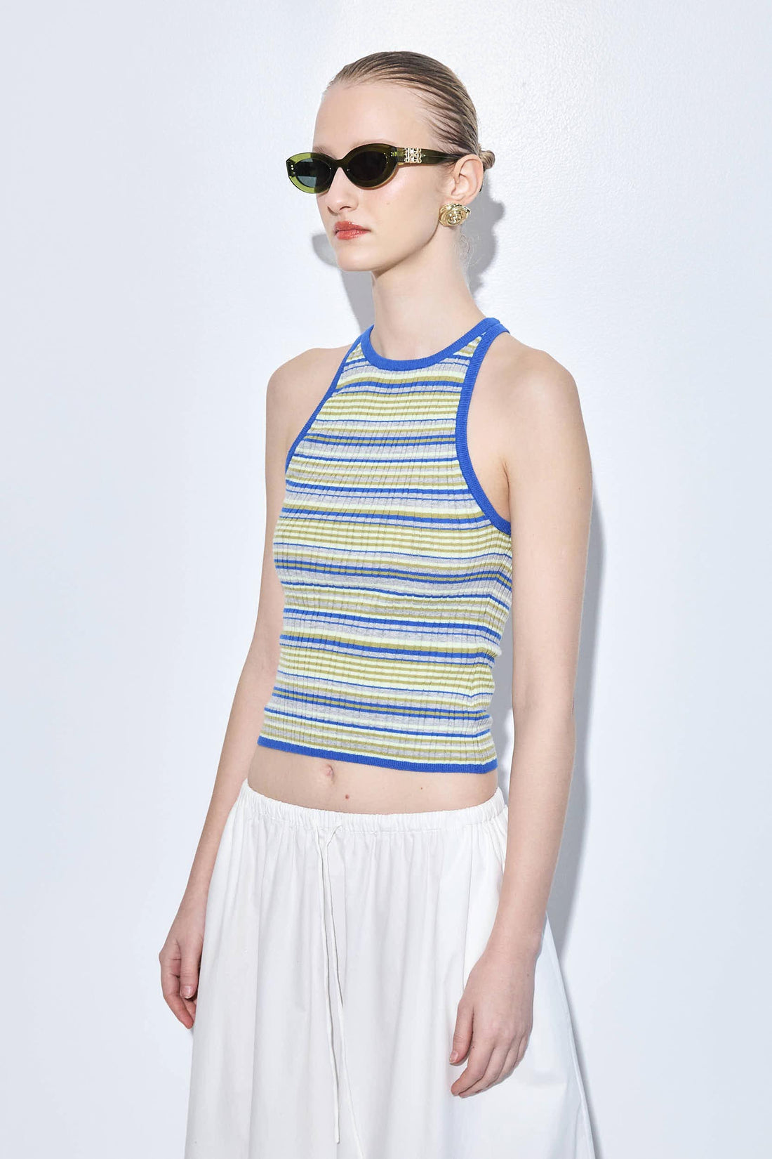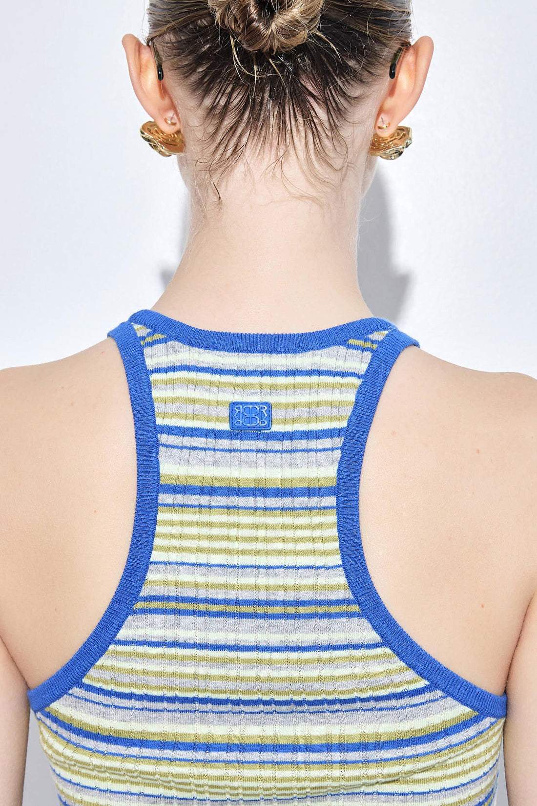 Your go to summer essential. Lightweight and breathable ribbed fabric. Delicate crew neck. ribbed finish. Features a tonal silicone squared logo patch at the upper back. Gently skims the body for a flattering, easy fit. Style it with our new linen mid rise pants, a matching scrunchie and our round sunglasses for an everyday beautiful look.