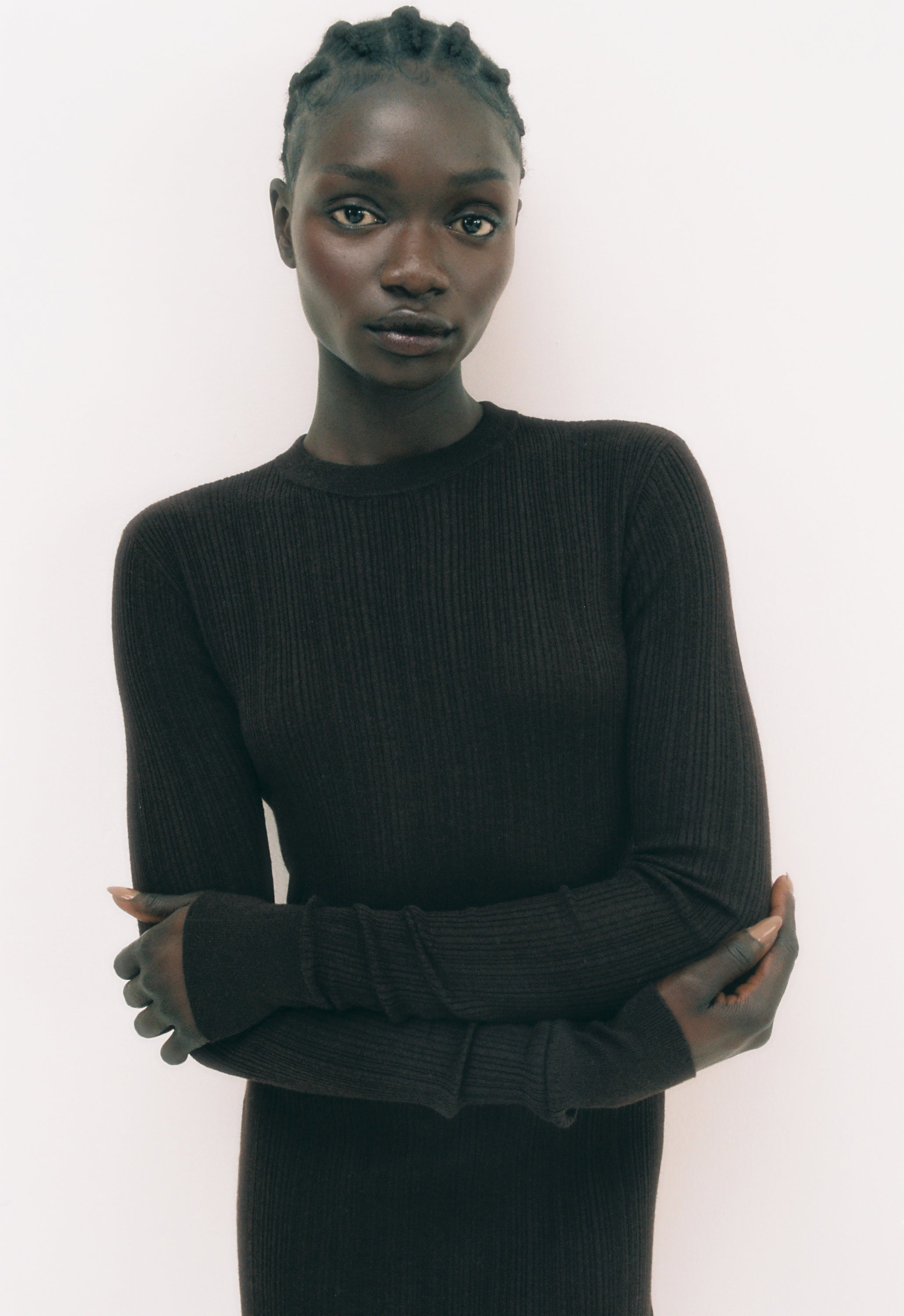 Your go-to dress for effortless chic. Ribbed mini dress with long sleeves. Round neckline. Fitted silhouette. Finished with a wide ribbed hem. Style it with our iconic Oversized Double Breasted Daddy Blazer and our chic Yvon Shoulder Bag for a refined look.