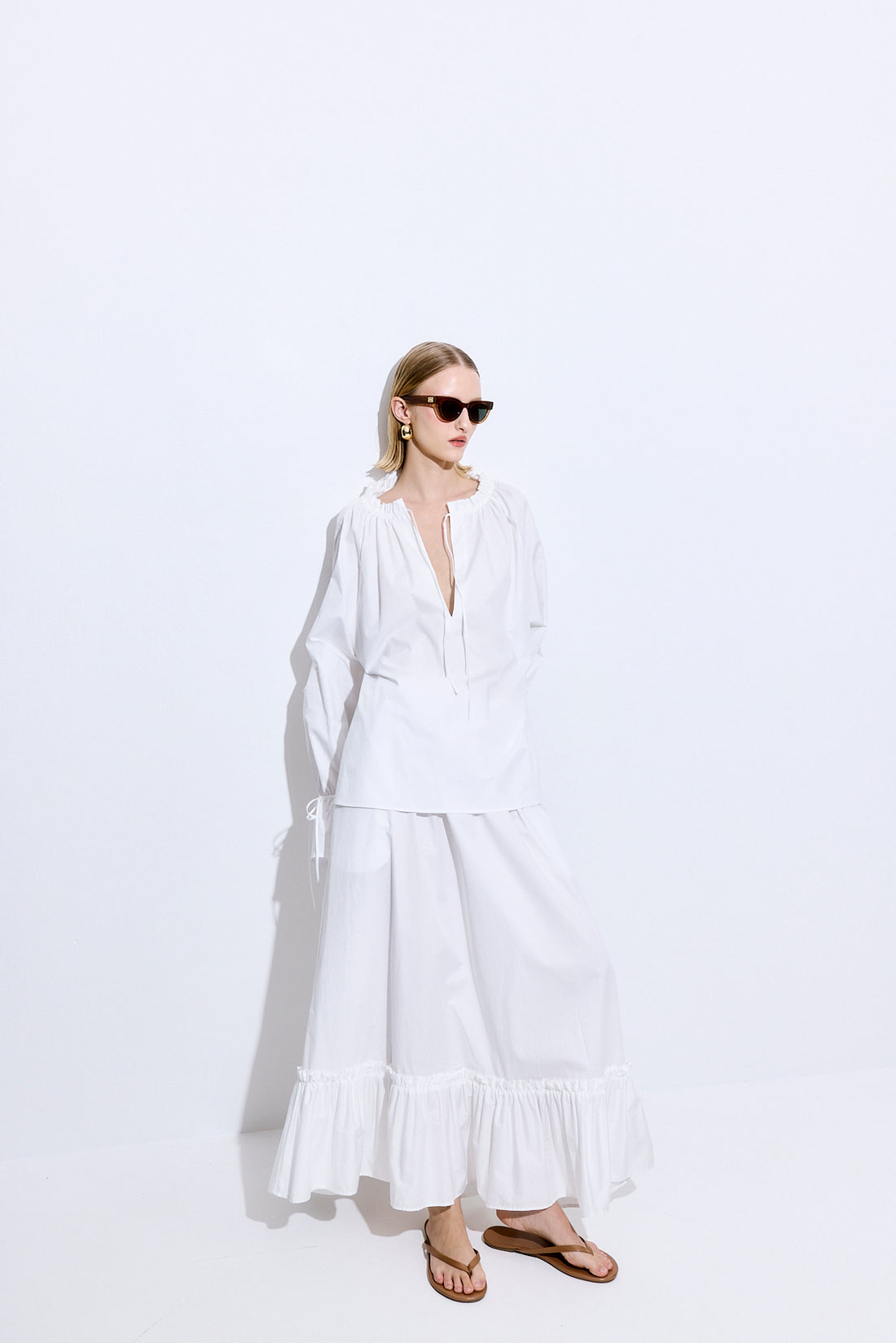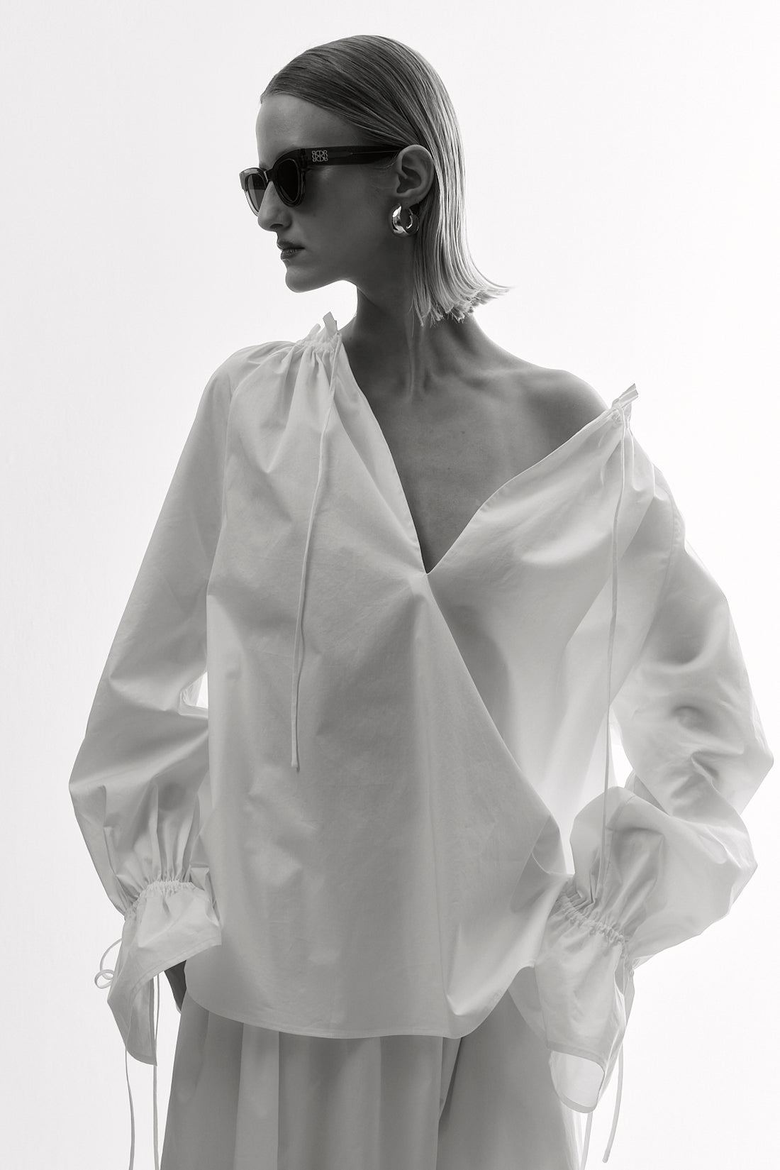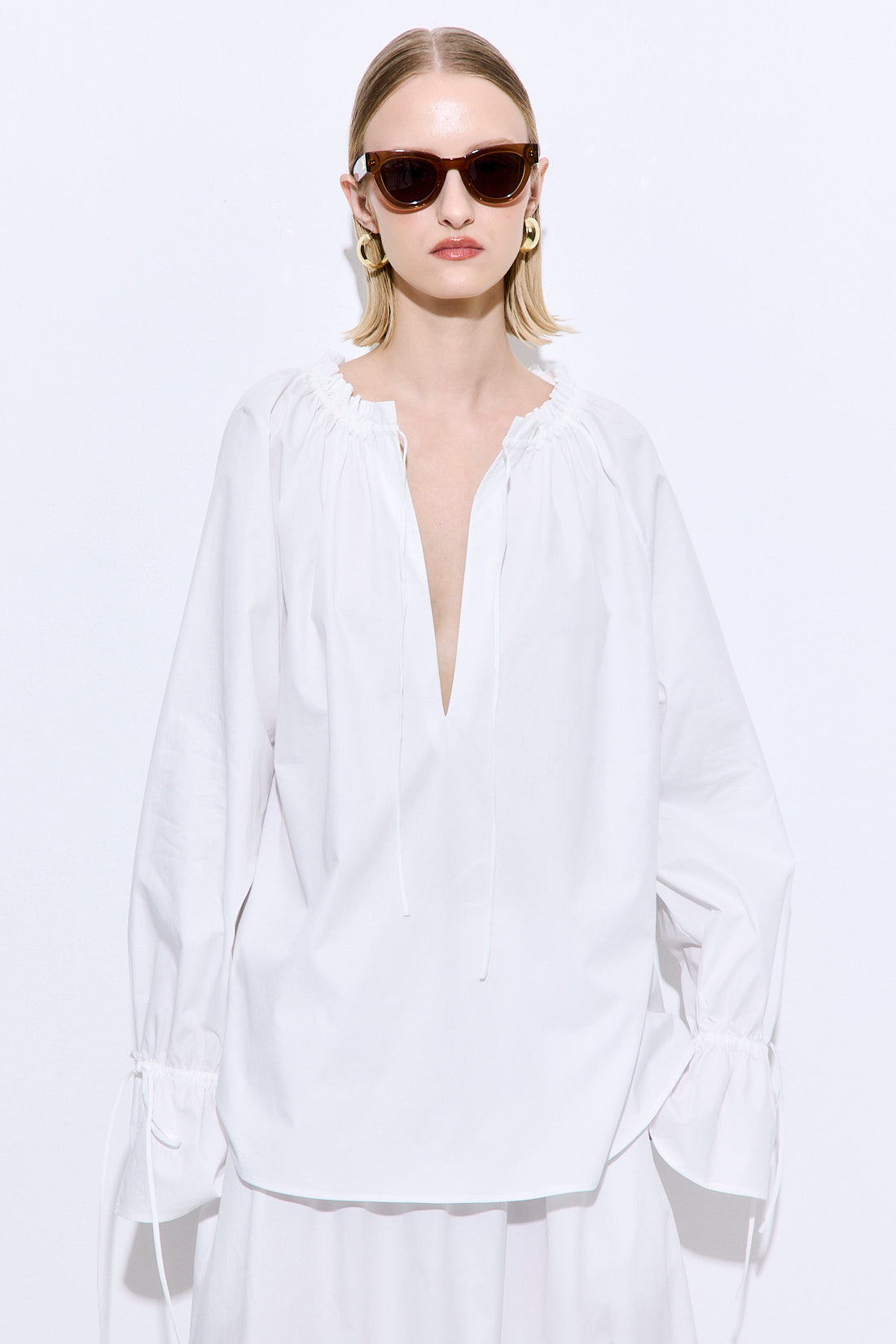 Our new Ruffled Poplin Blouse is an effortless essential with a modern, feminine twist. Crafted from crisp, lightweight poplin with a soft structure. Features a gathered neckline with a deep V-slit and delicate tie closure. Voluminous long sleeves finished with romantic ruffled cuffs and adjustable ties. Clean, relaxed silhouette for an easy yet elevated look. Style it with our matching poplin skirt and oval sunglasses for a fresh, statement outfit.