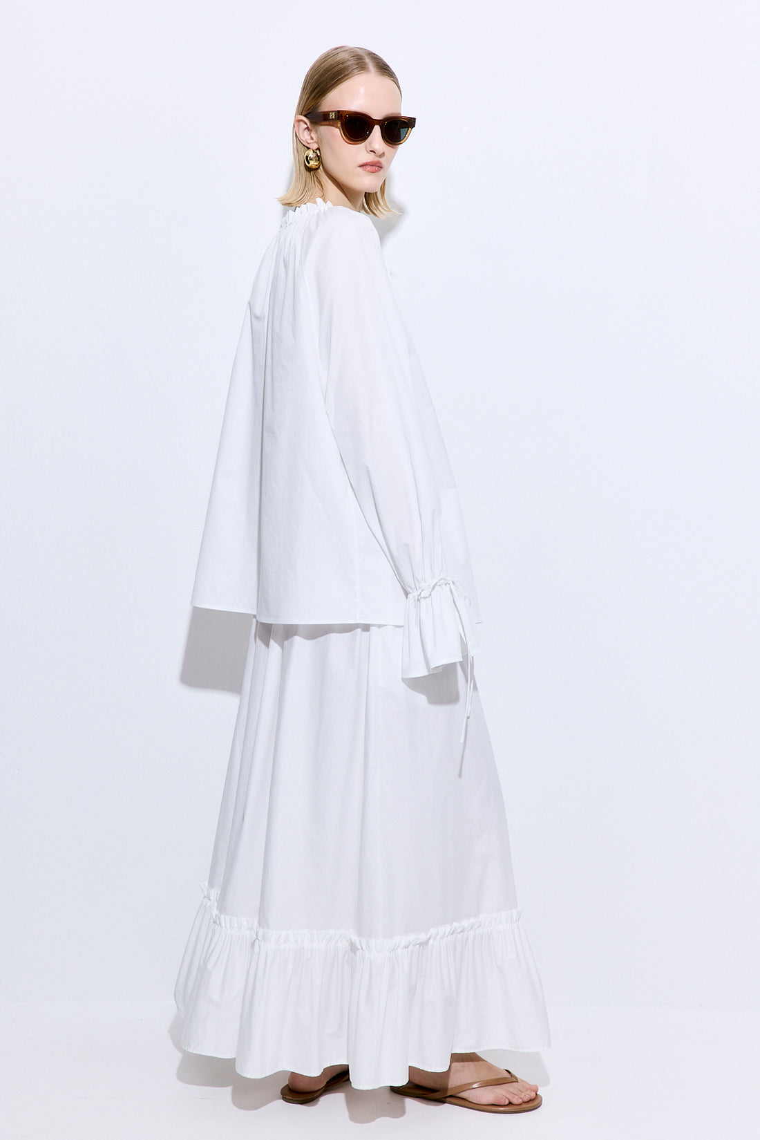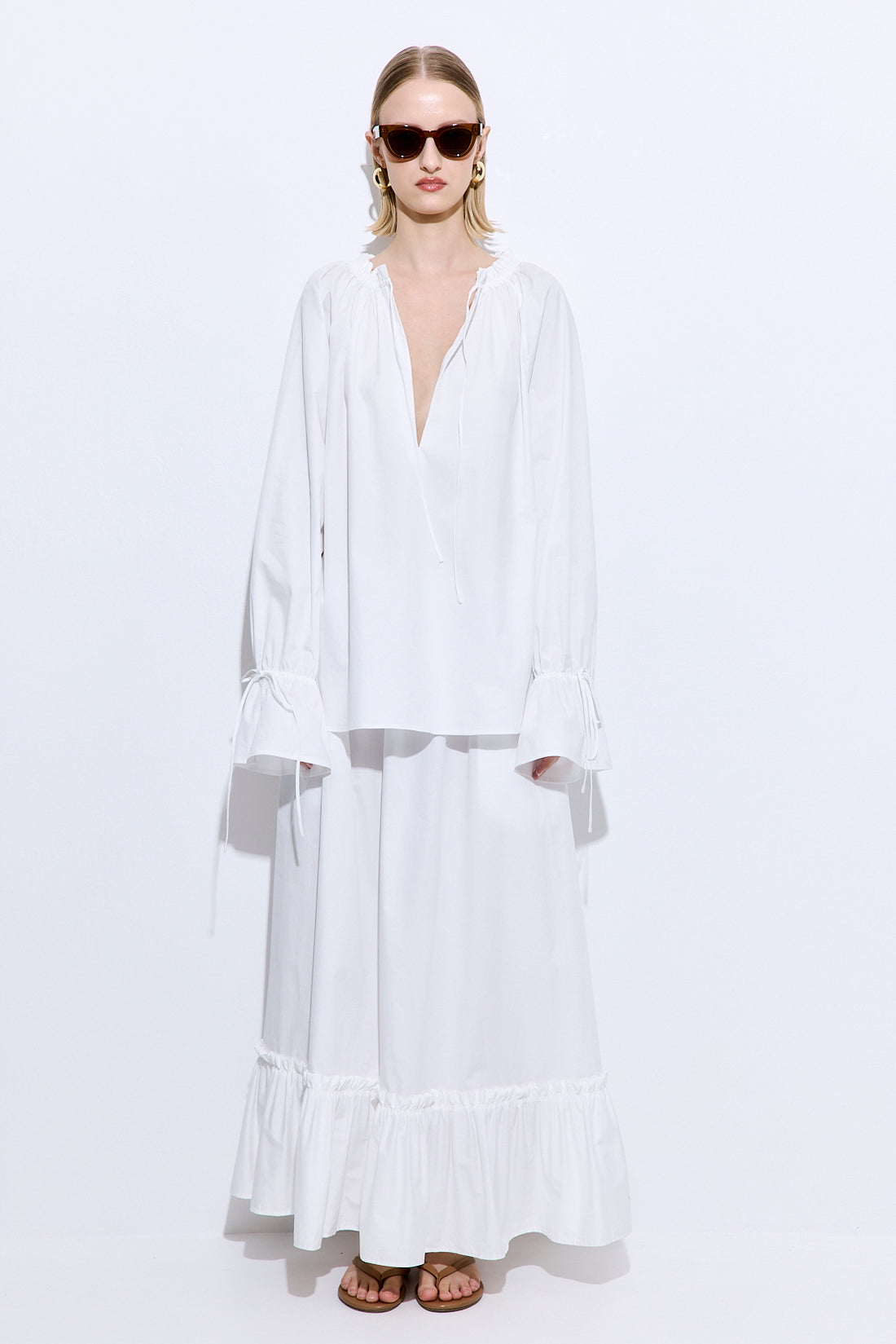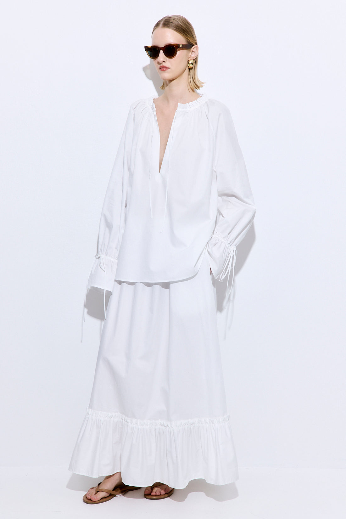 Our new Ruffled Poplin Blouse is an effortless essential with a modern, feminine twist. Crafted from crisp, lightweight poplin with a soft structure. Features a gathered neckline with a deep V-slit and delicate tie closure. Voluminous long sleeves finished with romantic ruffled cuffs and adjustable ties. Clean, relaxed silhouette for an easy yet elevated look. Style it with our matching poplin skirt and oval sunglasses for a fresh, statement outfit.