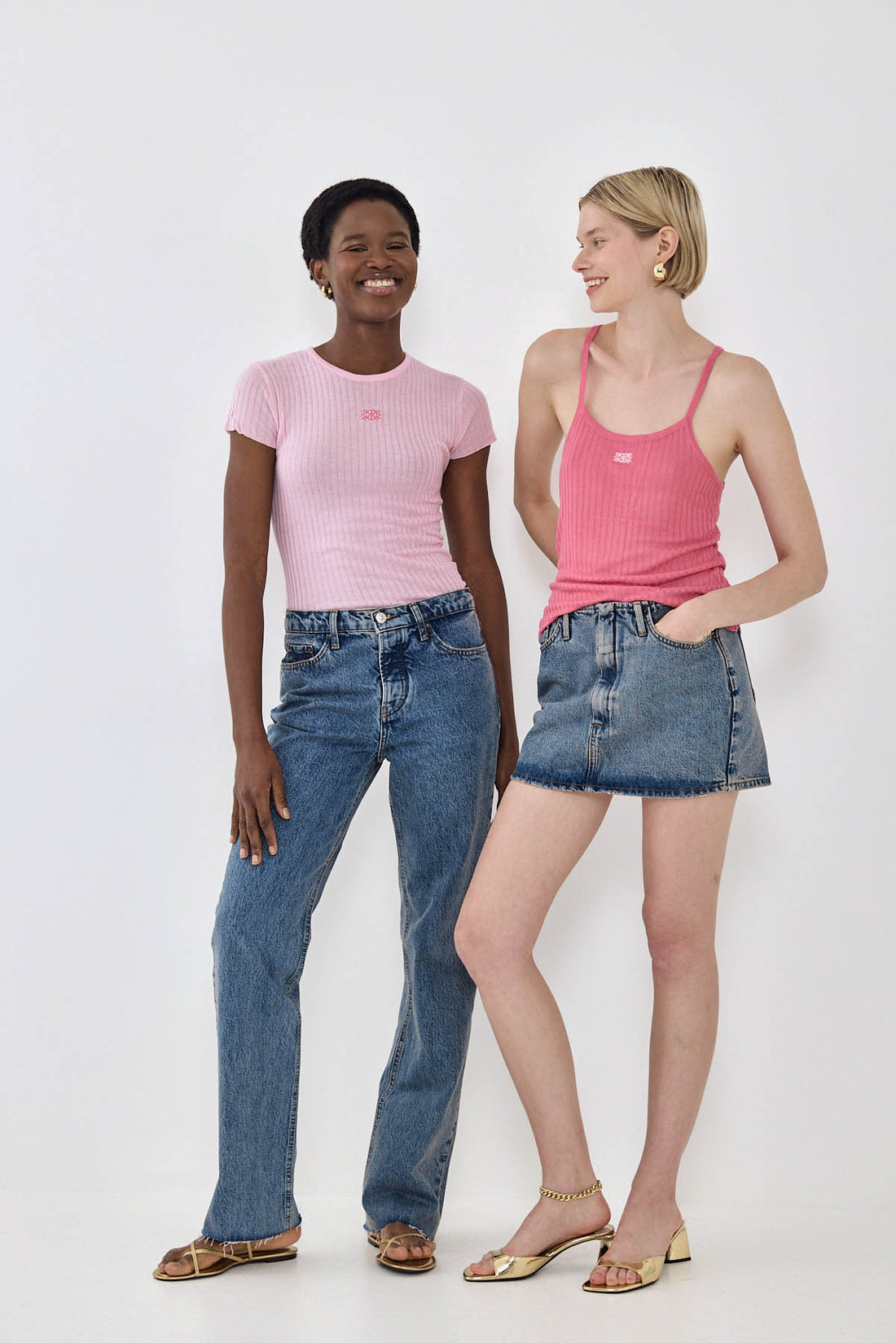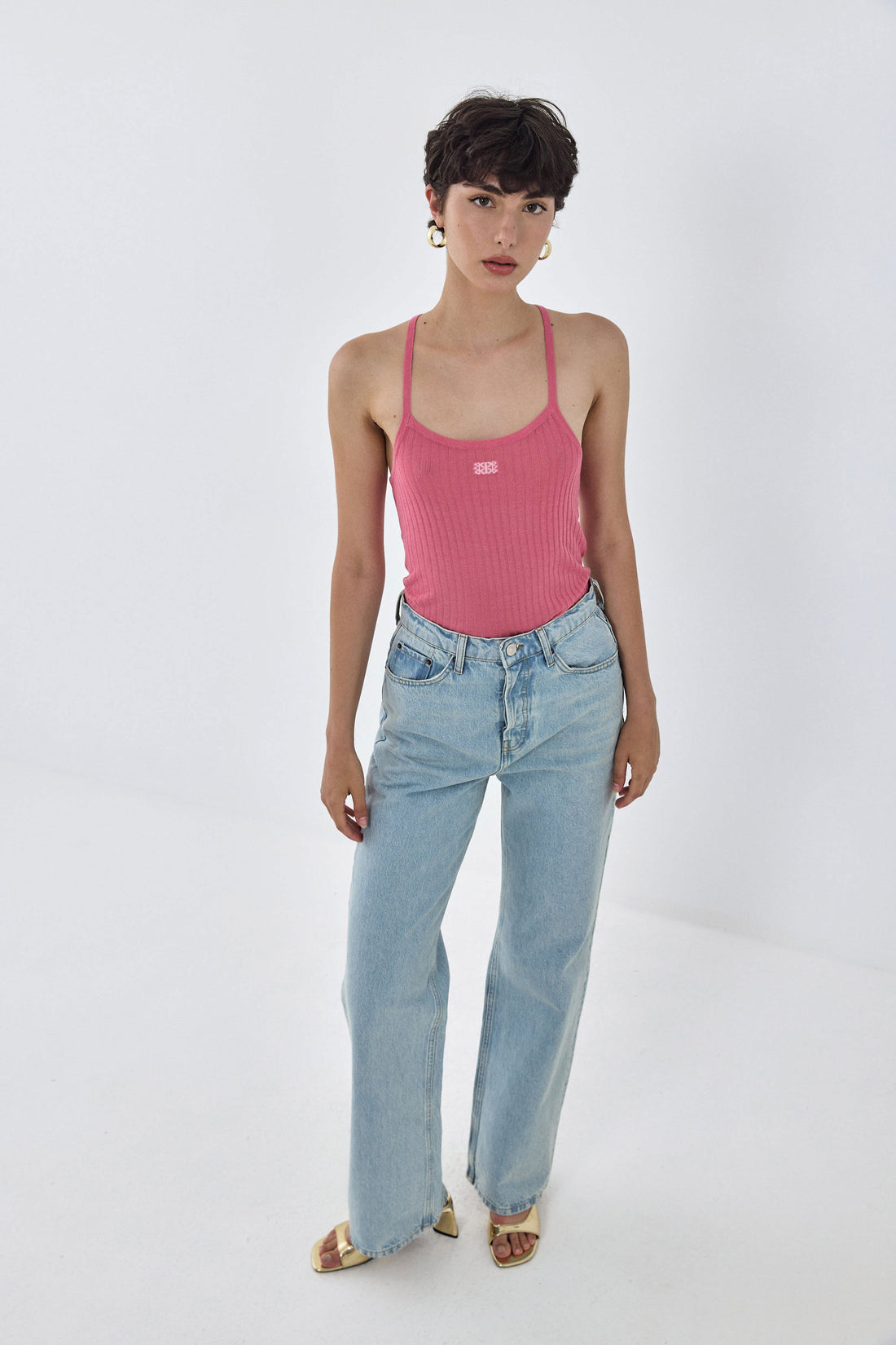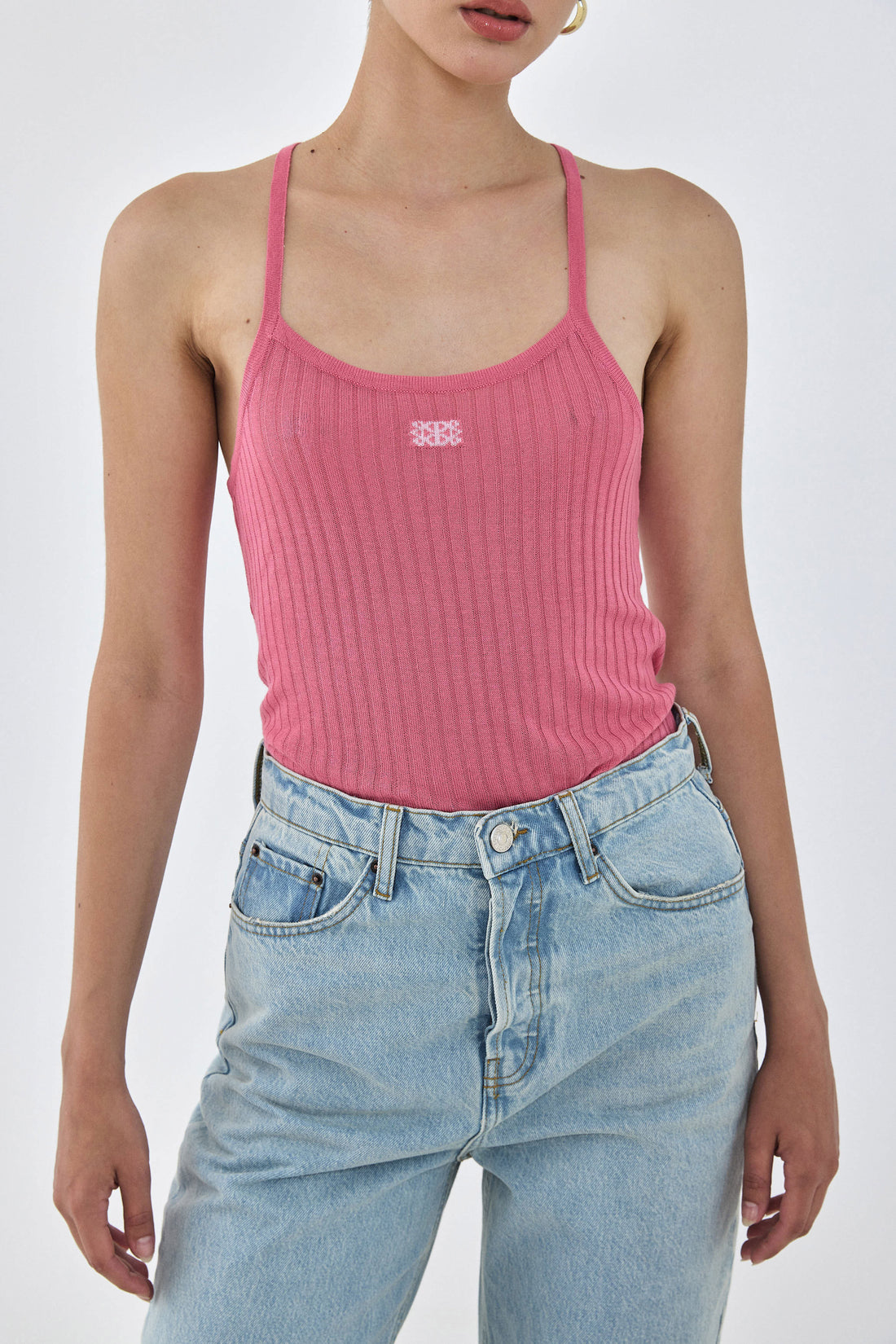 Look no further, this is the most perfect summer tank top you'll ever own. This summer is all about playing with colors and textures. Thin knit straps. Sheer ribbed material. Contrast intarsia logo detailing at the front. Racer style back. Ultra soft material. Style it with the cotton drill maxi skirt, chunky hoops and add a pop of color with a fun heel for the perfect summer look.