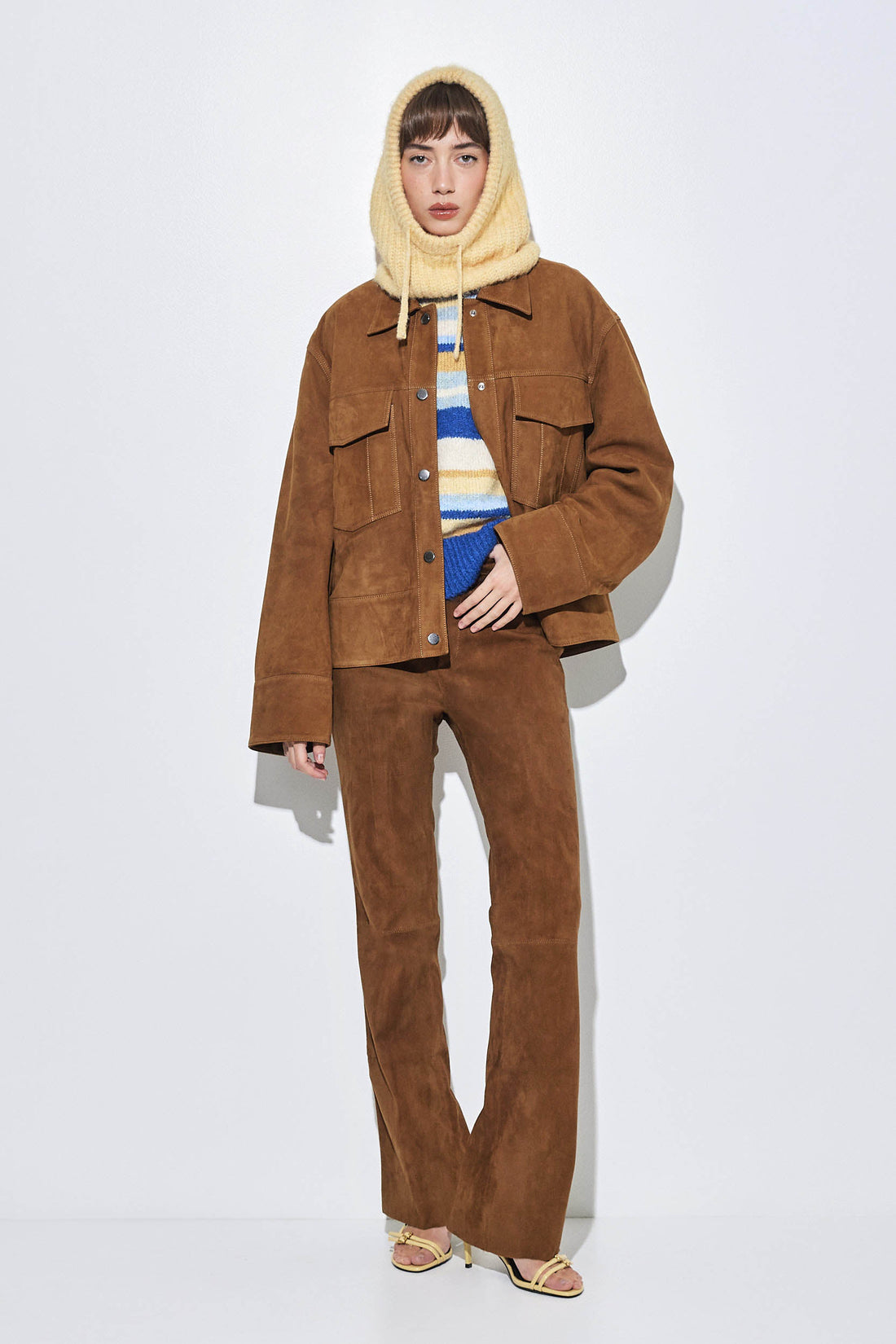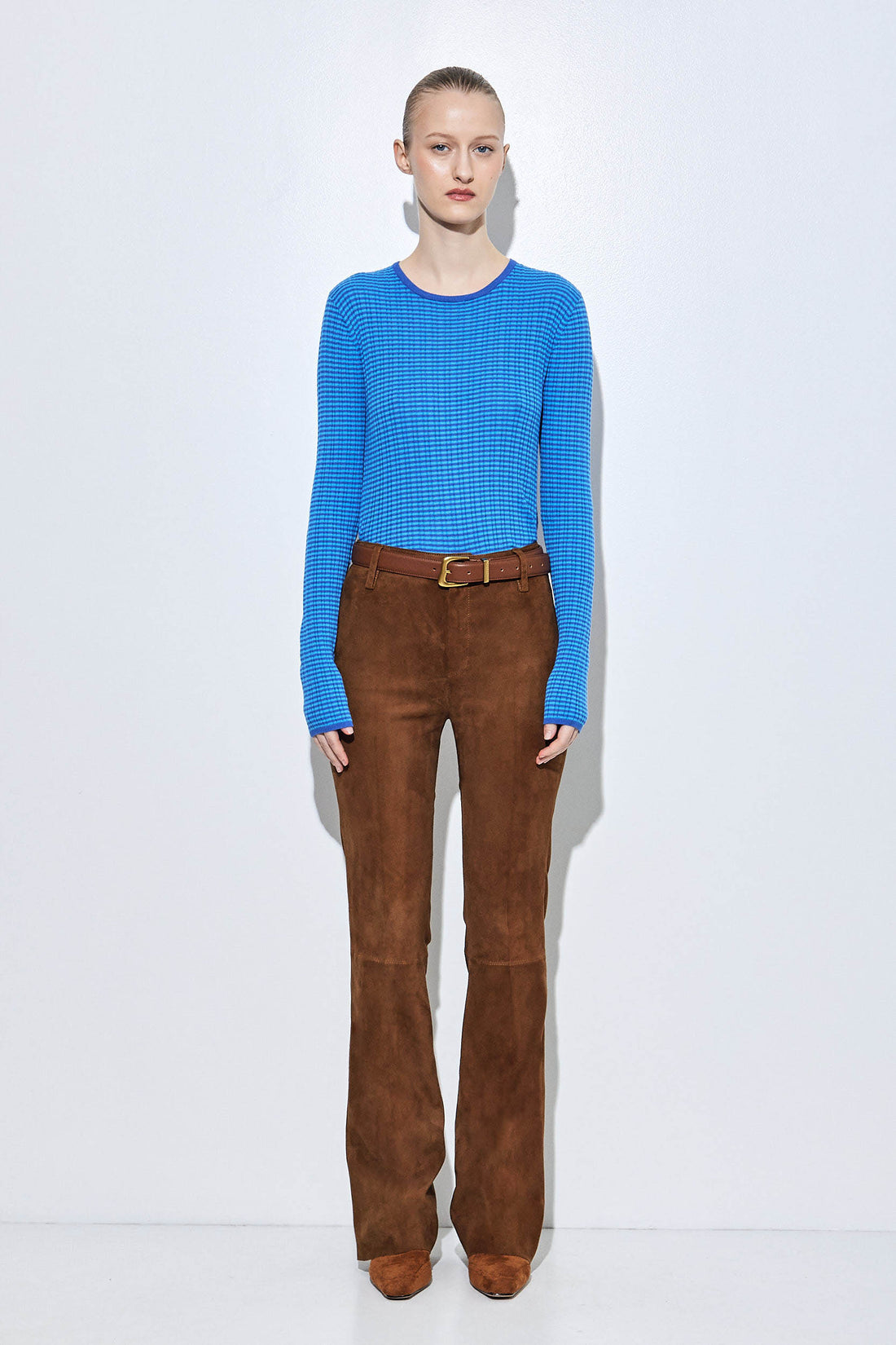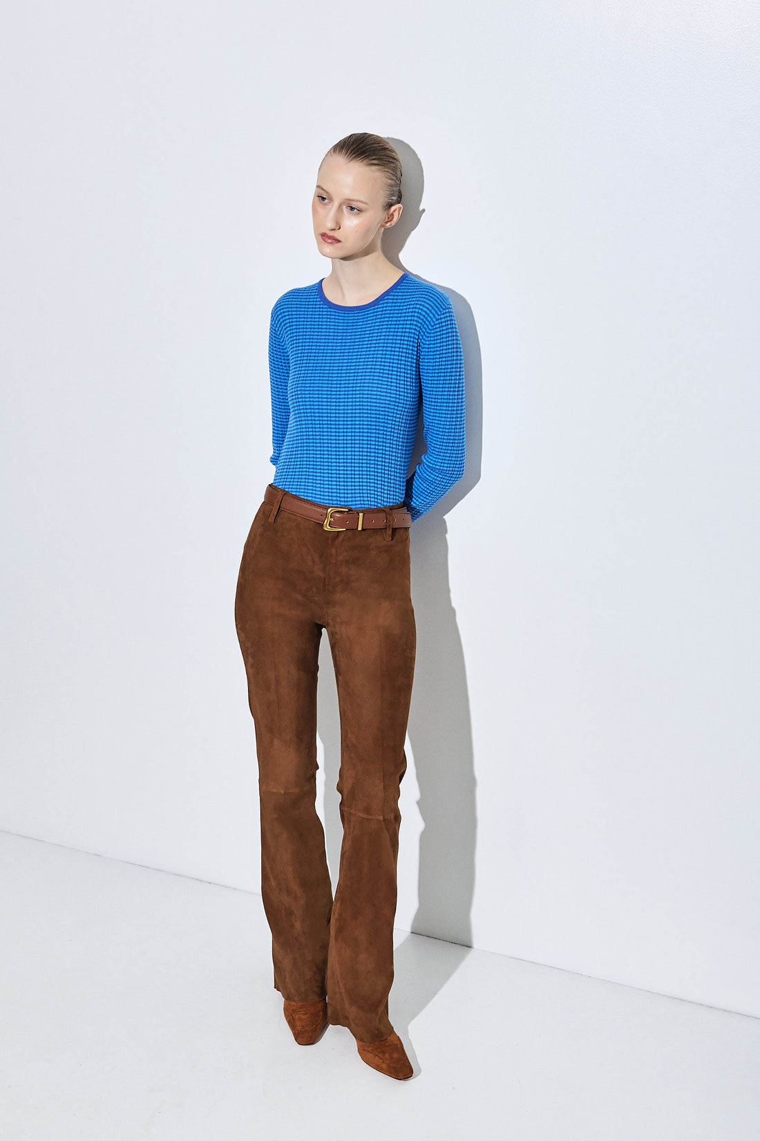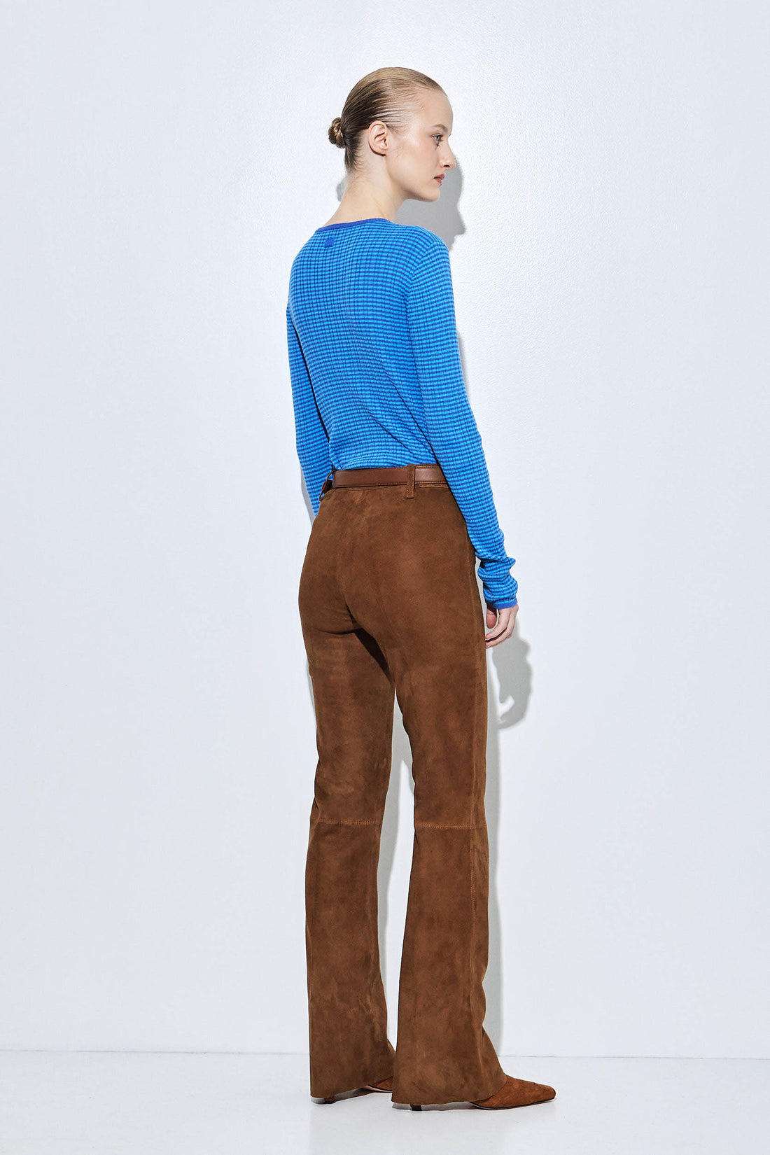 Our new bootcut suede pants are the ultimate suede statement. Mid-waisted with a flattering bootcut silhouette. Crafted from 100% premium suede leather for a soft and luxurious feel. Fine, high-quality stitching. Slightly stretchy. Full length. Metal hook and zipper closure. Raw hem. Unlined. Delicate belt loops. Tonal logo leather patch at the back. Designed to elongate the legs and enhance the silhouette. Style it with our beautiful suede jacket, a lightweight turtle neck and a pair of our oval sunnies for a cool day to night look. Invest once, wear a lifetime.