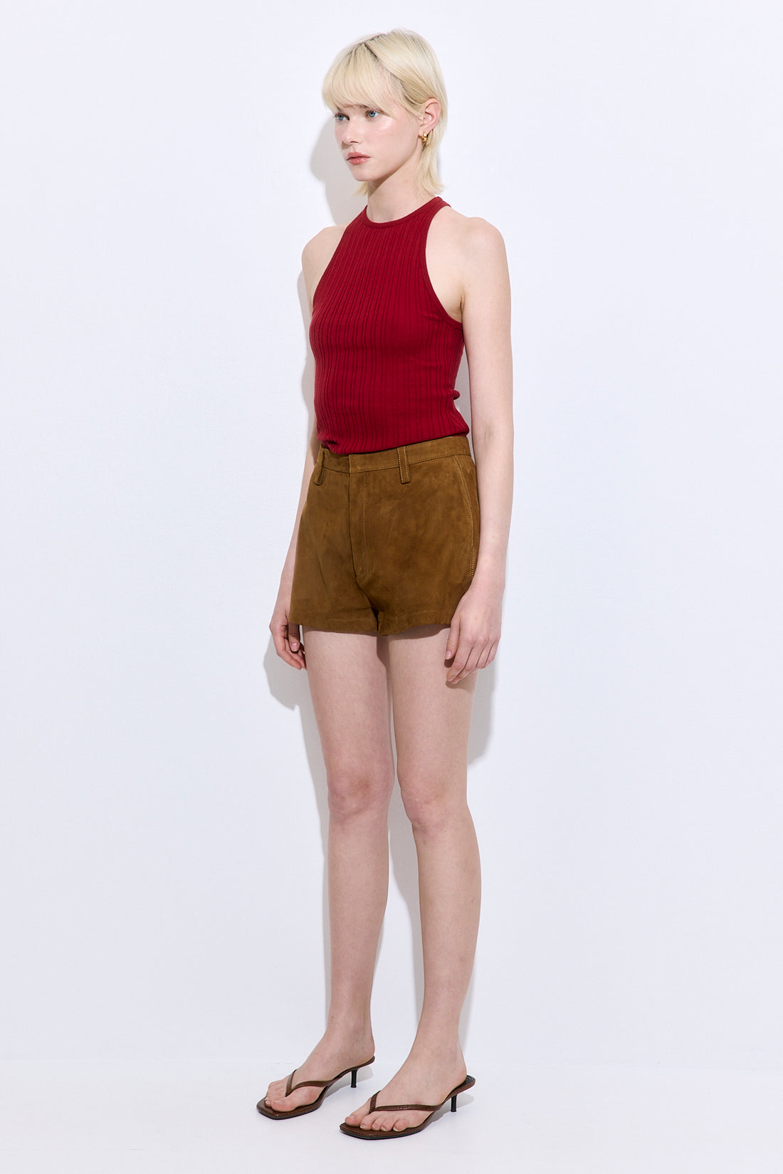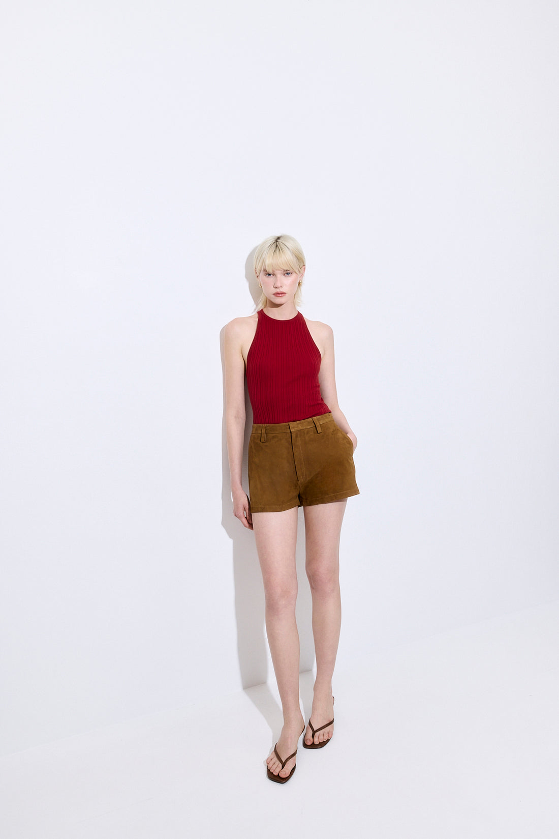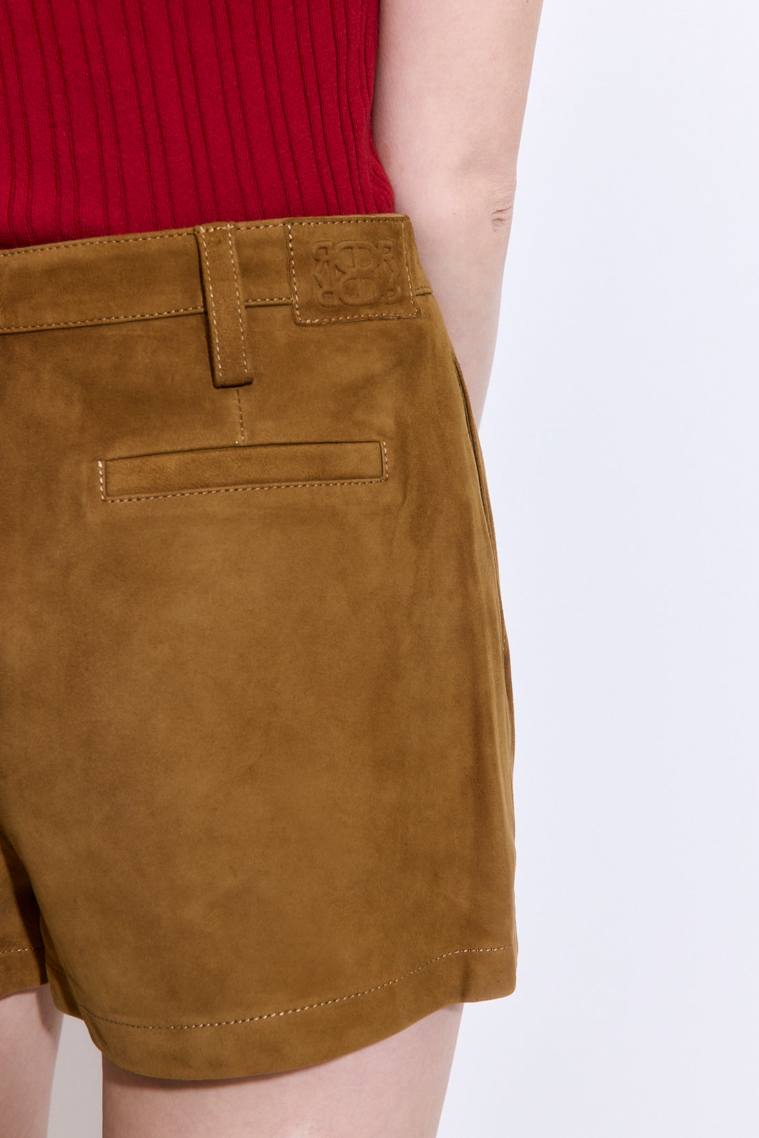 Our new suede shorts are a timeless investment, designed to last a lifetime. Mid waisted. Crafted from 100% premium suede leather for a soft and luxurious feel. Fine, high-quality stitching. Two side pockets. Delicate belt loops. Metal hook and zipper closure. Tonal logo leather patch at the back. Unlined. Two faux back pockets. May stretch up to half a size. Style it with our stunning suede jacket, our heavy cotton striped shirt and our monogram signature scarf for a beautiful and chic look. Invest once, wear a lifetime.