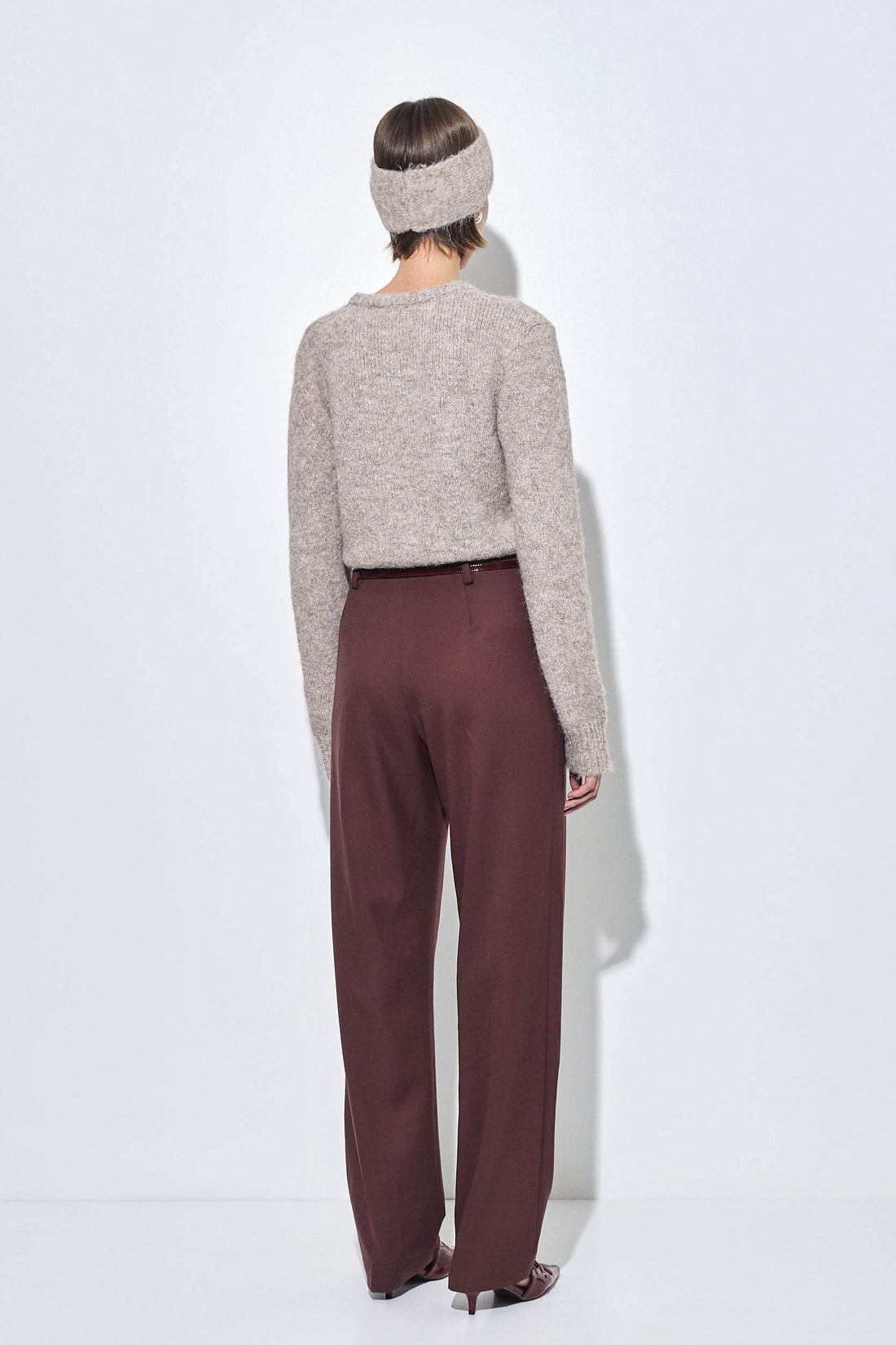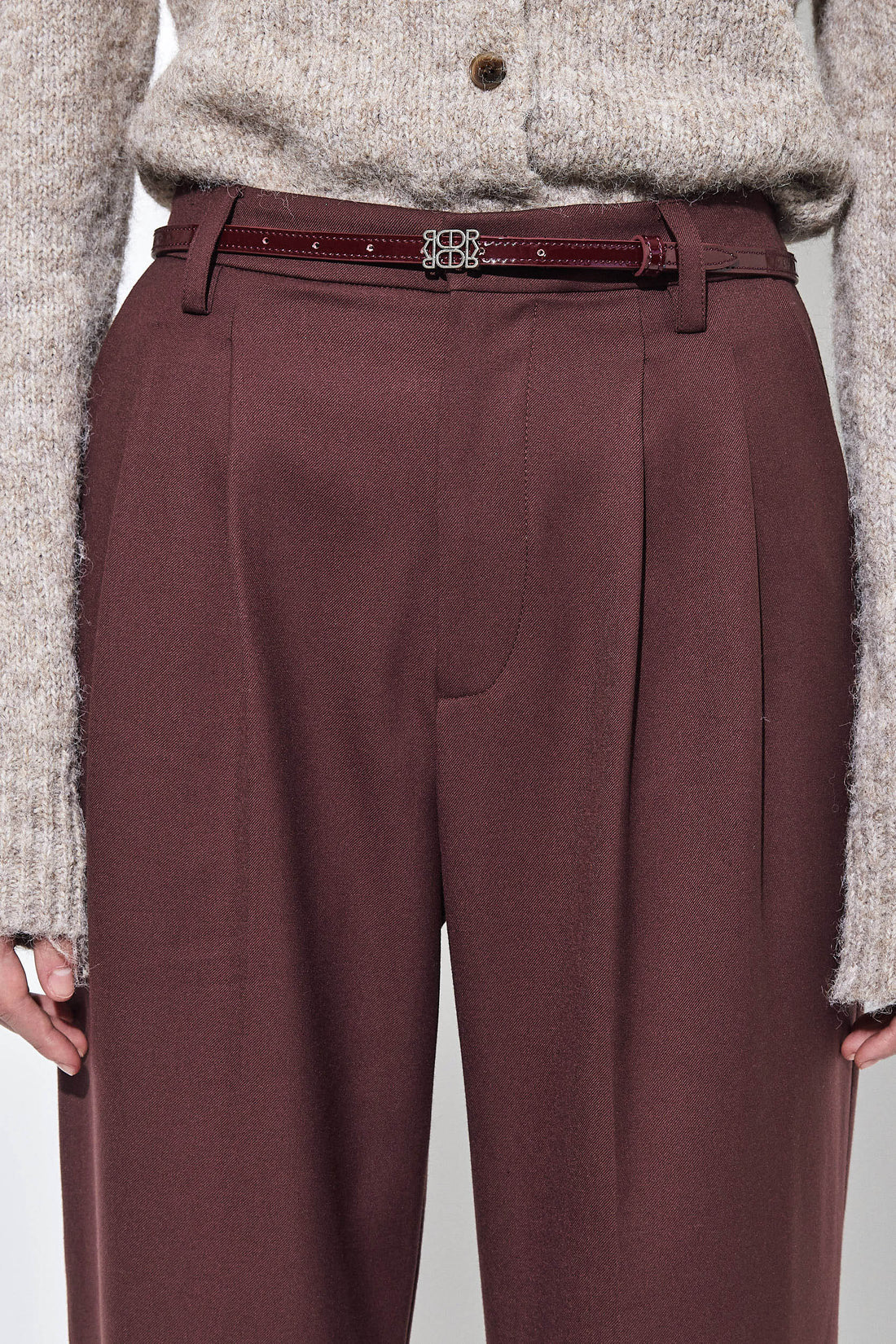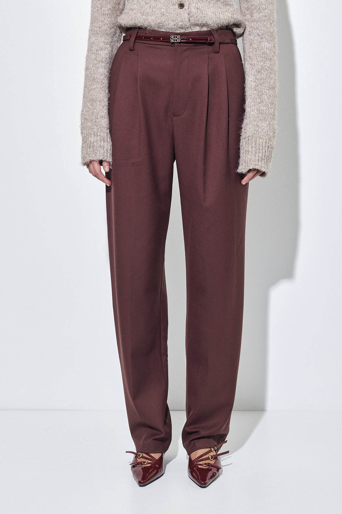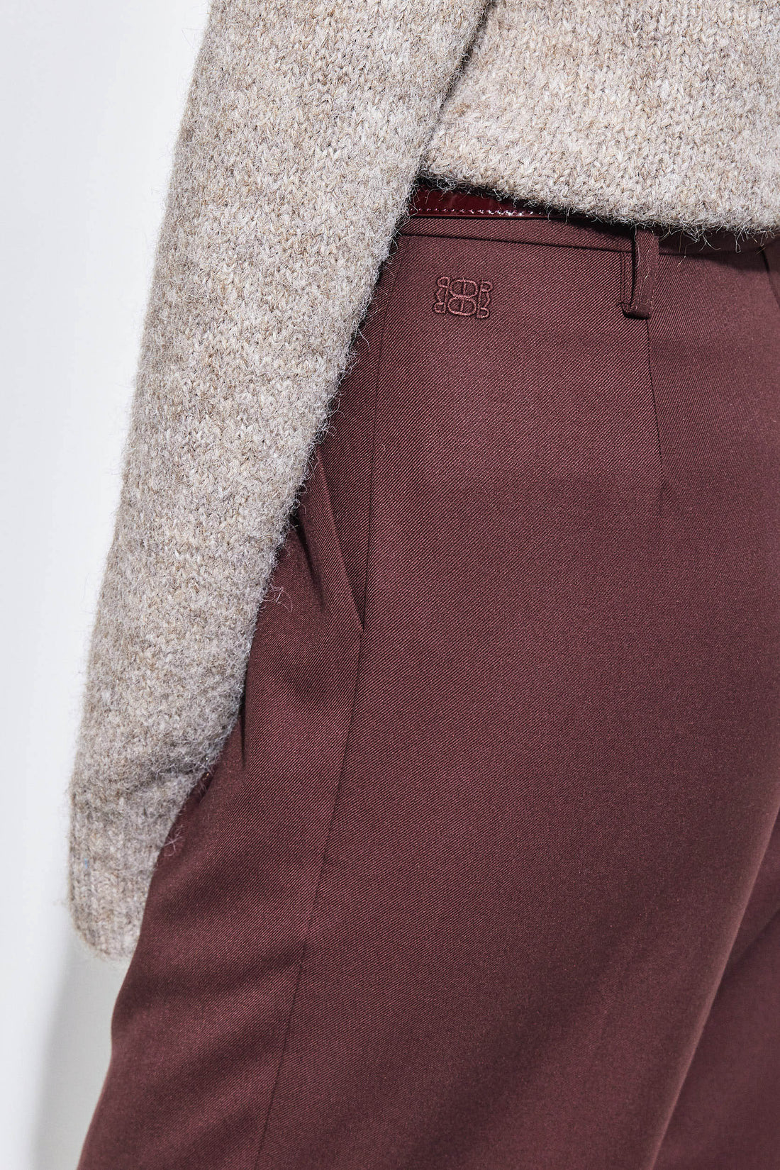 Classic and clean cut tapered daddy pants in a new luxurious tailored fabric. High waisted. Full length. Two side pockets. Tonal embroidered logo detailing at the back. Front zipper and metal hook closure. Unlined. Belt loops. Two front pleats. Style it with a lightweight turtleneck, our Croco belt and top it off with our oversized daddy blazer for the ultimate day to night look.