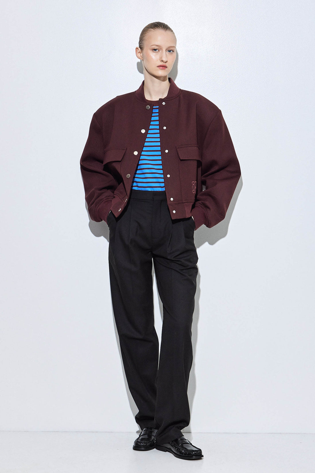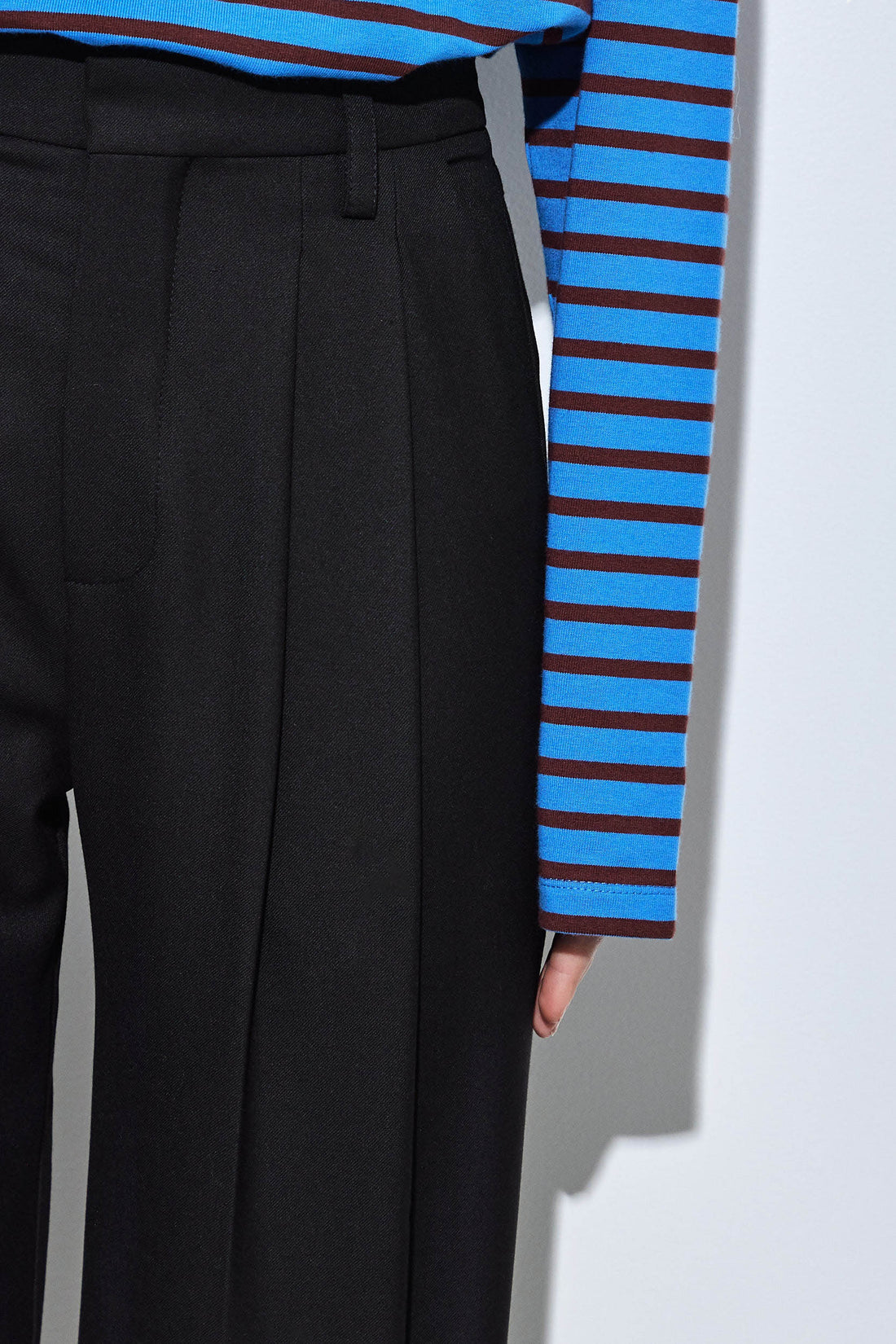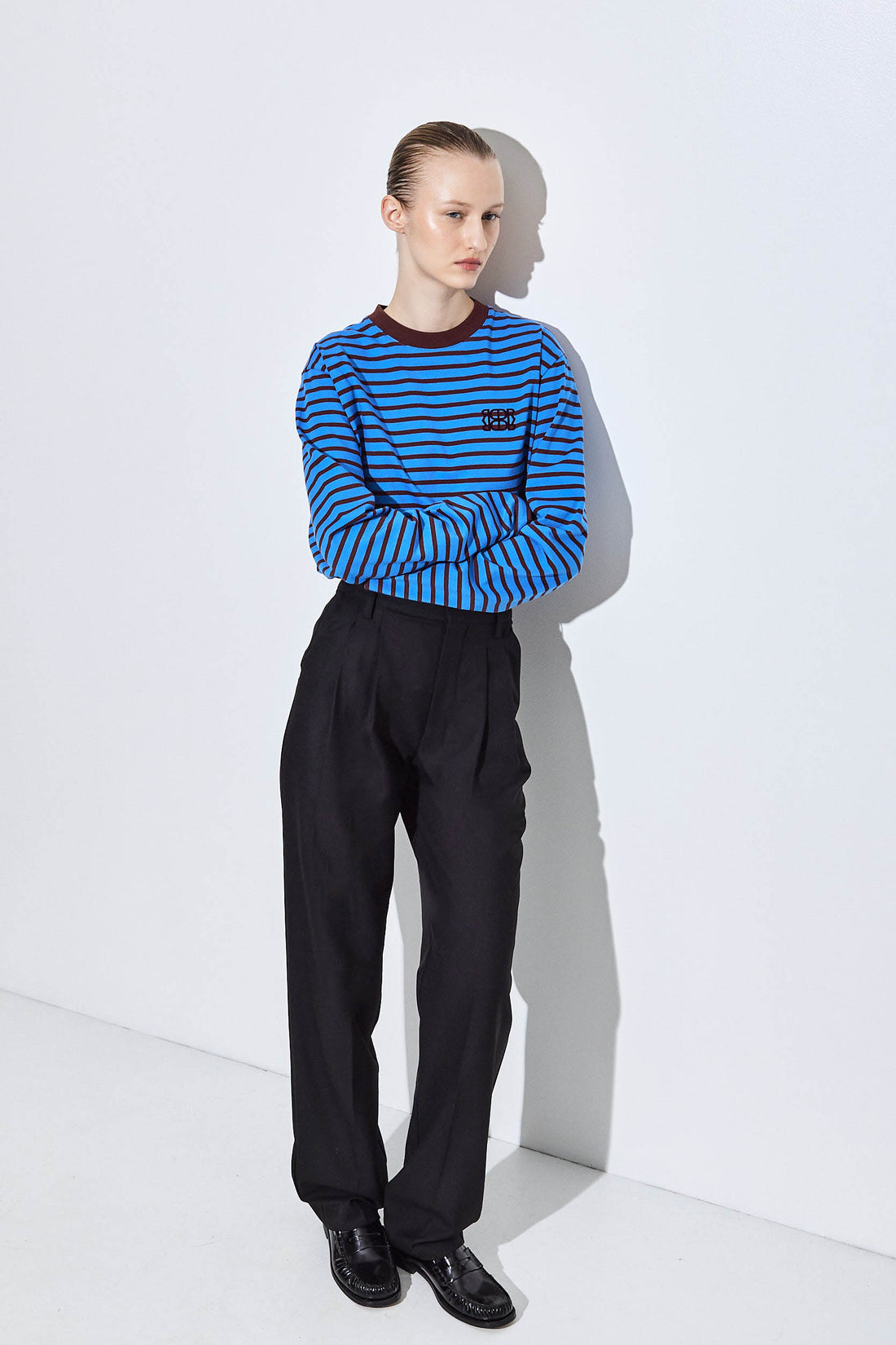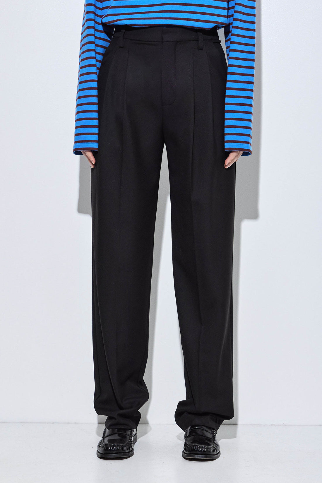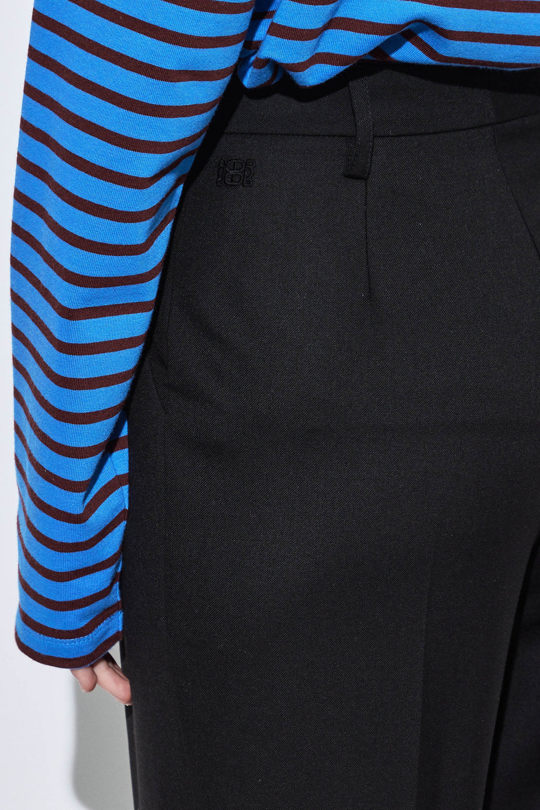 Classic and clean cut tapered daddy pants in a new luxurious tailored fabric. High waisted. Full length. Two side pockets. Tonal embroidered logo detailing at the back. Front zipper and metal hook closure. Unlined. Belt loops. Two front pleats. Style it with a lightweight turtleneck, our Croco belt and top it off with our oversized daddy blazer for the ultimate day to night look.
