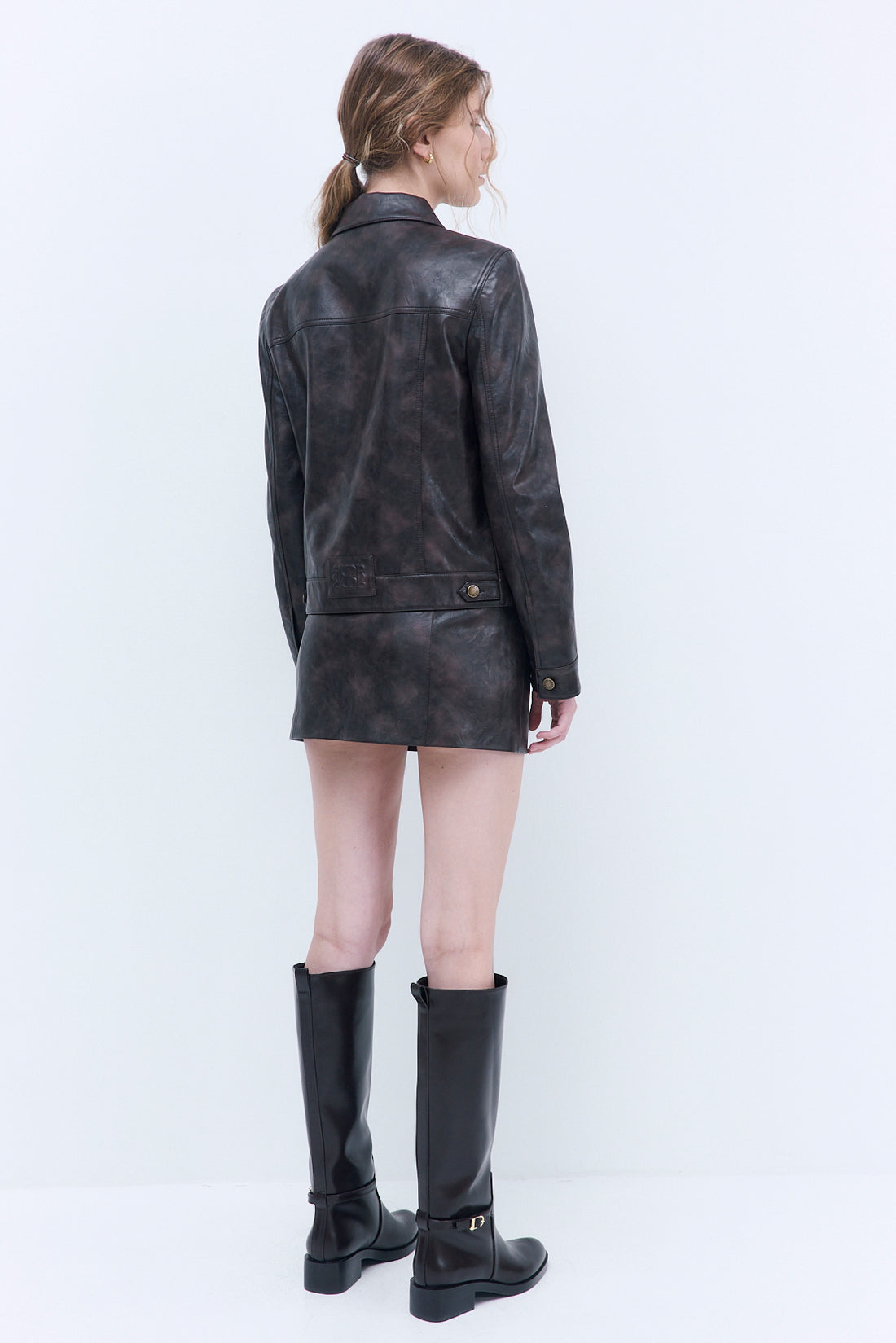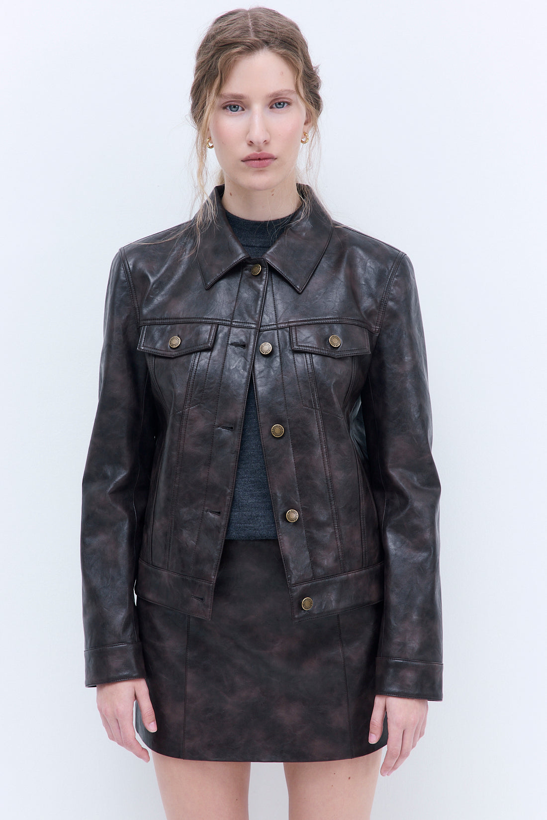 Bold, structured, and undeniably versatile. Vegan leather, denim inspired fitted and cropped jacket. Featuring a subtly cracked texture. Designed with two fake pockets, side welt pockets. Fully lined. Finished with brass buttons and cuffed sleeves. Featuring an embossed logo patch at the bottom back. Back yoke. Style it with our essential Fitted Full Length Pants and our iconic Classic Long Sleeved T shirt for an effortless look.