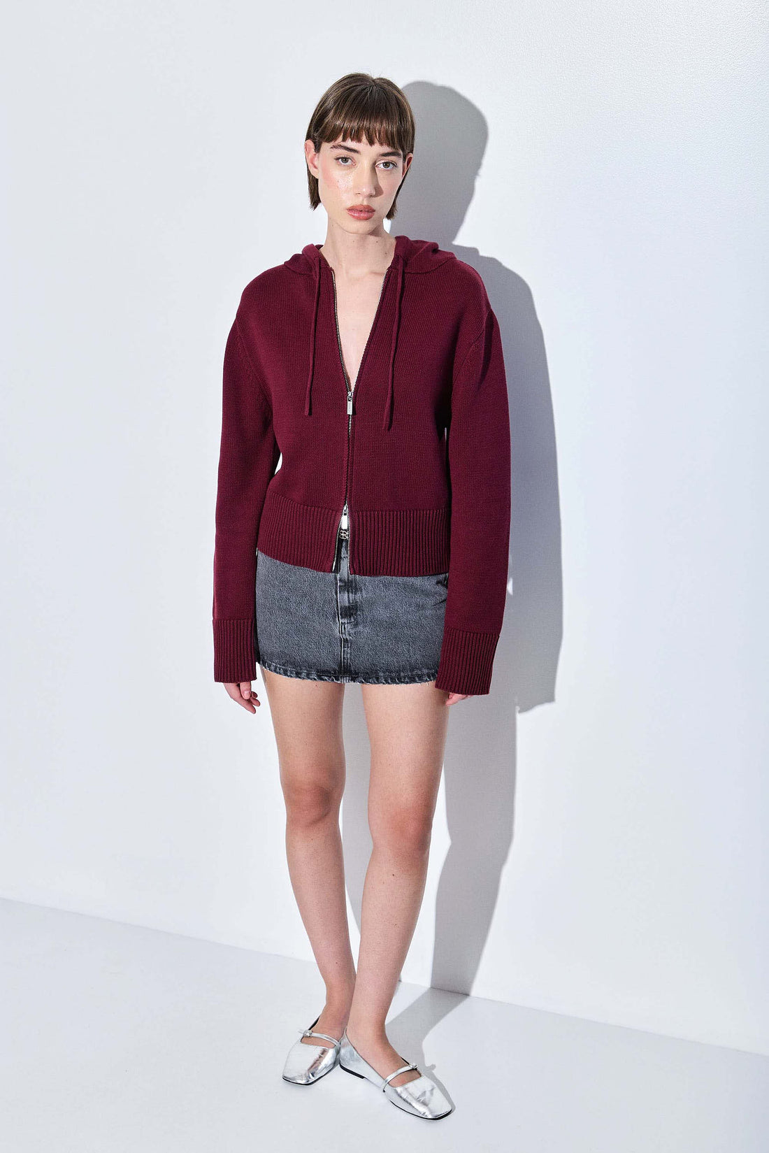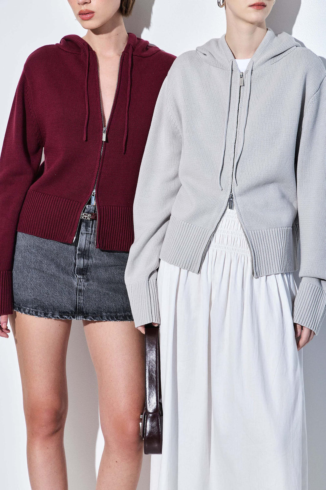 Our new double zipper hoodie is the coolest piece you'll own this season. 100% soft cotton fabric. Embroidered logo metal zipper closure. Ribbed finish. Tonal embroidered logo detailing on the front side. Adjustable strings and a delicate hoodie. Style it with our flattering pair of denim, our lettuce hem socks and throw our classic trench on top for a cool effortless look.