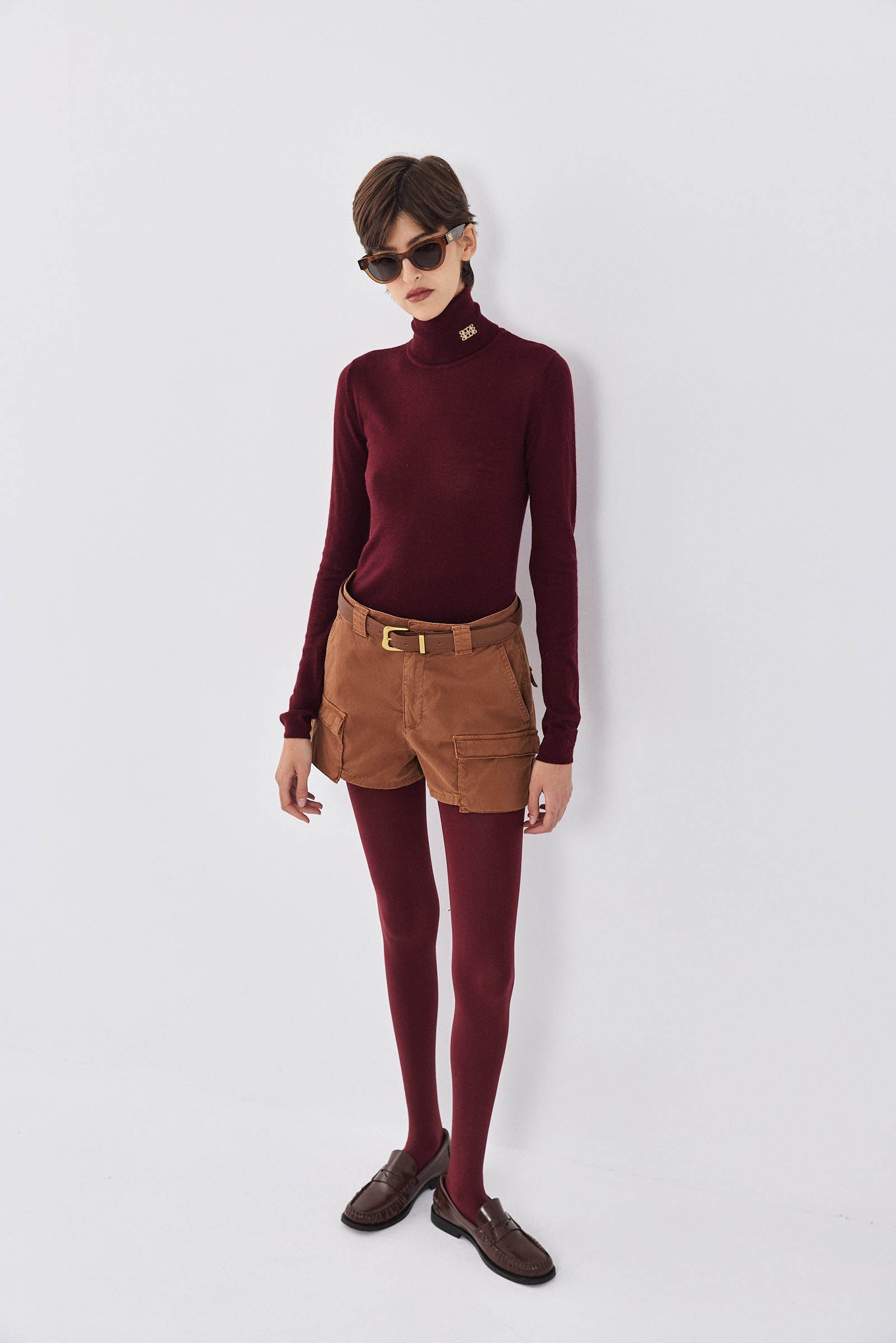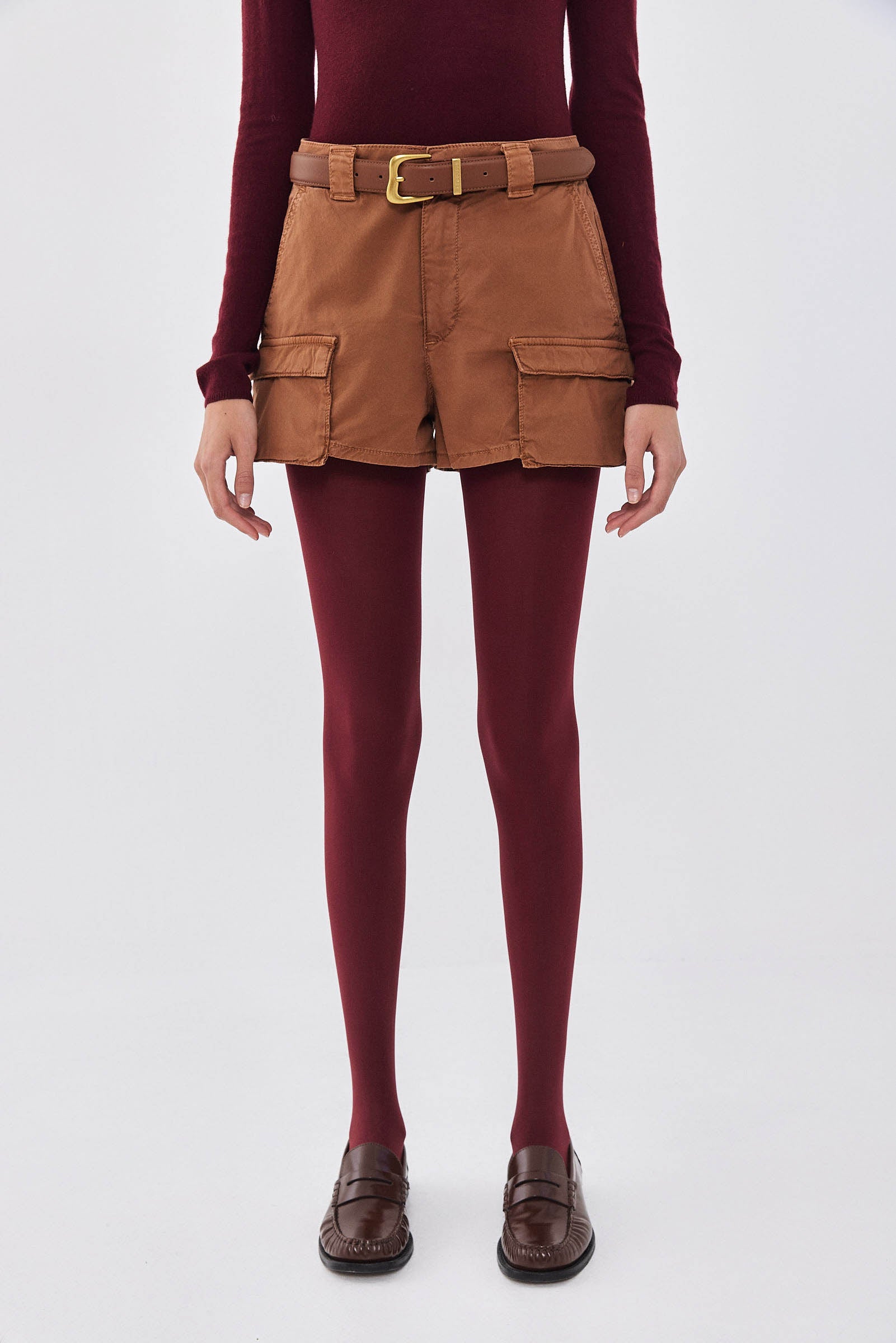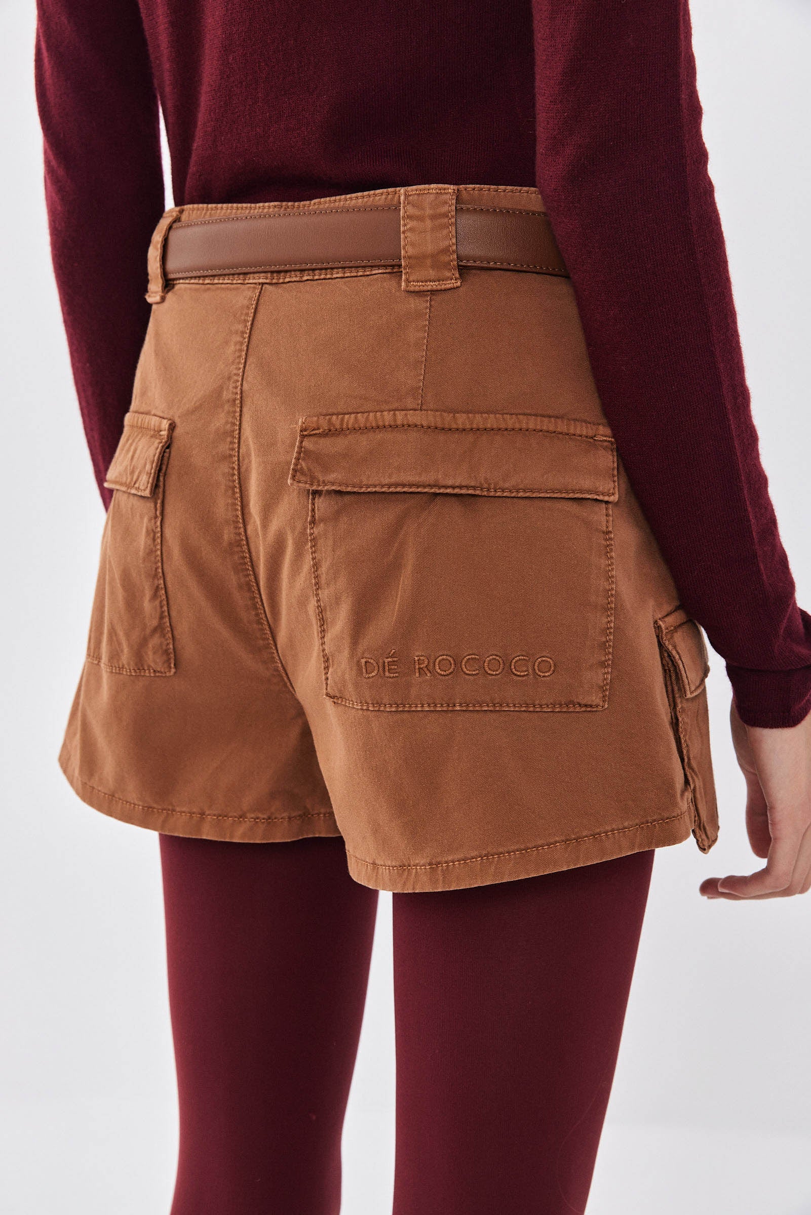 Our new cargo shorts are the ultimate essential this season. Designed with a crisp yet elastic cotton washed fabric, these shorts are just perfect for day to night look. Mid waist. Wide belt loops. Unlined. Front zipper and metal hook closure. Two oversized pockets on the side. Tonal embroidered logo on the back pocket. Style it with our heavy cotton T-shirt, a pair of our ginger brown cat eye sunnies and throw our double-breasted trench on top to seal this gorgeous look.