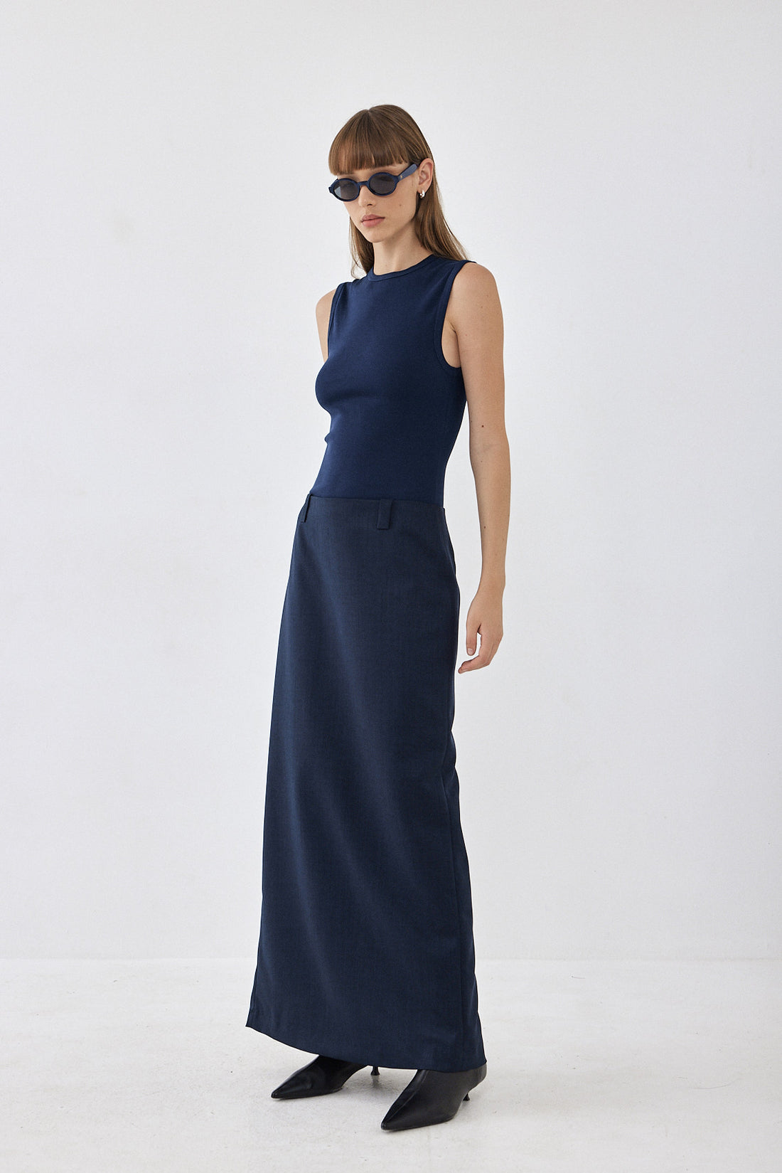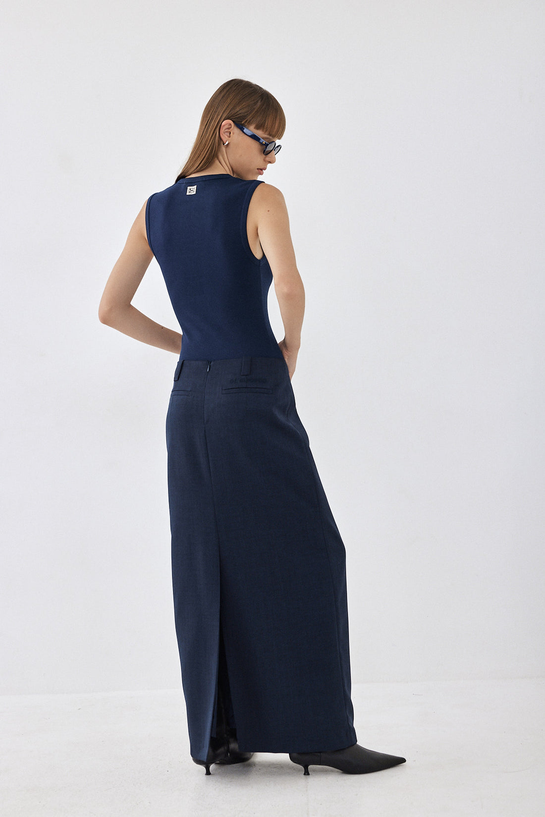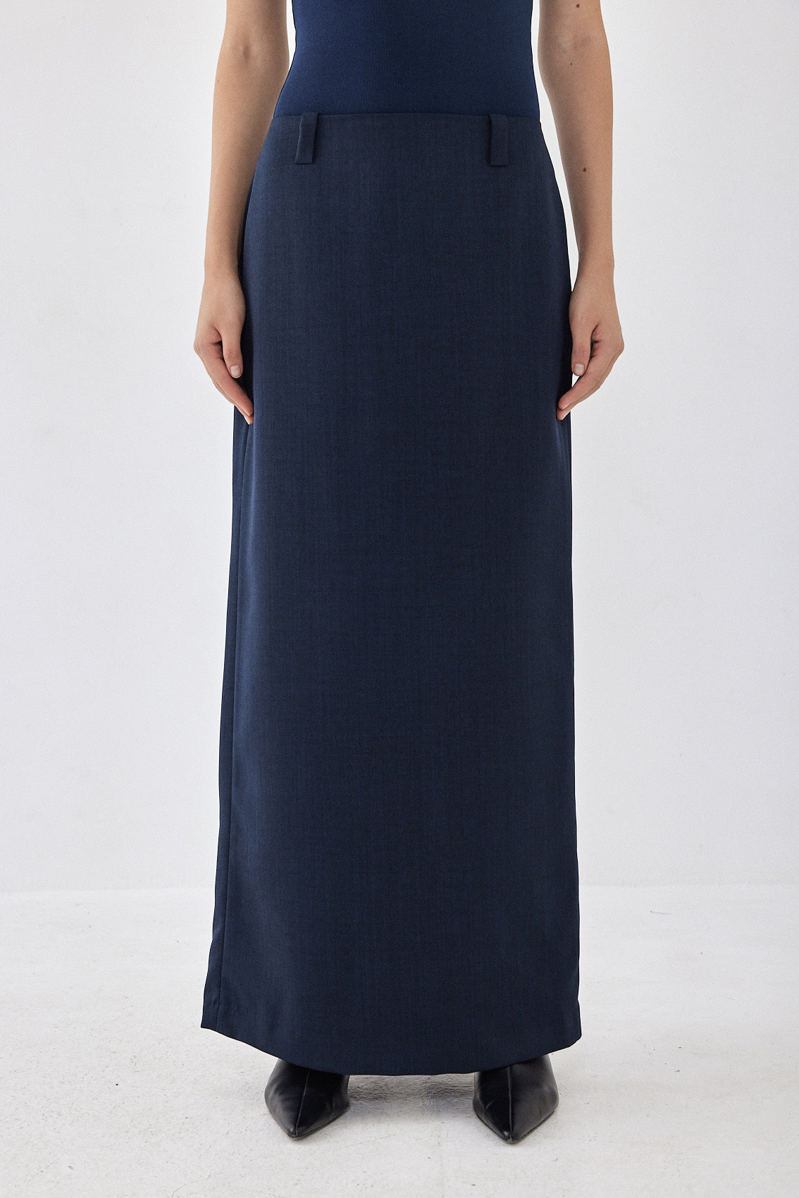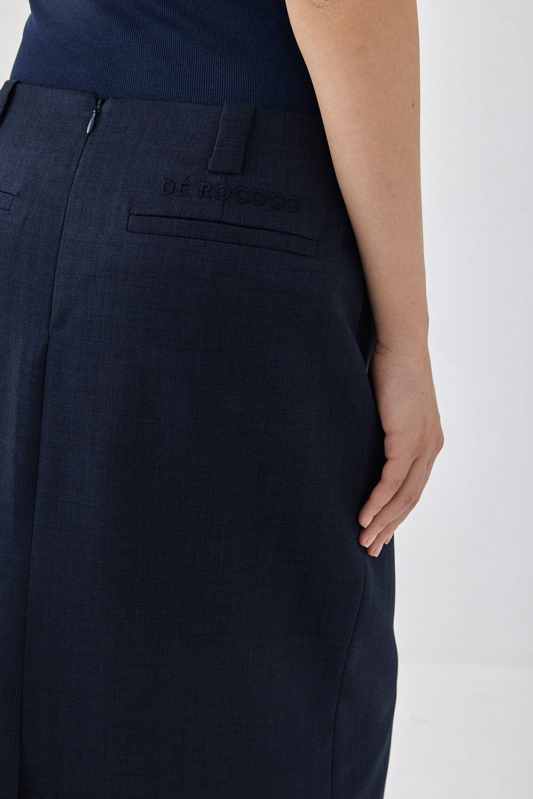 Maxi skirt with a delicate A-line silhouette, a brand new addition to the signature daddy collection. Featuring thick belt loops. Zipper closure at the back. Dé Rococo ton sur ton embroidery at the back. Two faux pockets at the back. Slit at the back. Style it with a matching color top and top it off with the cropped daddy blazer for the perfect day to night look.