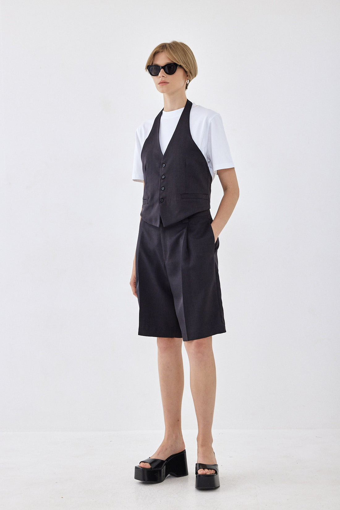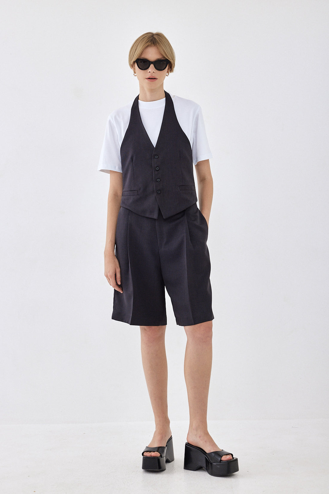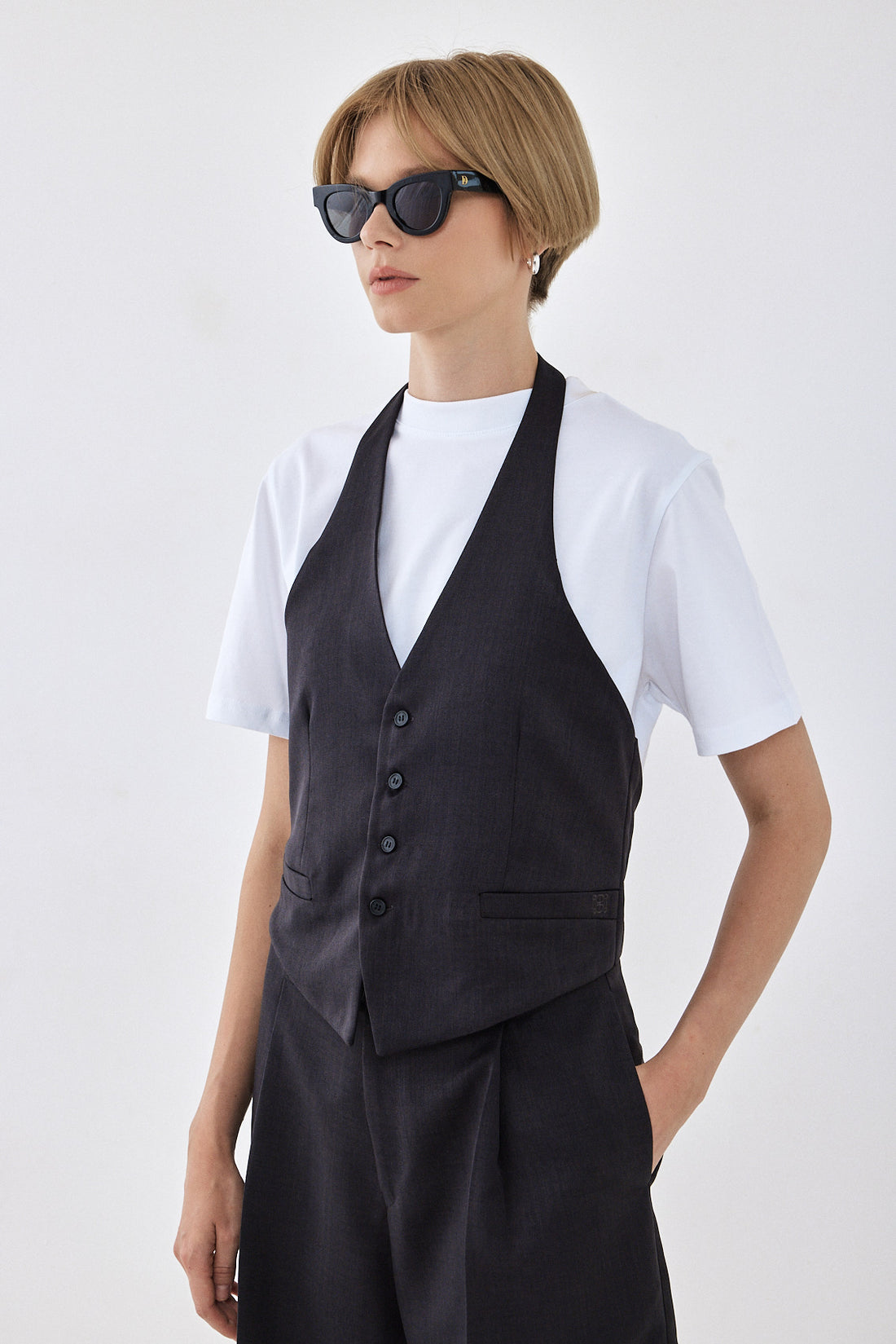 Halterneck style vest with an open back. Front button closure. Front welt pockets. Logo embroidery ton sur ton detail on one of the welt pockets. Style it with your favorite matching color daddy bottom for an effortlessly chic look perfect for day to night.